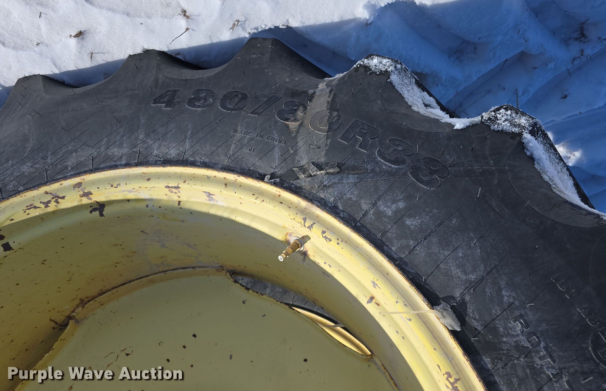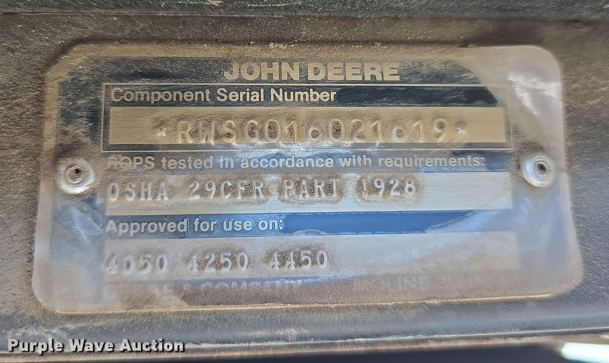 1984 John Deere 4450 tractor. Hours: 413 on meter Actual hours unknown, Serial: RW4450P016164. Engine John Deere 6466TR-16, Serial: RG6466T285227, Cylinders: 6, Fuel type: Diesel. Transmission Powershift, 15F - 4R, Differential lock. Operators station AC, Heat. Features PTO: 540, 1000, Three point Top link, Seven pin outlet, Hydraulic remote sets Rear: 3, Suitcase weights: 10. Tires Front: 10.00-16SL, Rear: 480/80R38, Wheelbase: 102", Duals. Notes Hour meter exceeds mechanical limits, Load monitor not included. Knabe Farms. Nehawka, NE 68413