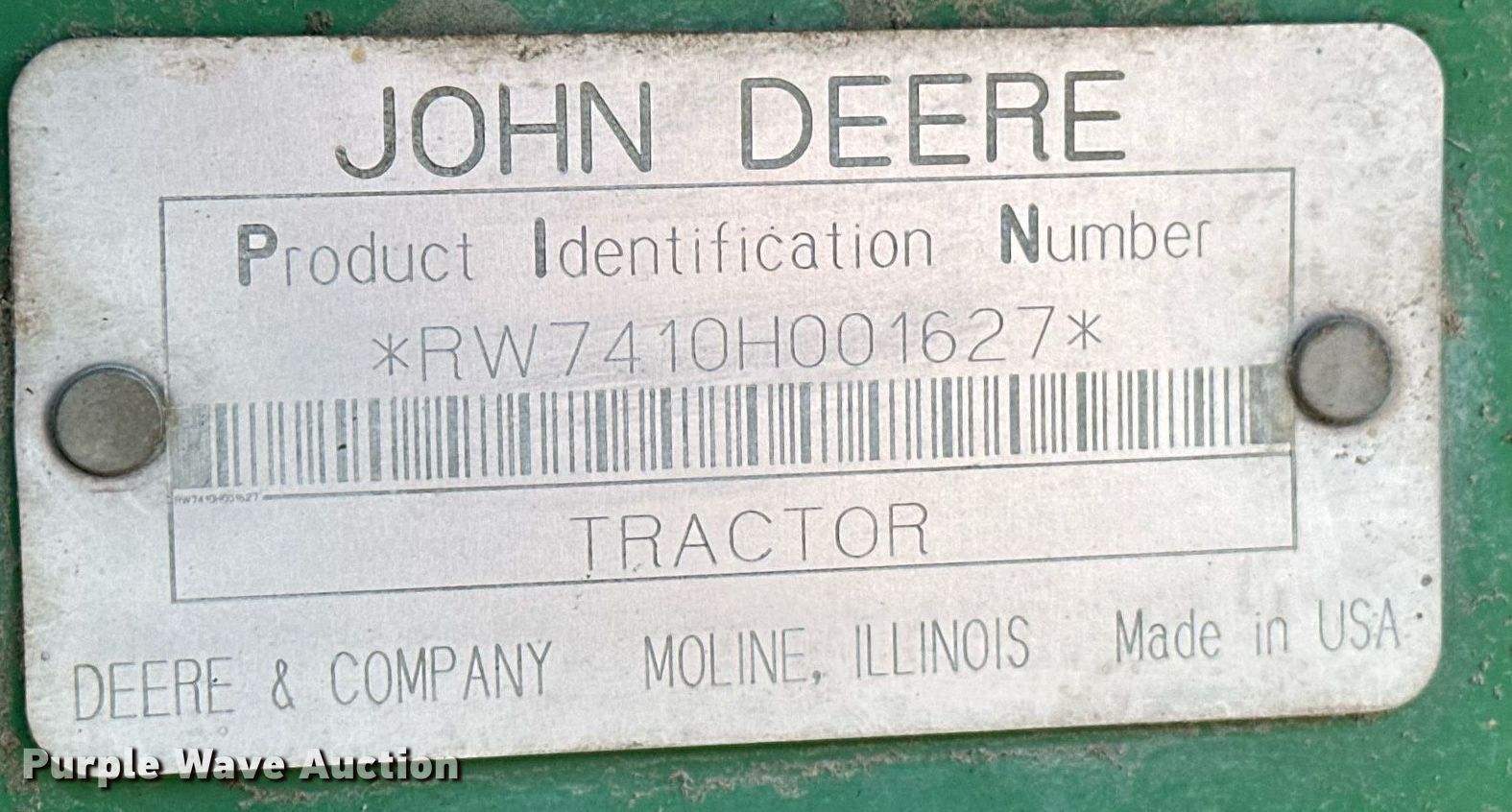 Purple Wave is selling a used Tractor in Oklahoma. This item is a 1997 John Deere 7410 tractor with the following: Hours: 6048 on meter, Serial: RW7410H001627, Insurance salvage unit claim #: 4-818803
