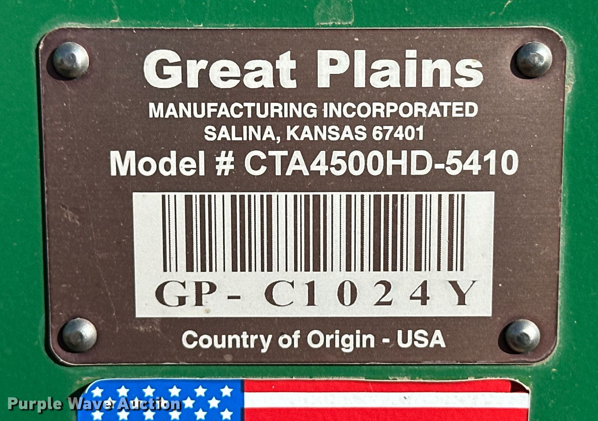 Purple Wave is selling a used Air Seeder in Texas. This item is a 2020 Great Plains CTA4500HD air seeder with the following: Width: 45', Row units: 54, Row spacing: 10", Serial: GP-C1024Y