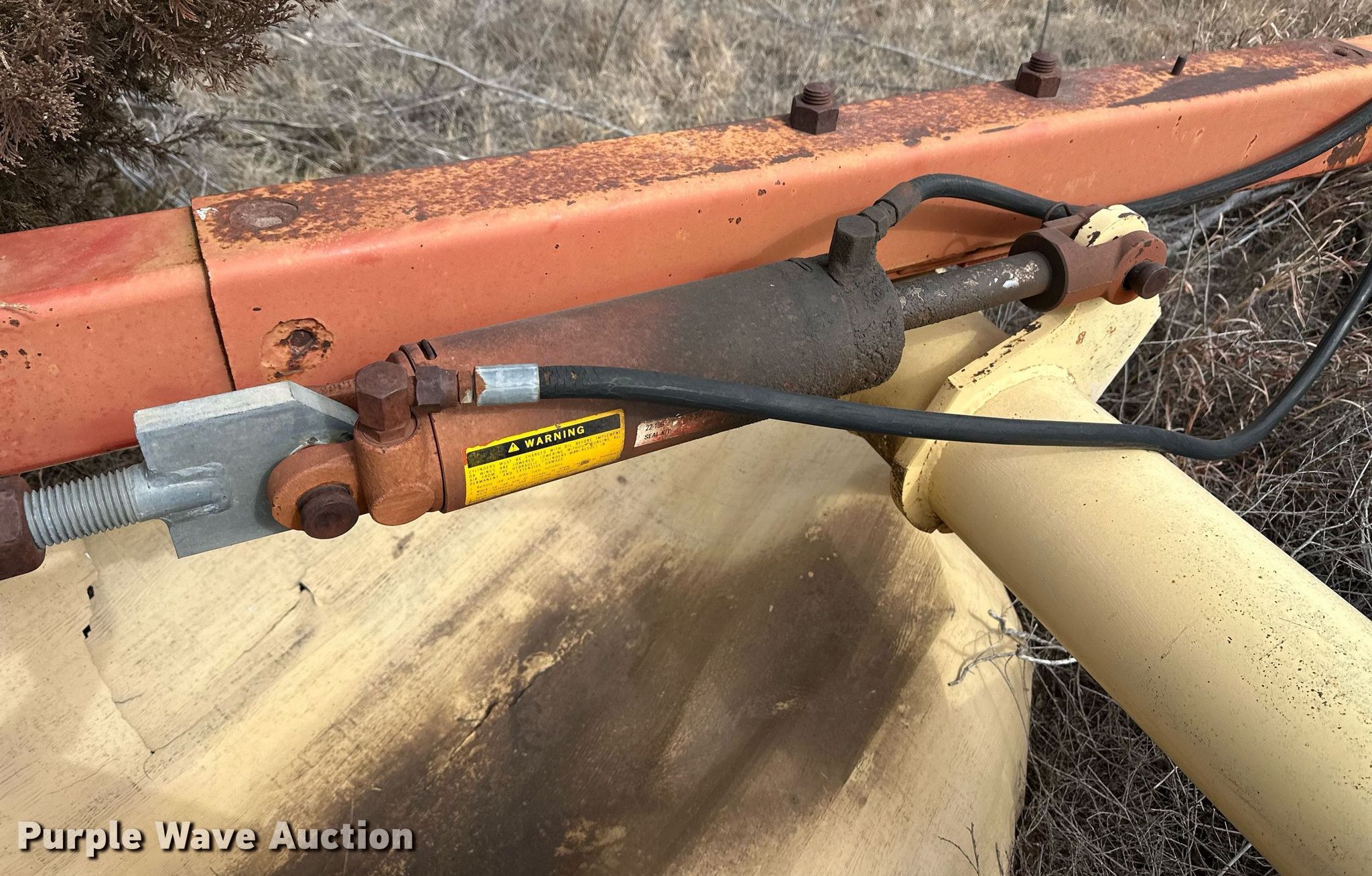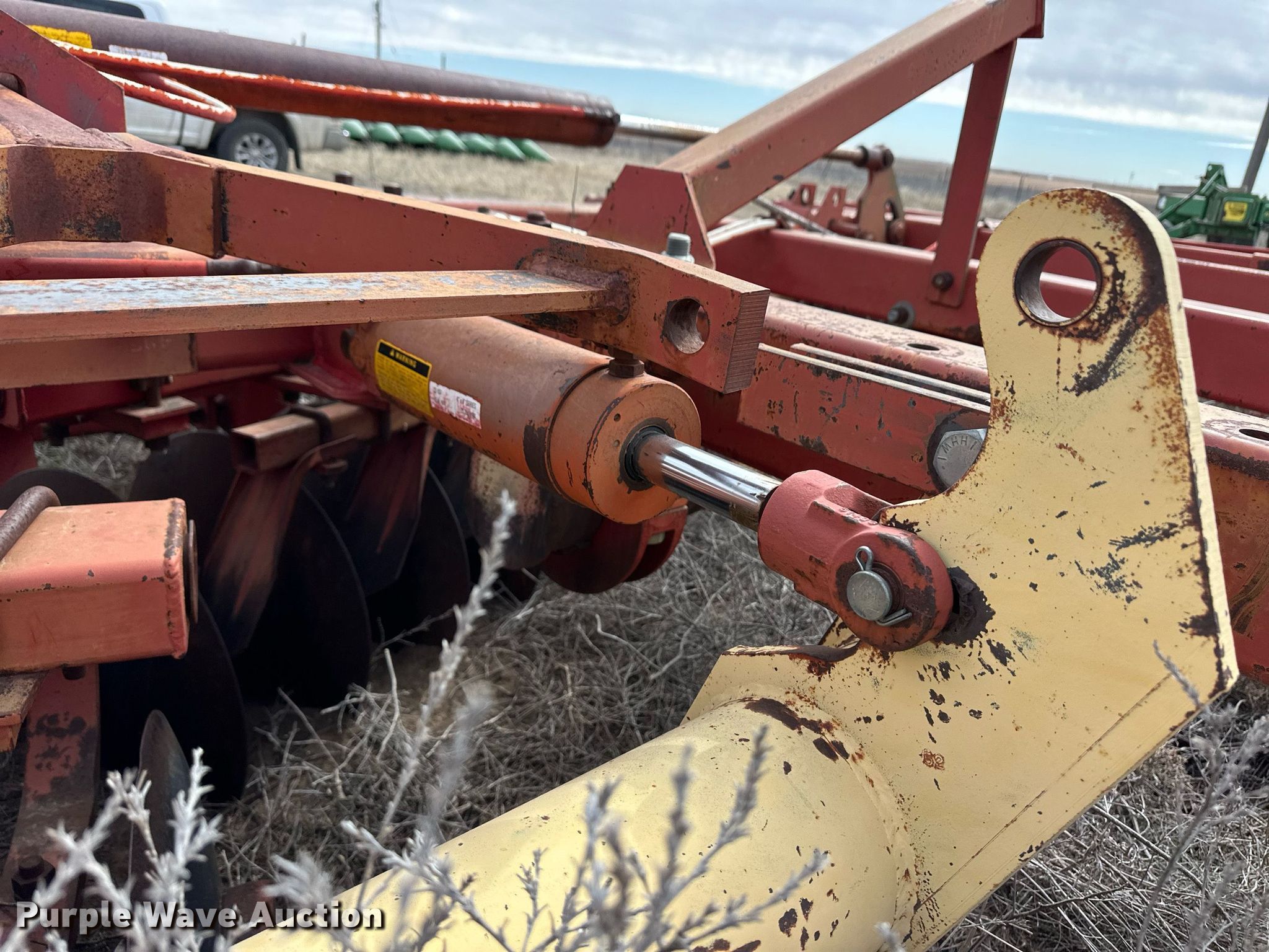 Sunflower 4956 tandem disk. Overall width: 28', Serial: 1115. Features Front blades Diameter: 18", Spacing: 9", Rear blades Diameter: 18", Spacing: 9", Disk scrapers, Operation Hydraulic lift, Hydraulic fold, Leveler: Hydraulic. Notes Tires missing. Morse, TX 79062