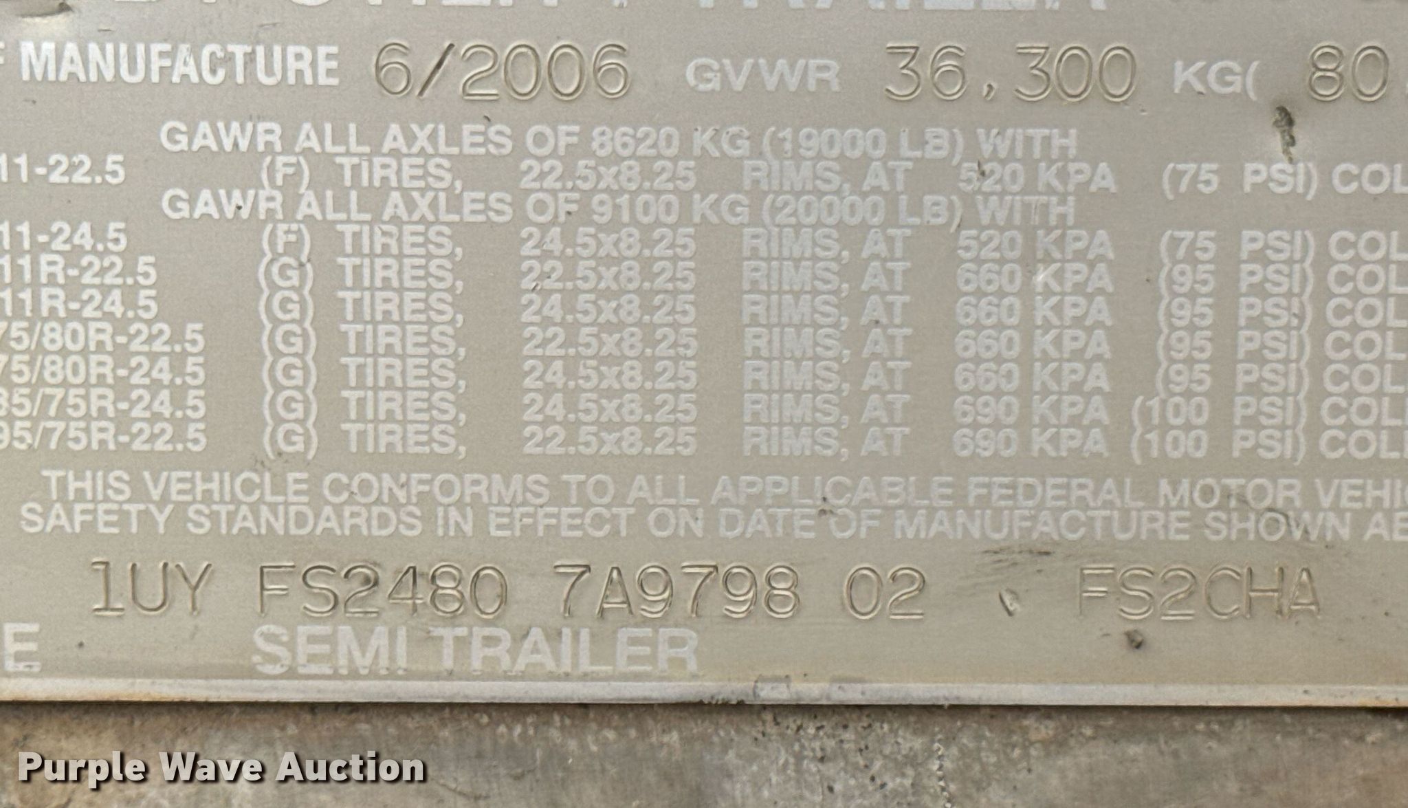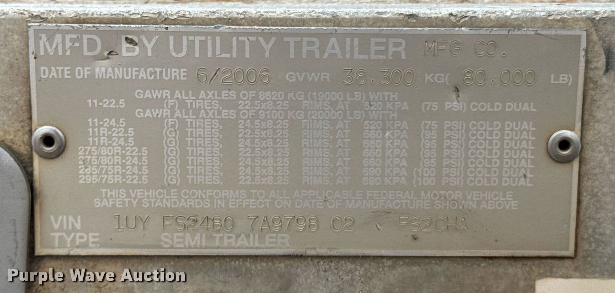 2007 Utility Trailers flatbed trailer. VIN: 1UYFS24807A979802. Dimensions Overall: 48' L x 102" W. Features Deck type: Aluminum. Chassis Landing gear: Dual, Suspension: Air, Brakes: Air, Axles: Spread, GVWR: 80,000 lbs. Tires Aluminum wheels, Size: 285/75R24.5. Notes Deck boards damaged. Oklahoma title. Title distribution may be delayed up to 30 days from verification of funds. Two State Sod LLC. Spiro, OK 74959