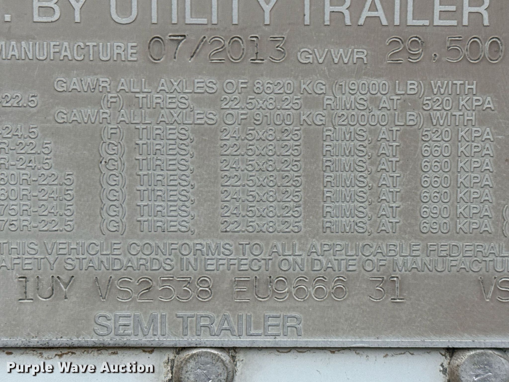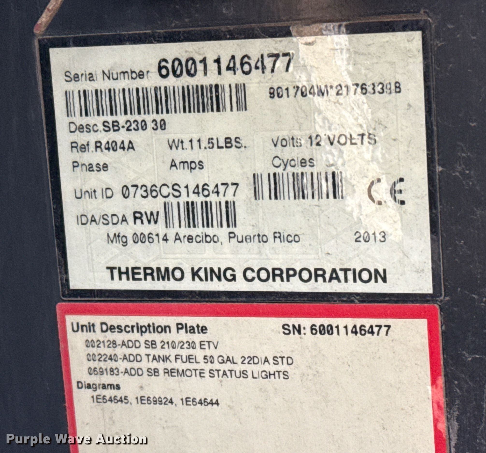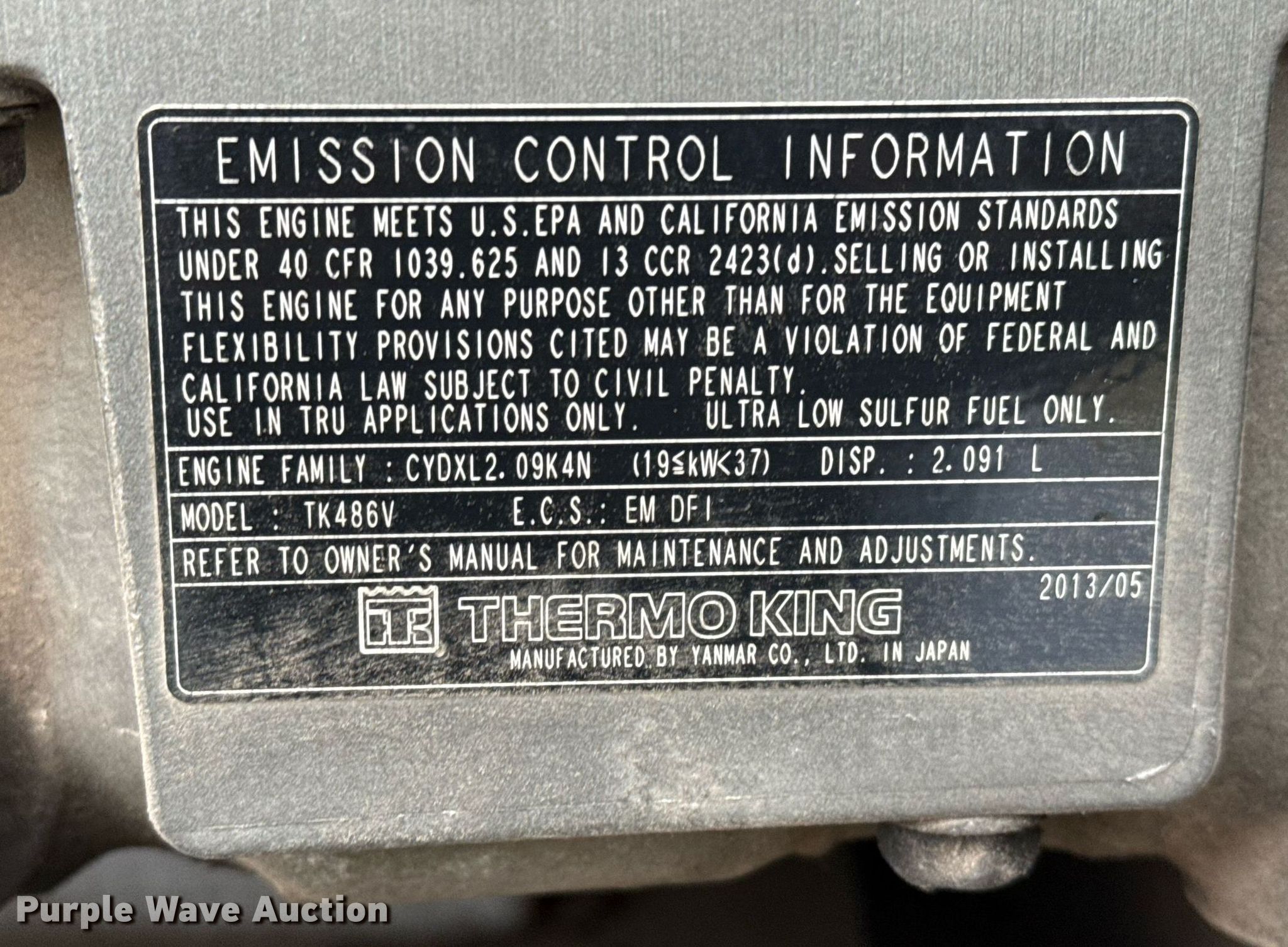 2014 Utility Trailers VS2RA refrigerated van trailer. VIN: 1UYVS2538EU966631, Unit #: L405. Dimensions Overall: 53' L x 102" W, Rear door / ramp Width: 98". Features Deck type: Aluminum, E-track rail system, Refrigeration unit Thermo King, Serial: 6001146477. Chassis Landing gear: Dual, Suspension: Air, Brakes: Air, Axles: Tandem Sliding, GVWR: 6,500 lbs, GAWR: 19,000 lbs. Tires Aluminum wheels, Size: 295/75R22.5. Texas title. Title has a lien that will be released following the close of the auction. Title distribution may be delayed up to 30 days from verification of funds. River Road Aggregates. San Angelo, TX 76903