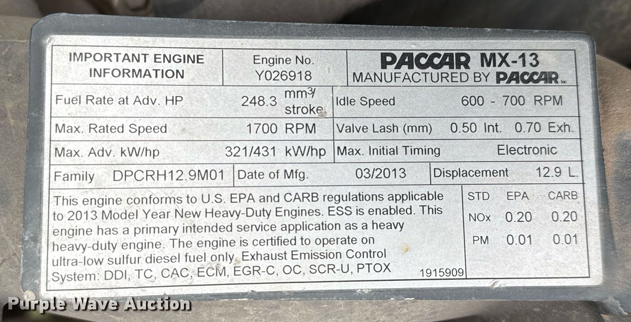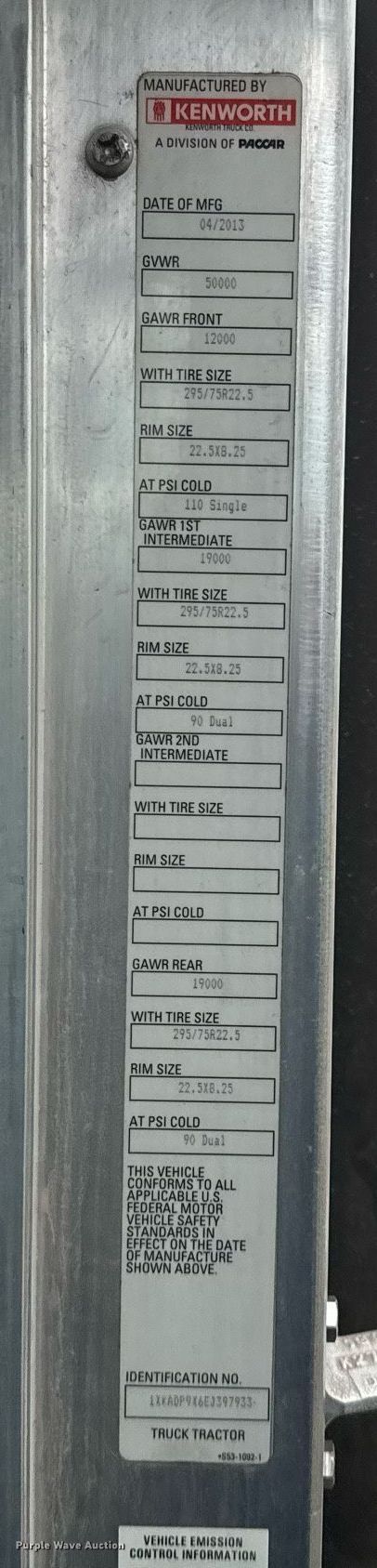 2014 Kenworth T660 semi truck. Miles: Unknown, VIN: 1XKADP9X6EJ397933, Unit #: L204. Engine Paccar MX-13, Serial: Y026918, Displacement: 12.9L, Cylinders: 6, Fuel type: Diesel, HP: 431, kW: 321, Engine brake. Transmission Eaton Fuller, Automatic. Chassis Axles: Tandem, Suspension: Air, Brakes: Air, Truck chassis: 13' 4", GVWR: 50,000 lbs FAWR: 12,000 lbs, IAWR: 19,000 lbs, RAWR: 19,000 lbs. Interior AC, Heat, Heated mirrors, Power windows, Power locks, Sleeper AeroCab, Sleeper length: 60", Beds: Single, Auxiliary power unit Thermo King, Engine Yanmar.. Features Deck plate: Aluminum, Fuel tank: Dual. Tires Size: 295/75R22.5. Notes Parts missing, Non-operational unit Unit must be towed or hauled. Texas title. Mileage has not been verified. Odometer discrepancy will be marked on the title. Title has a lien that will be released following the close of the auction. Title distribution may be delayed up to 30 days from verification of funds. River Road Aggregates. San Angelo, TX 76903
