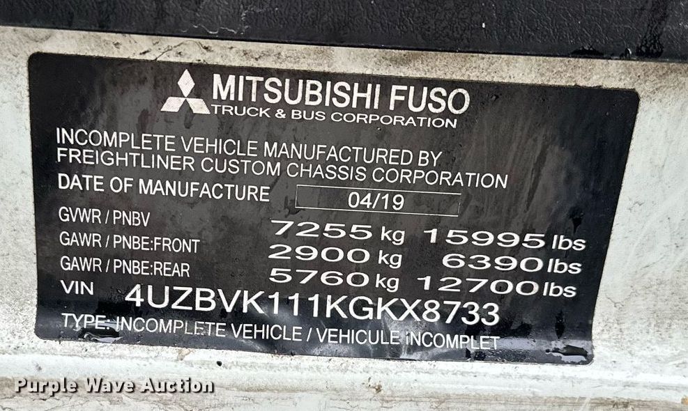 Purple Wave is selling a used Box Truck in Kansas. This item is a 2019 Mitsubishi Fuso Canter box truck with the following: Miles: 117,184 on odometer, VIN: 4UZBVK111KGKX8733