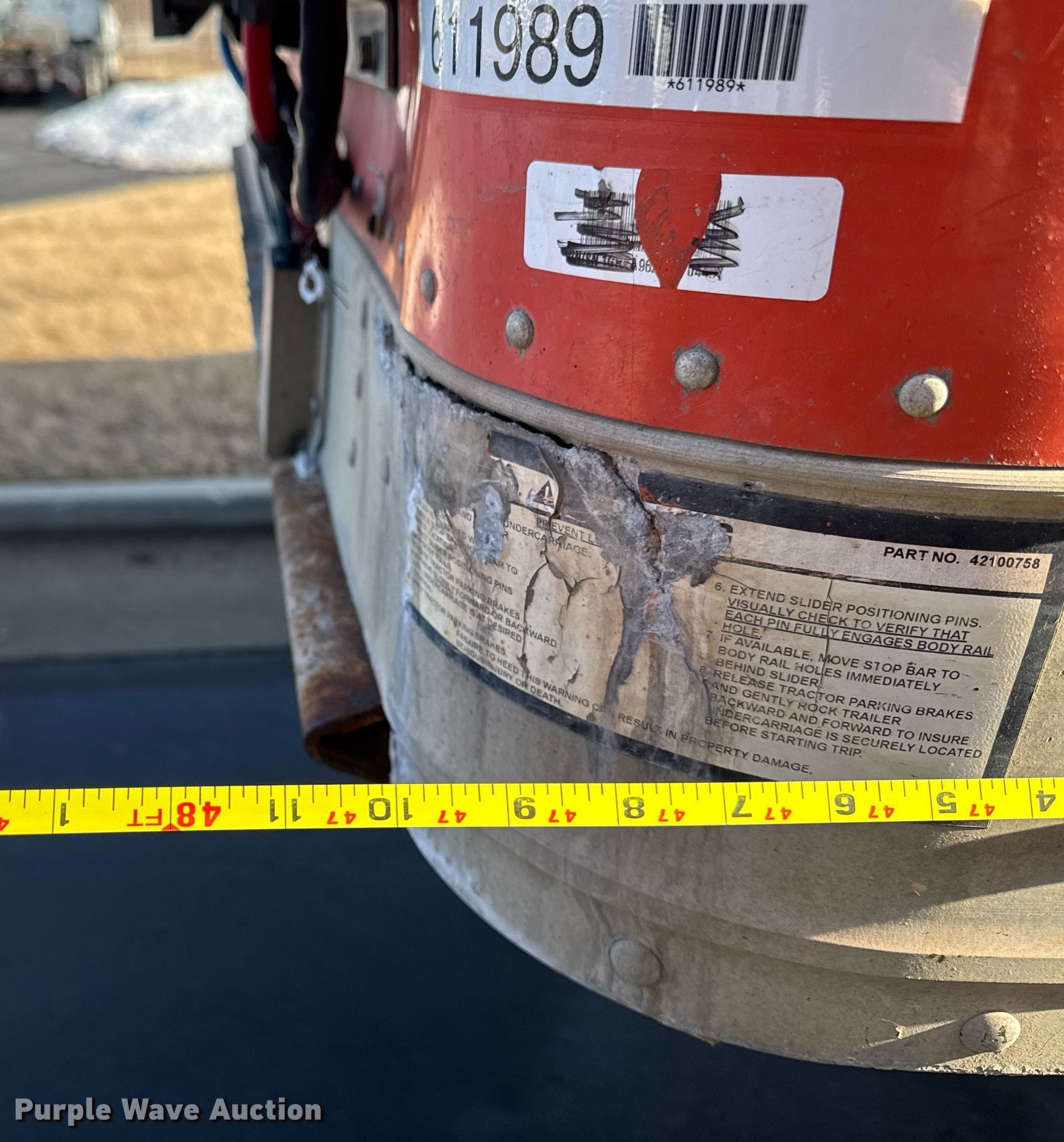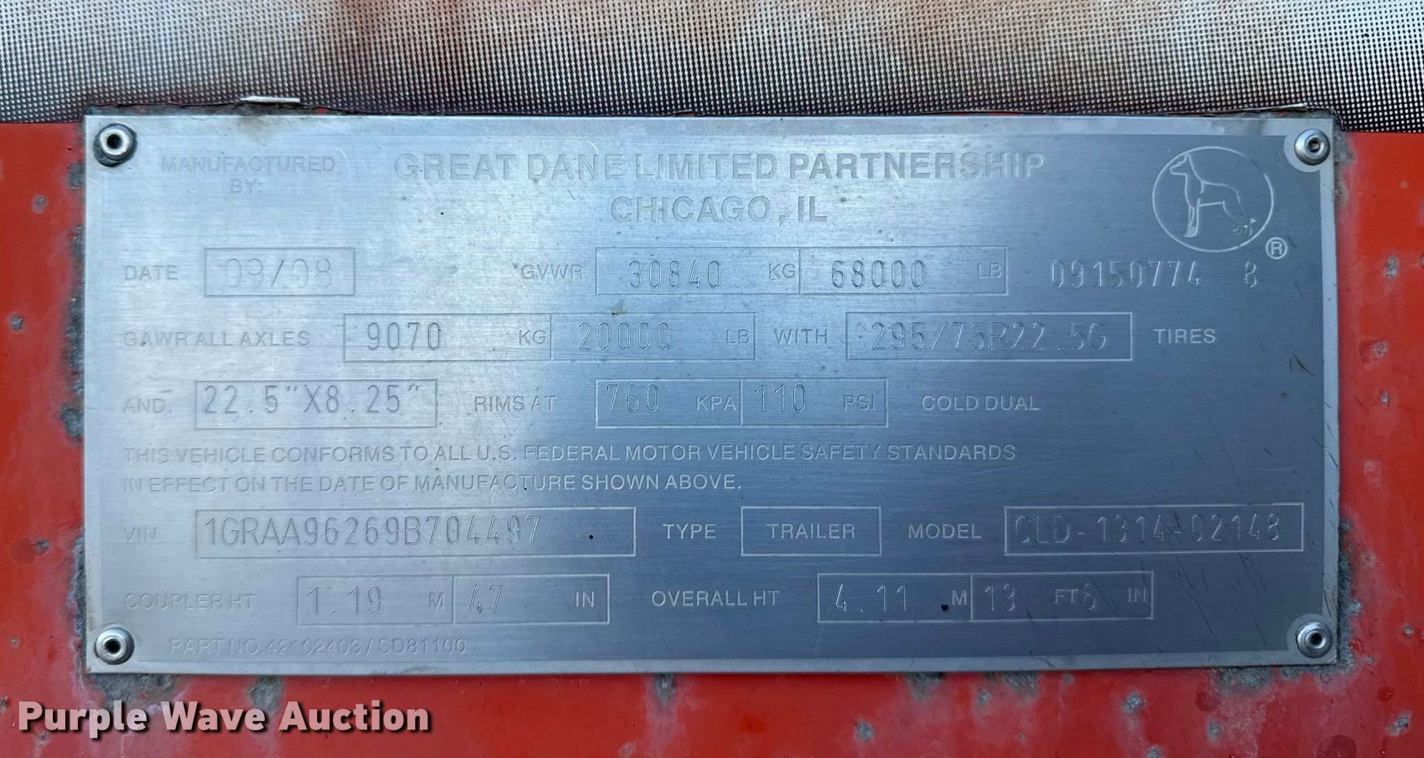 2009 Great Dane CLD-1314-02148 dry van trailer. VIN: 1GRAA96269B704497. Dimensions Overall: 48' L x 102" W, Rear door / ramp 102" L x 94" W. Features Deck type: Wood, E-track rail system. Chassis Landing gear: Dual, Suspension: Air, Brakes: Air, Axles: Tandem Sliding, GVWR: 68,000 lbs, GAWR: 20,000 lbs. Tires Steel wheels, Size: 295/75R22.5. Notes Non-operational roll-up door, will not open. Titles will be distributed after confirmation of payment and removal. Illinois title. Title distribution may be delayed up to 30 days from verification of funds. Altoona, IA 50009