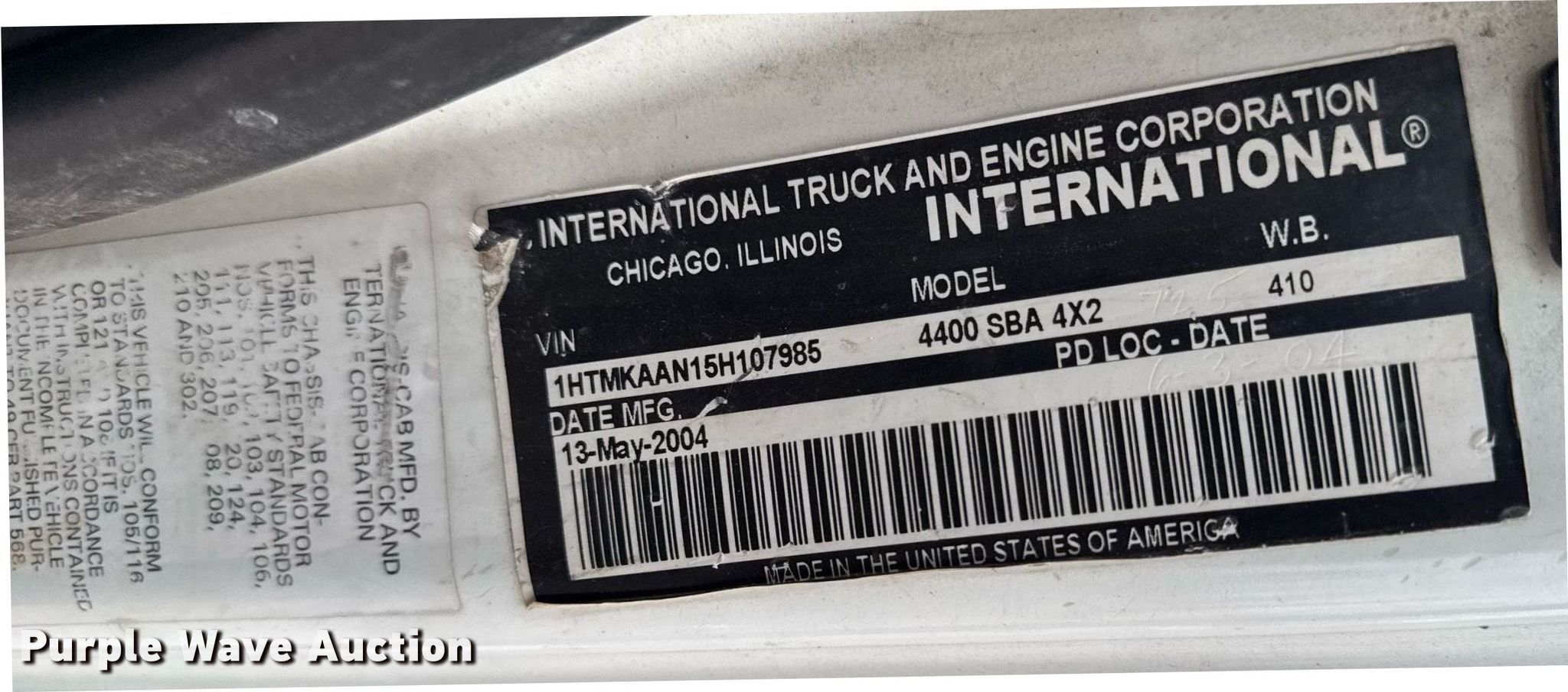 Purple Wave is selling a used Bucket Truck in Iowa. This item is a 2005 International 4400 SBA 4x2 bucket truck with the following: Miles: 233,036 on odometer, Hours: 15,614 on meter, VIN: 1HTMKAAN15H107985
