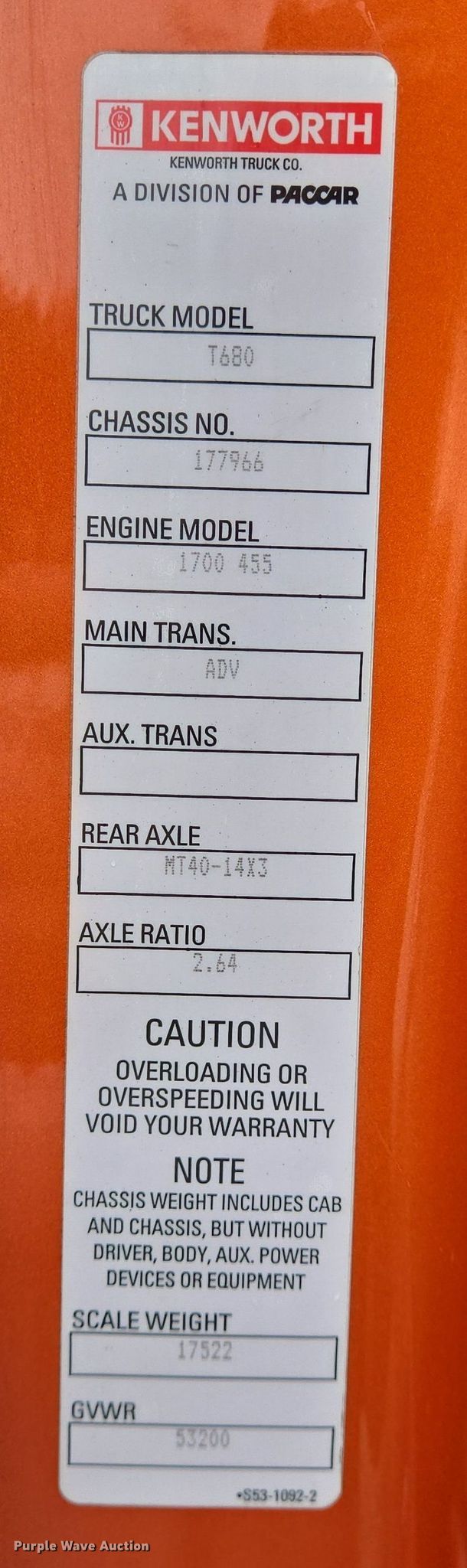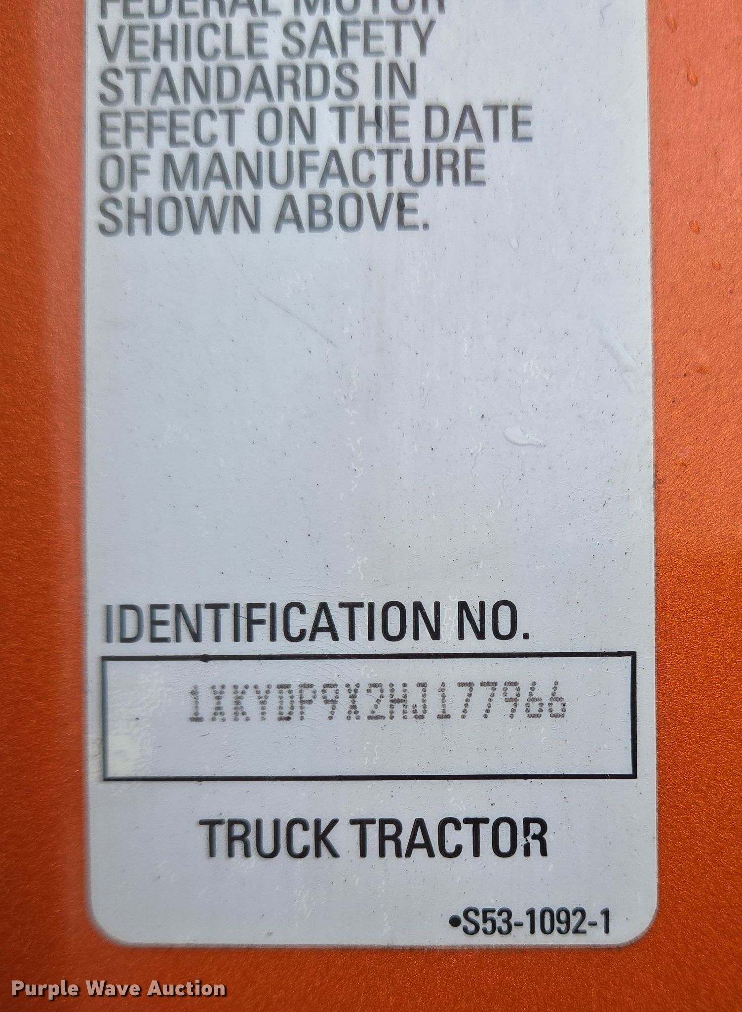 2017 Kenworth T680 semi truck. Miles: 629,824 on odometer, VIN: 1XKYDP9X2HJ177966. Engine Paccar MX-13, Serial: Y032928, Displacement: 12.9 L, Cylinders: 6, Fuel type: Diesel, HP: 455, kW: 4, Engine brake. Transmission Eaton Fuller ADV, Automated manual. Chassis Axles: Tandem, Gear ratio: 2.64, Differential lock: Inter-axle, Suspension: Air Dump valves, Brakes: Air, GVWR: 53,200 lbs FAWR: 13,200 lbs, IAWR: 20,000 lbs, RAWR: 20,000 lbs. Interior AC, Heat, Heated mirrors, Power windows, Power locks, Cruise control, Air ride cab, Sleeper Sleeper length: 64", Beds: Double bunk, Rear climate control. Features Deck plate: Aluminum, Fifth wheel type: Air operated, Sliding, Fuel tank: Dual. Tires Front: 275/80R22.5, Rear: Driver side: 275/80R22.5, Passenger side: 275/75R22.5. Notes DEF system deleted. View repairs. Texas title. Seller is a Texas licensed motor vehicle dealer. The buyer may be required to pay sales tax and/or registration fees to the dealer prior to taking possession. Title will be assigned and distributed by the dealer. Please contact the seller for distribution questions. Texas Truck Sales. Houston, TX 77013