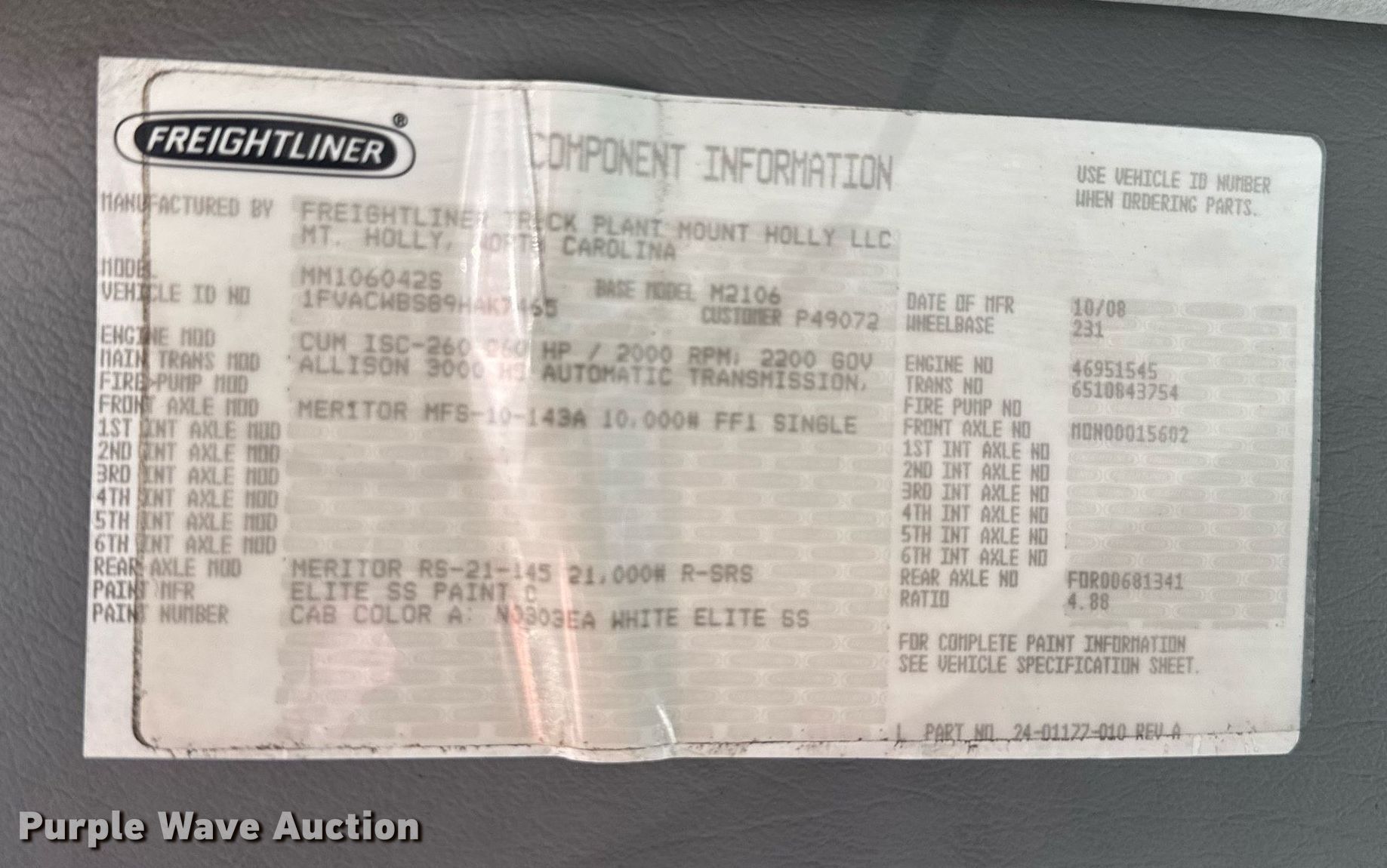 2009 Freightliner Business Class M2 106 box truck. Miles: 154,354 on odometer, Hours: 7,462 on meter, VIN: 1FVACWBS89HAK7465, Unit #: 509652. Engine Cummins ISC-260, Serial: 8CEXH0505CAA, Displacement: 8.3L, Cylinders: 6, Fuel type: Diesel. Transmission Allison, Automatic. Chassis Axles: Single, Suspension: Air, Brakes: Air, GVWR: 26,000 lbs. Interior AC, Heat, Cruise control. Features Box bed Morgan, 20' L x 96" W x 97" H, End gate lift, Waltco. Tires Size: 295/75R22.5. Notes Dash warning indicator: Check engine, Air pressure issues, will not build air, Engine issues, Non-operational unit. Titles will be distributed after confirmation of payment and removal. North Carolina title. Title distribution may be delayed up to 30 days from verification of funds. Charlotte, NC 28269