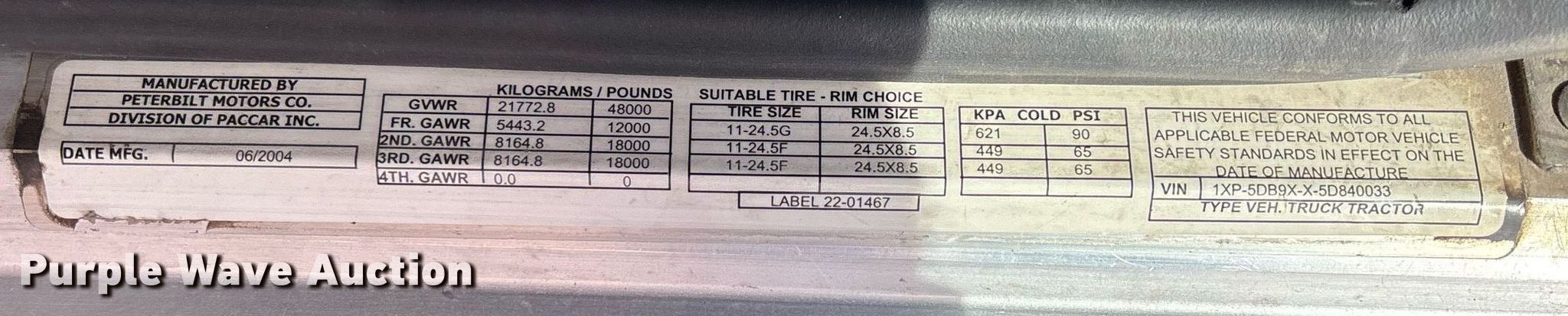 Purple Wave is selling a used Truck Tractor in Texas. This item is a 2005 Peterbilt 379 semi truck with the following: Miles: 881,714 on odometer, VIN: 1XP5DB9XX5D840033