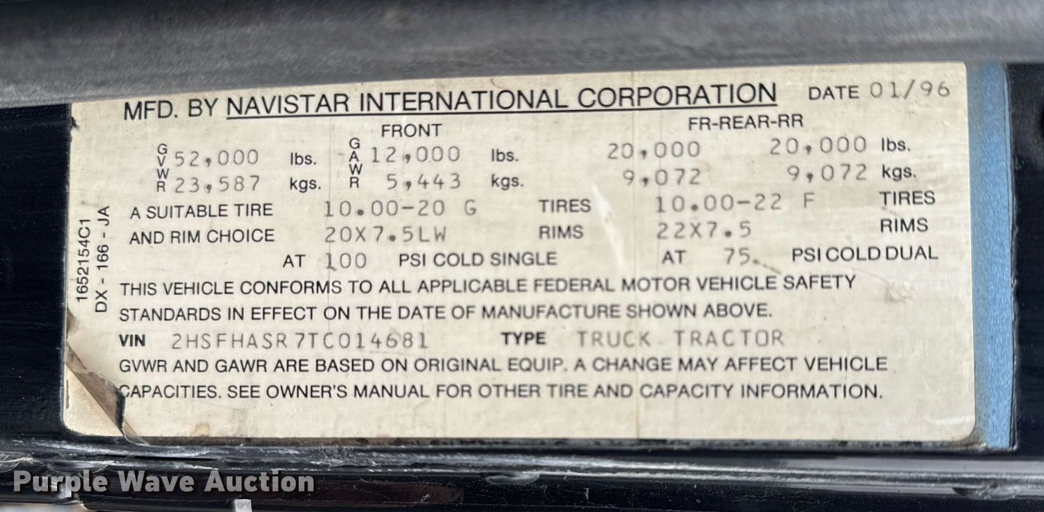 1996 International 9400 truck cab and chassis. Miles: 934,271 on odometer, Hours: 3,861 on meter, VIN: 2HSFHASR7TC014681. Engine Caterpillar, Displacement: 14.6L, Cylinders: 6, Fuel type: Diesel, Engine brake. Transmission Eaton Fuller, Manual, Speed: 13. Chassis Axles: Tandem, Differential lock: Inter-axle, Suspension: Air, Brakes: Air, GVWR: 52,000 lbs FAWR: 12,000 lbs, IAWR: 20,000 lbs, RAWR: 20,000 lbs. Interior AC, Heat, Cruise control. Features Fuel tank: Dual. Tires Front: 385/65R22.5, Rear: 11R24.5. Notes Passenger seat missing. Oklahoma classic title. Seller is an Oklahoma licensed motor vehicle dealer. Title will be assigned and distributed by the dealer. Please contact the seller for distribution questions. Title distribution may be delayed up to 30 days from verification of funds. Collinsville, OK 74021