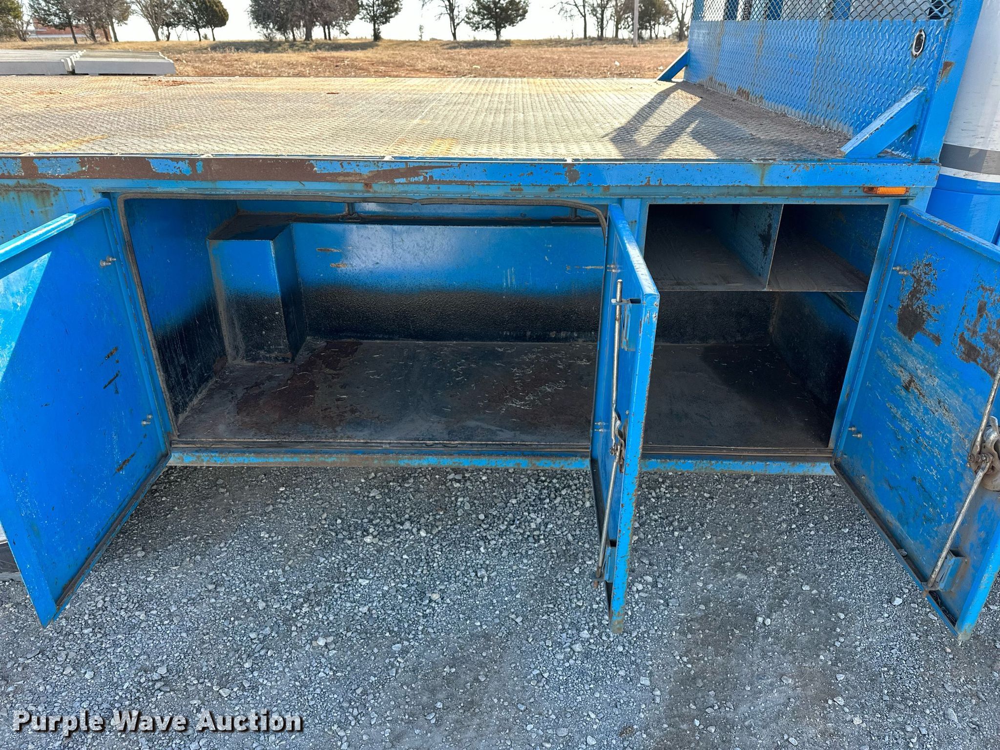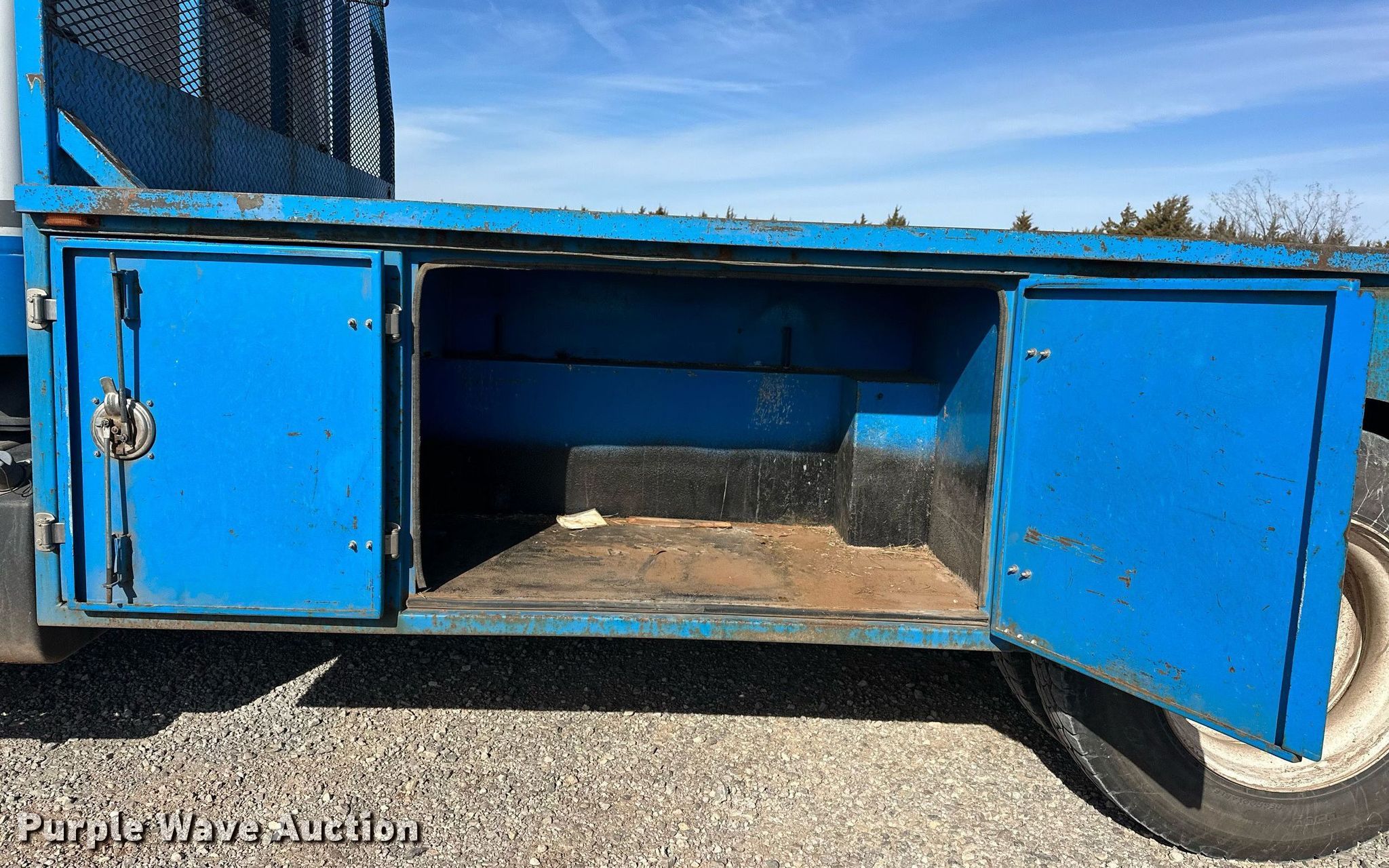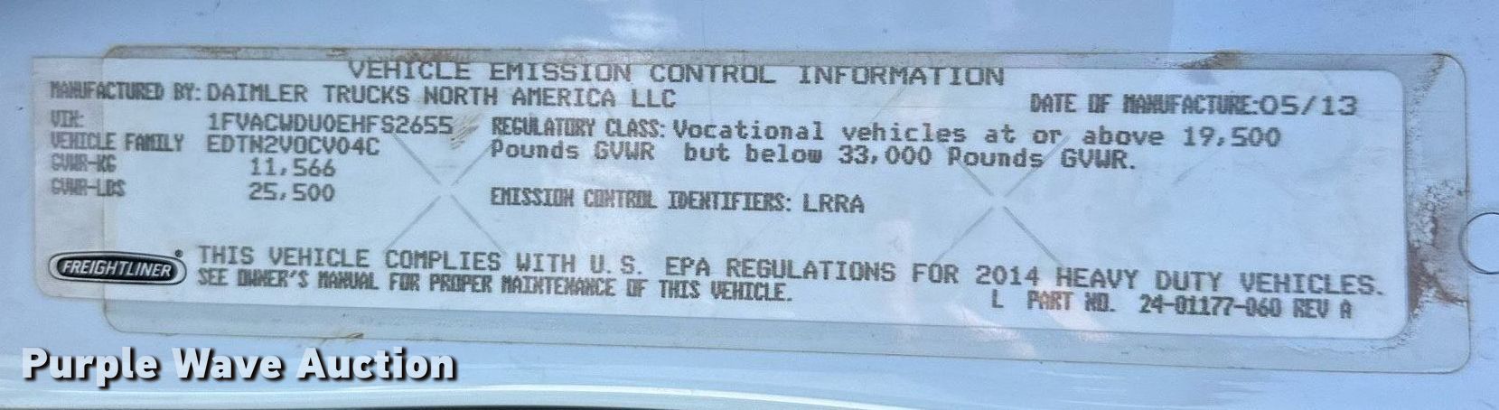 2014 Freightliner M2 flatbed truck. Miles: 384,052 on odometer, Hours: 16,463 on meter, VIN: 1FVACWDUOEHFS2655. Engine Cummins ISB6.7, Serial: 60707055, Displacement: 6.7L, Cylinders: 6, Fuel type: Diesel, HP: 220. Transmission Manual, Speed: 6. Chassis Axles: Single, Suspension: Spring, Brakes: Hydraulic, GVWR: 25,500 lbs. Interior AC, Heat, Cruise control, Brake controller. Features Flatbed MBS, Serial: 027513, 14' 6" L x 96" W. Tires Size: 9R22.5. Oklahoma title. Title distribution may be delayed up to 30 days from verification of funds. Wilbert Funeral Services. Oklahoma City, OK 73114