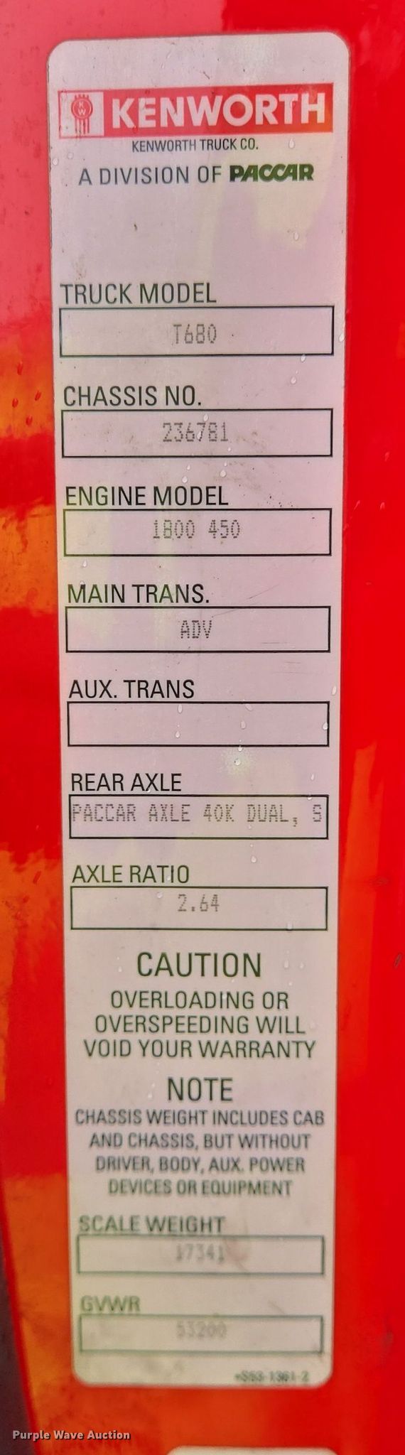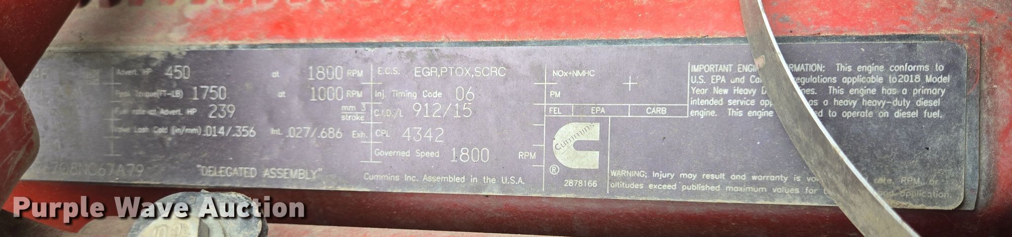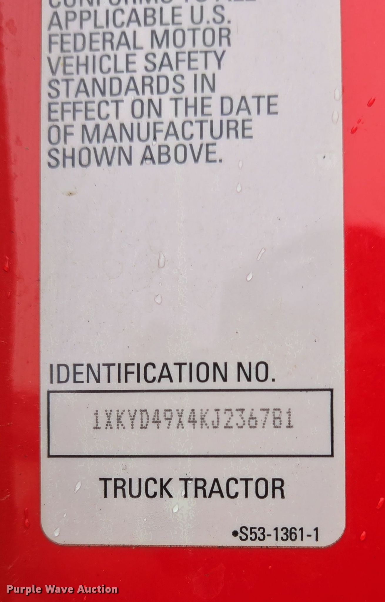 2019 Kenworth T680 semi truck. Miles: Unknown, VIN: 1XKYD49X4KJ236781, Unit #: 82900174. Engine Cummins X15, Serial: 80055482, Displacement: 15.0L, Cylinders: 6, Fuel type: Diesel, HP: 450, Engine brake. Transmission Automated manual. Chassis Axles: Tandem, Differential lock: Inter-axle, Suspension: Air Dump valves, Brakes: Air, GVWR: 53,200 lbs FAWR: 13,200 lbs, IAWR: 20,000 lbs, RAWR: 20,000 lbs, Wheelbase: 225". Interior AC, Heat, Power windows, Power locks, Cruise control, Air ride cab, Sleeper Sleeper length: 60", Beds: Double bunk. Features Fifth wheel type: Fixed, Fuel tank: Dual. Tires Size: 295/75R22.5. Notes Parts missing, Non-operational unit. Secured storage hosted by a Copart facility. Please review REQUIRED REMOVAL INSTRUCTIONS.. Lender owned. Item condition and history are unknown. No additional information is available. Titles will be distributed after confirmation of payment and removal. Texas title. Mileage has not been verified. Odometer discrepancy will be marked on the title. Title distribution may be delayed up to 30 days from verification of funds. Corpus Christi, TX 78405