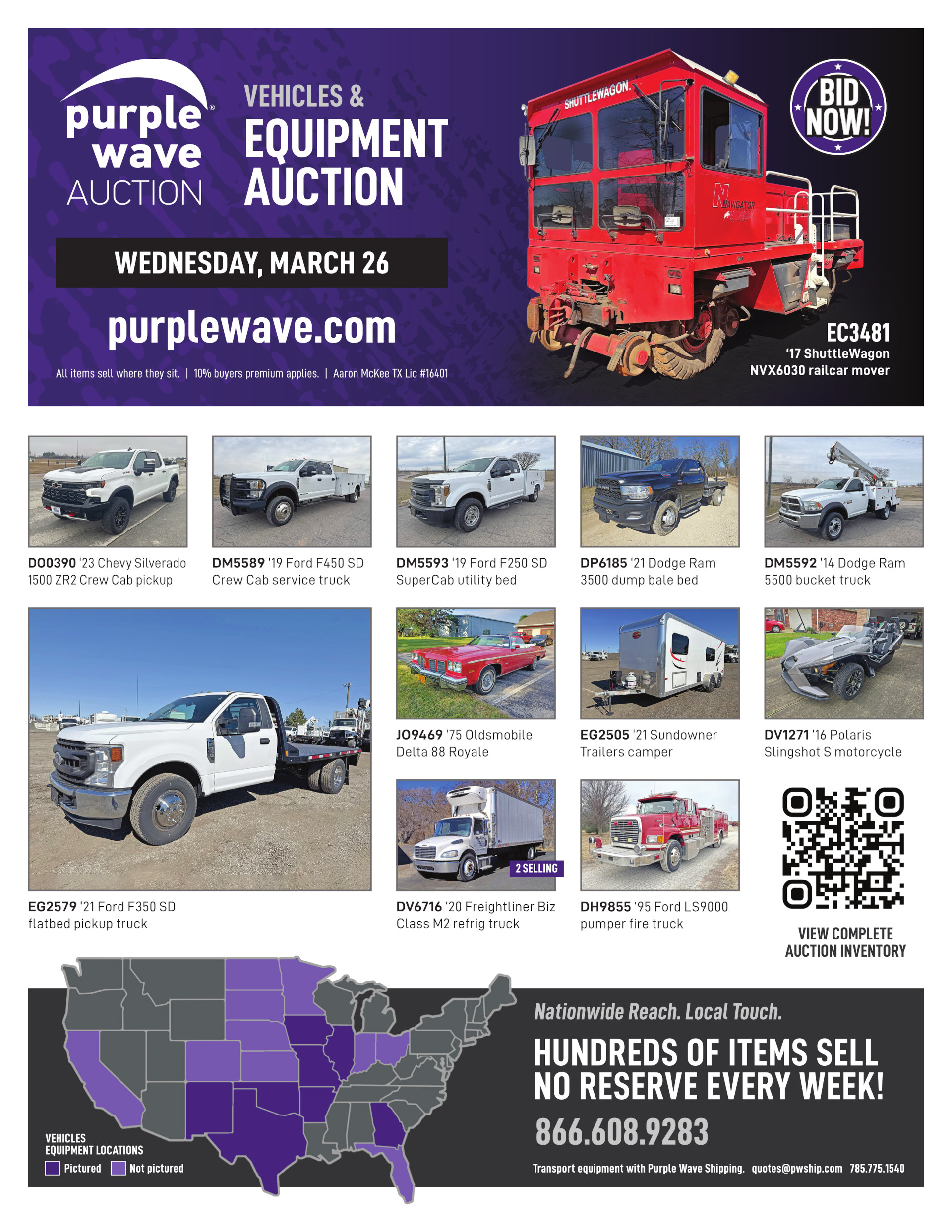 Purple Wave Shipping, LLC provides shipping and transportation services to winning bidders on ag, construction and fleet type assets. Purple Wave Shipping, LLC does not provide shipping on items weighing less than 1,000 pounds.