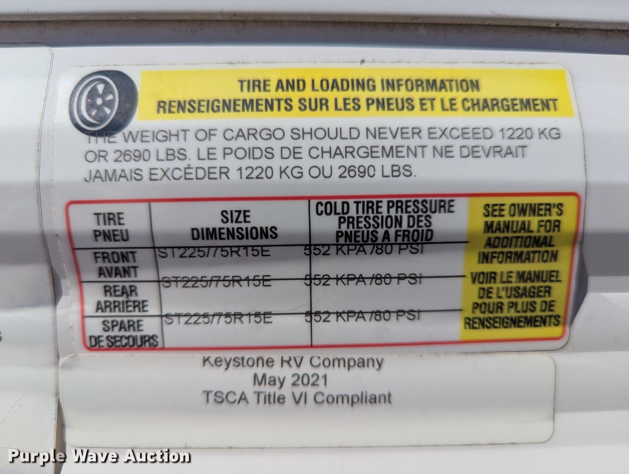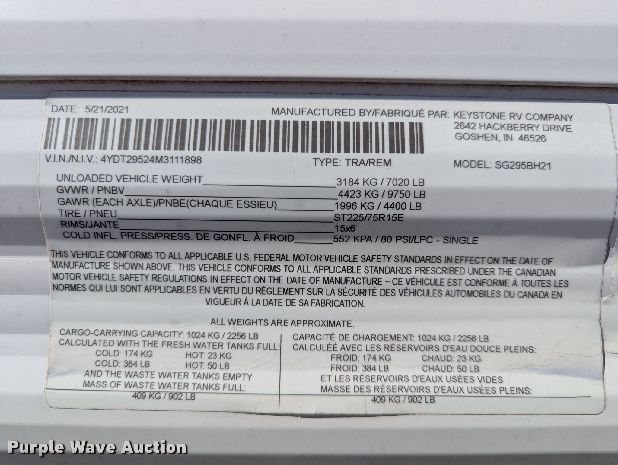 Purple Wave is selling a used RV or Camper in Kansas. This item is a 2021 Keystone SG295BH21 camper with the following: Camper length: 33' 5", VIN: 4YDT29524M3111898