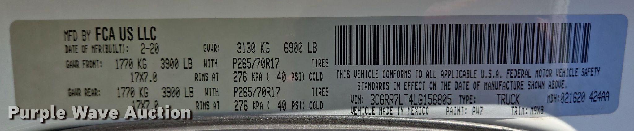 Purple Wave is selling a used 1/2 Ton Pickup or Van in Texas. This item is a 2020 Dodge Ram 1500 Crew Cab pickup truck with the following: Miles: 144,928 on odometer, VIN: 3C6RR7LT4LG156805