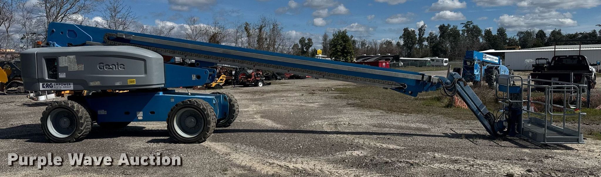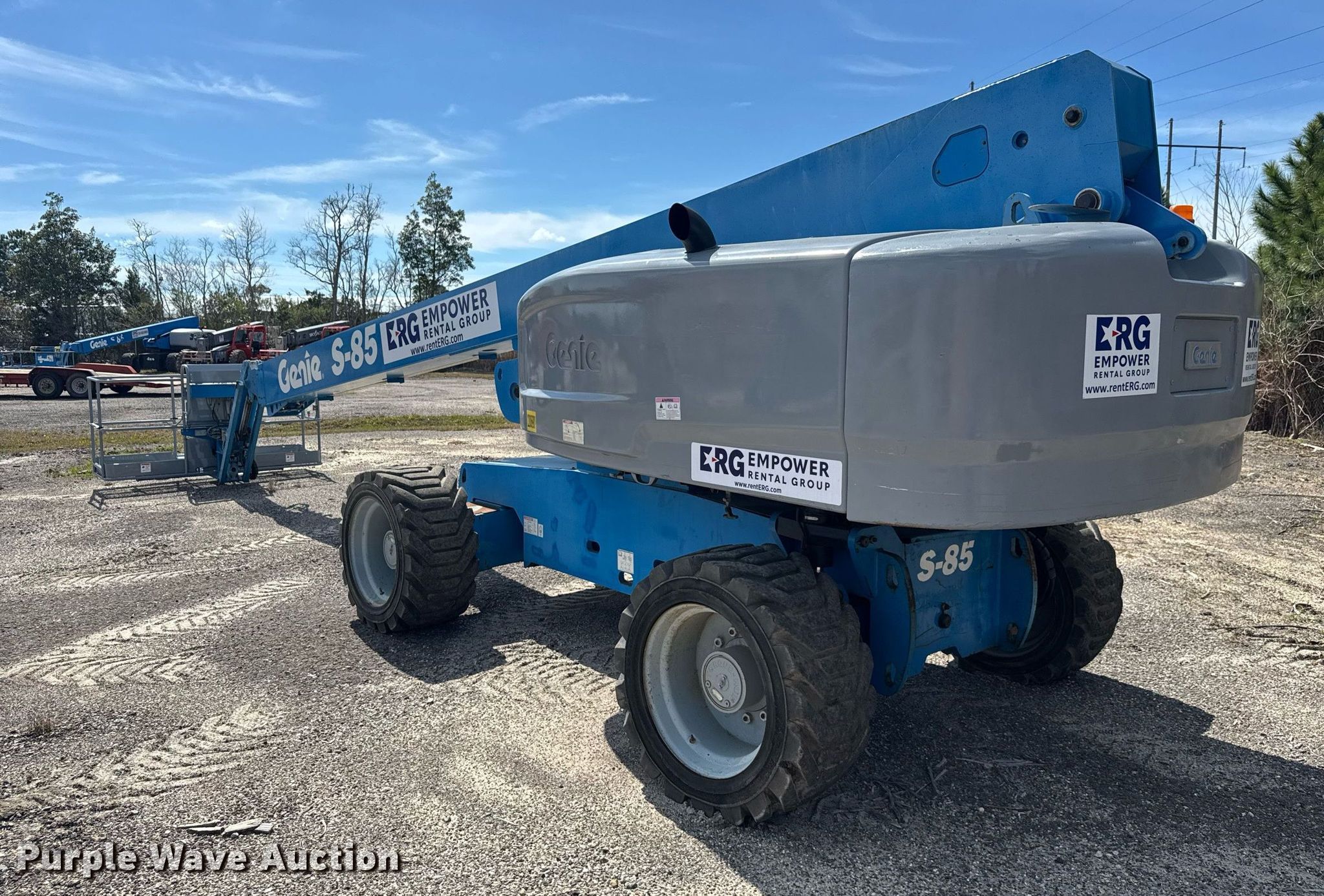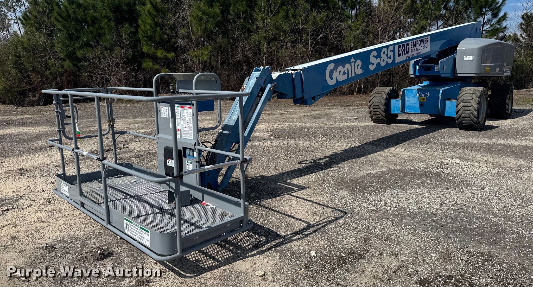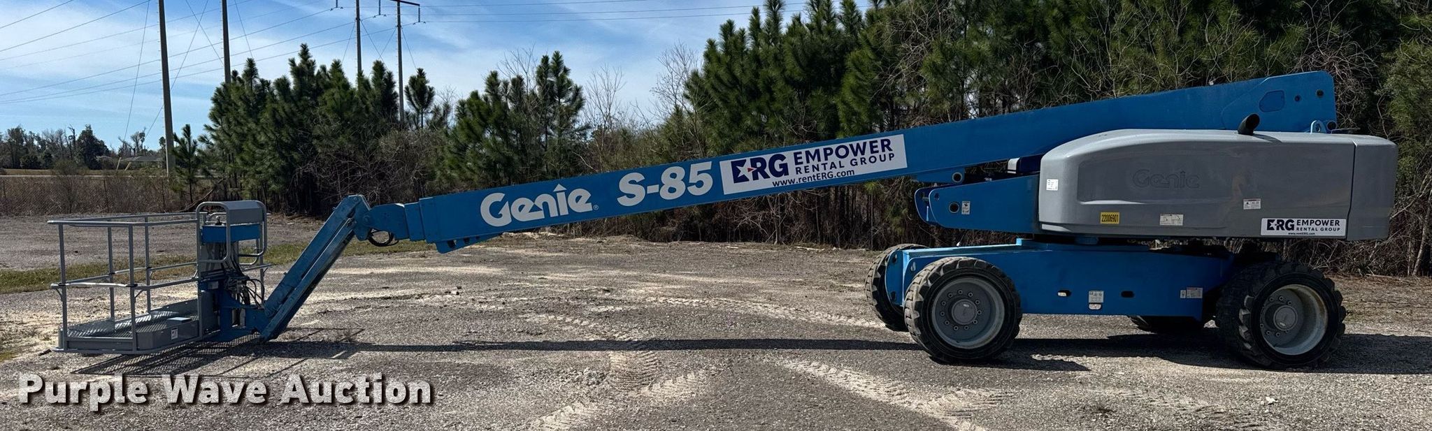 2010 Genie S-85 boom lift. Hours: 4,228 on meter, Serial: S8510-6544. Engine Deutz TD 2011 L 04, Displacement: 3.619L, Cylinders: 4, Fuel type: Diesel. Chassis Four wheel drive. Features Rough terrain, Boom type: Telescopic, Maximum lift capacity: 500 lbs, Maximum reach length: 77' 5", Maximum lift height: 85', Hydraulic extendable jib, Hydraulic leveling, Platform: 96" L x 33" W, AC power outlet, Controls: Platform, Ground, Platform rotation: Hydraulic. Tires Tire size: 18-625NHS. Empower Rental Group. Panama City, FL 32405