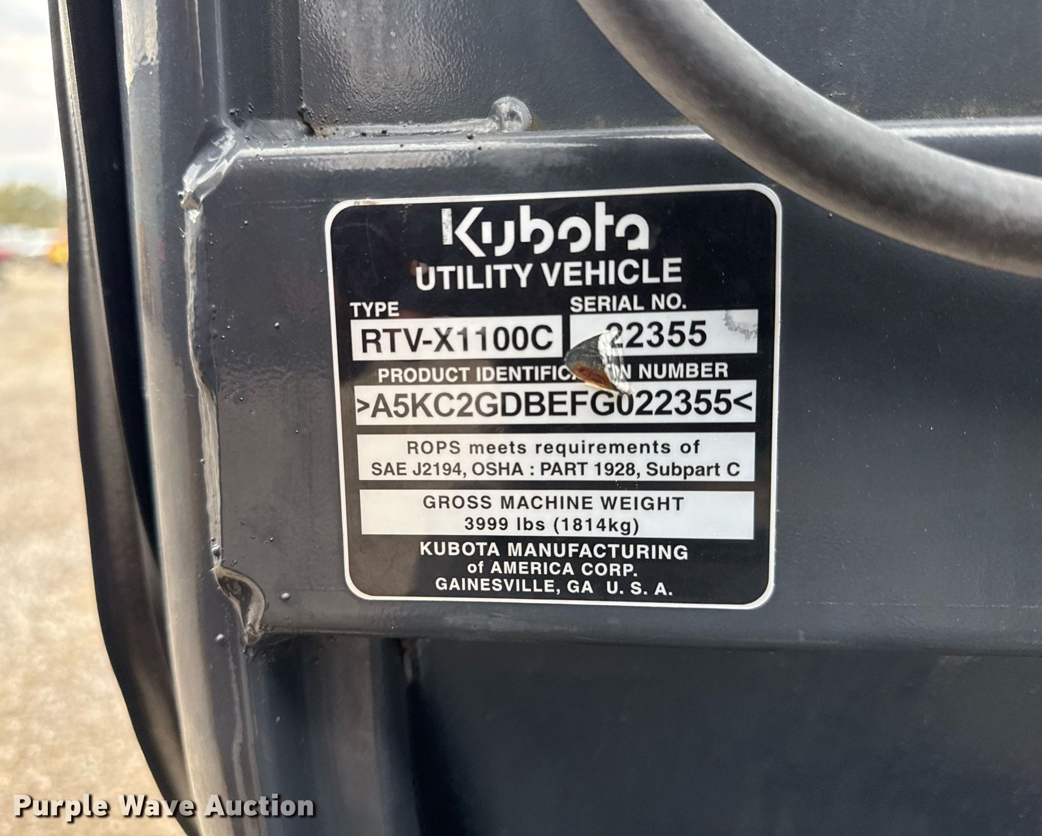 Purple Wave is selling a used Utility Vehicle in Oklahoma. This item is a 2015 Kubota RTV-X1100C utility vehicle with the following: Miles: 10,234 on odometer, VIN: A5KC2GDBEFG022355, Serial: 22355
