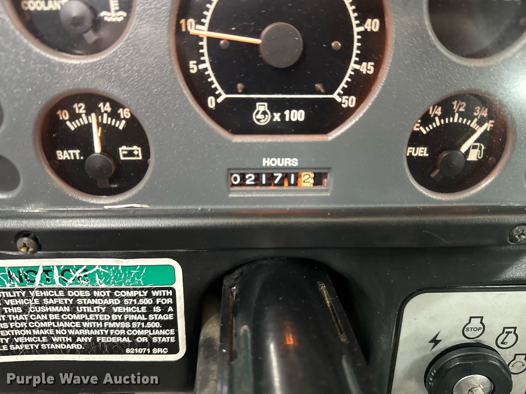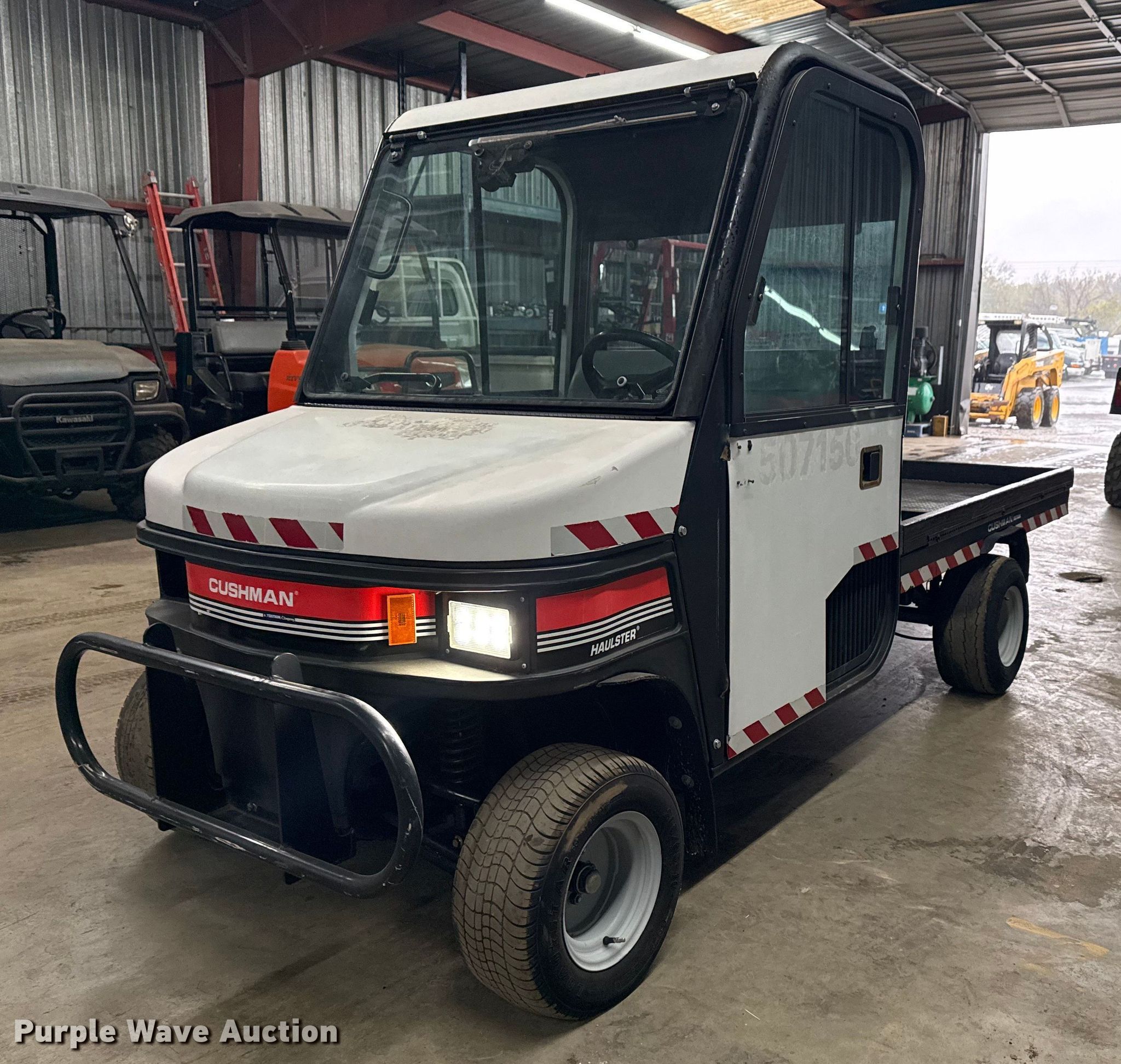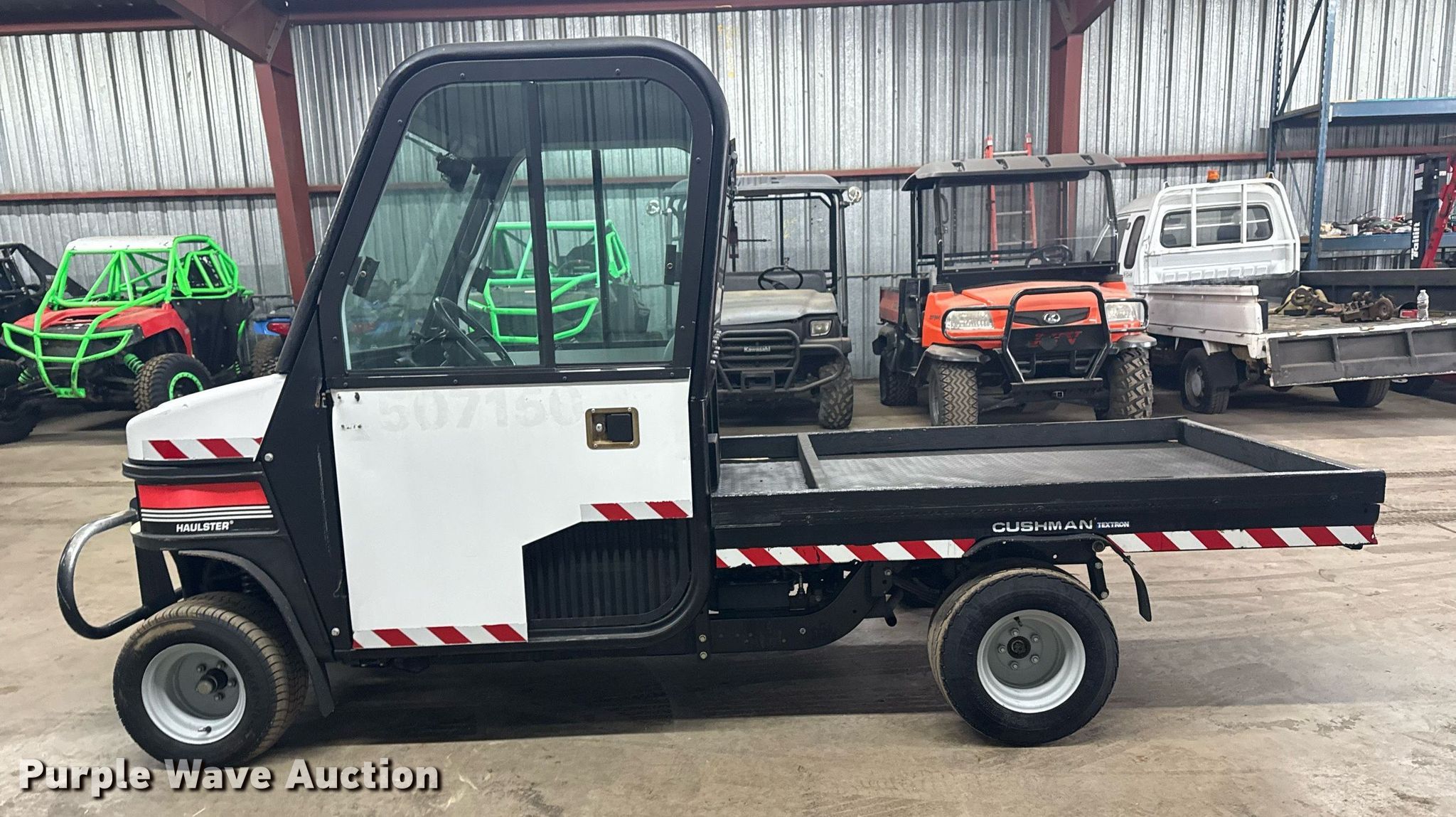 2015 Cushman Haulster utility vehicle. Hours: 2,171 on meter, Serial: 840710002058. Engine Cylinders: 3, Fuel type: Gas, Electric start. Transmission Automatic. Operators station Enclosed cab. Features Box bed 69" L x 48" W, Hitch: Pintle. Tires Size: 205/65-10. Notes Passenger side headlight missing. Transfer of ownership documentation will be a bill of sale. Collinsville, OK 74021