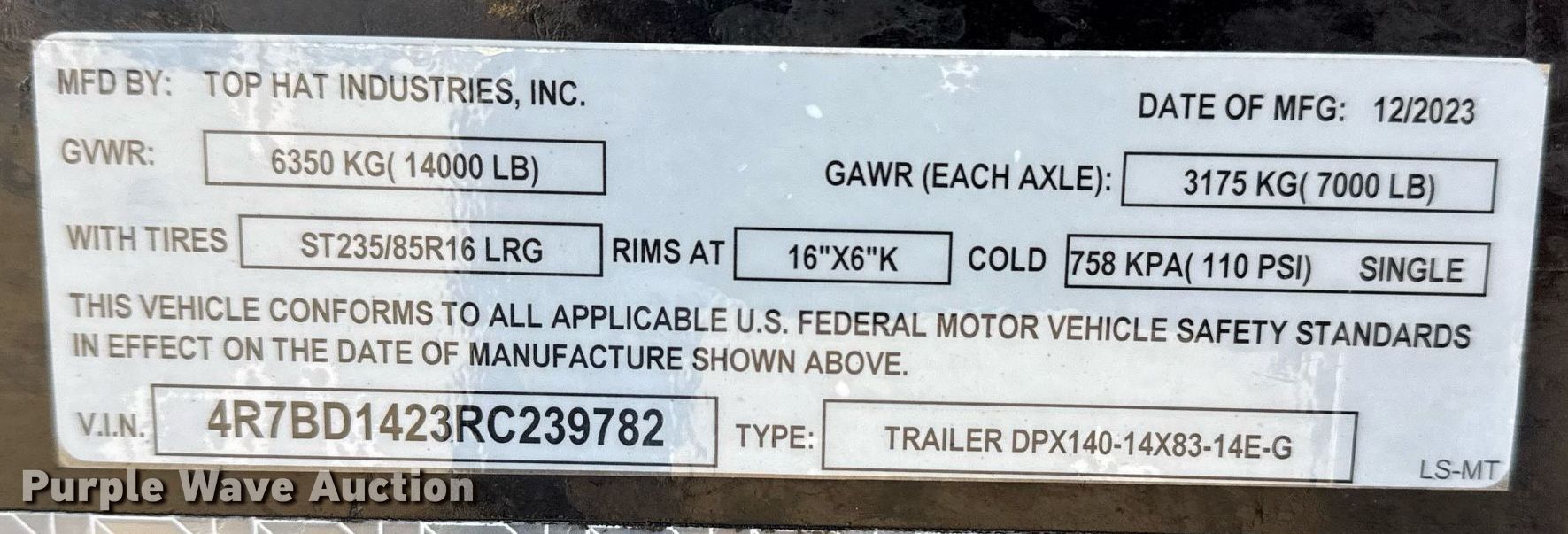 Purple Wave is selling a used Dump Trailer in Oklahoma. This item is a 2024 Top Hat Industries DPX140 dump trailer with the following: VIN: 4R7BD1423RC239782