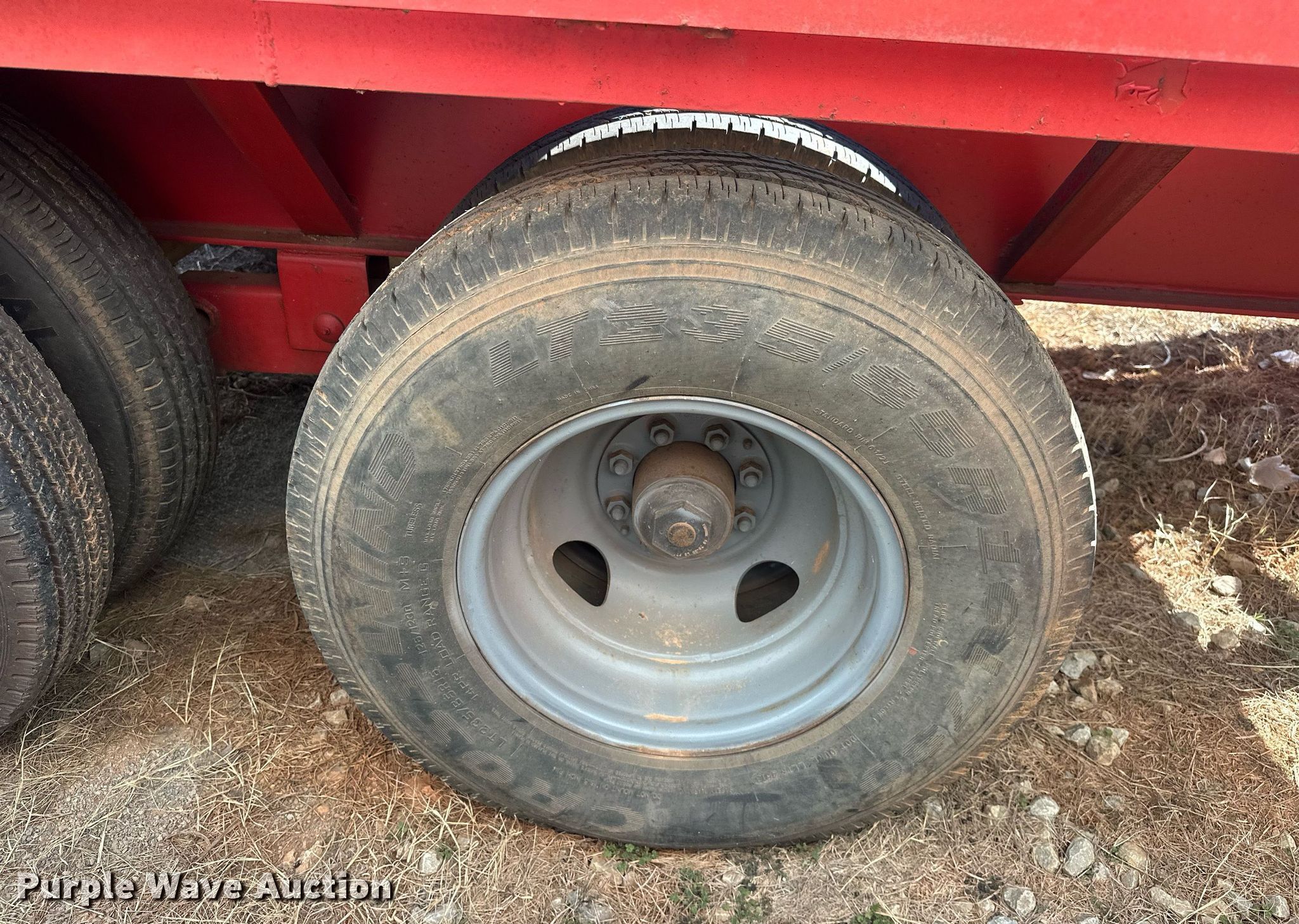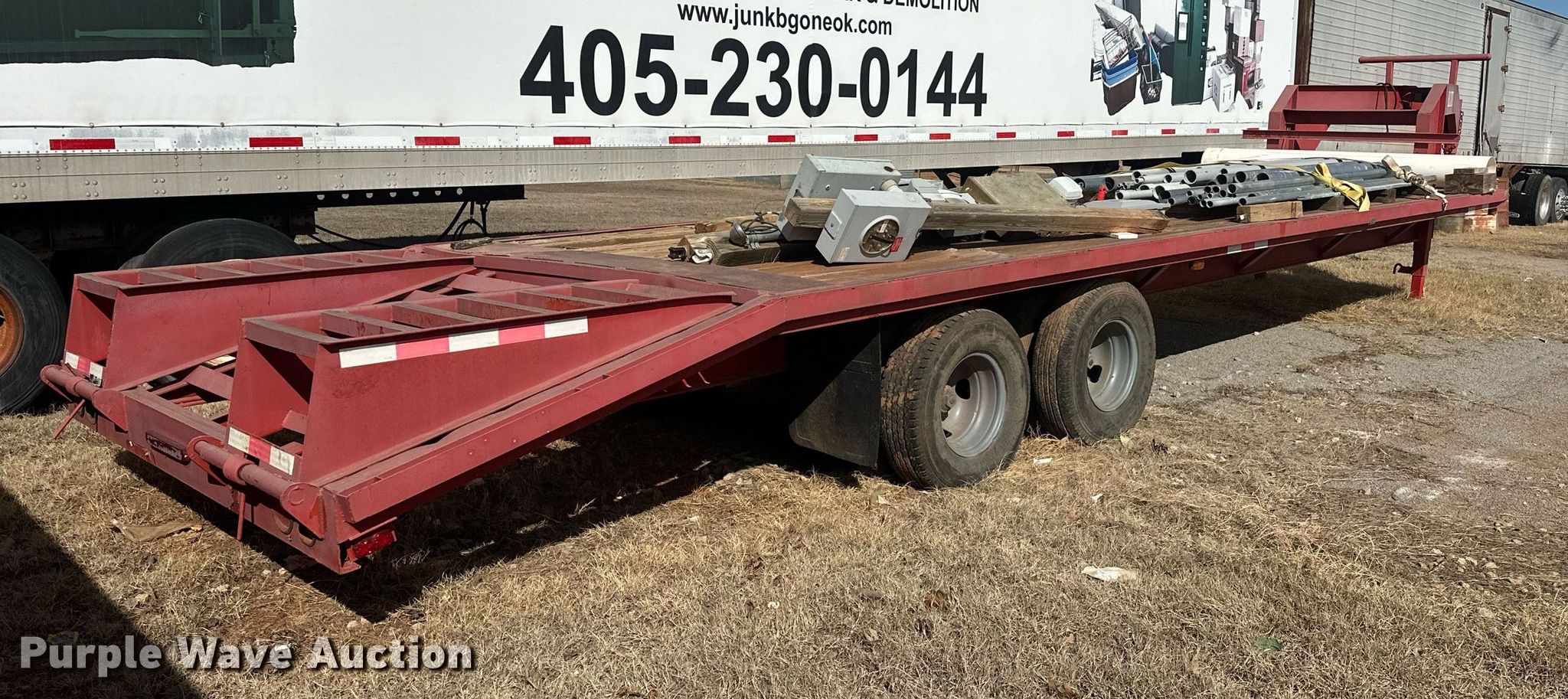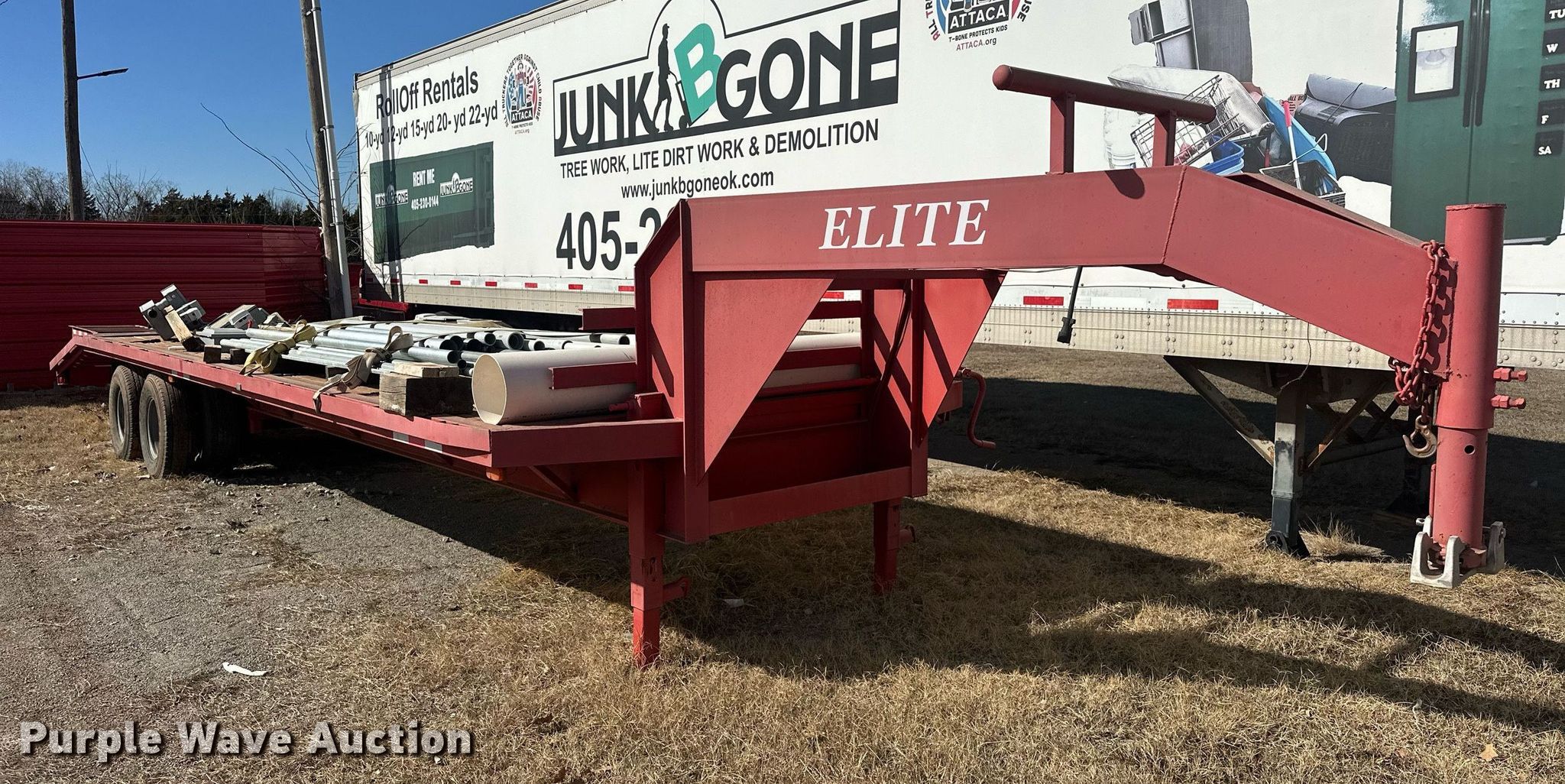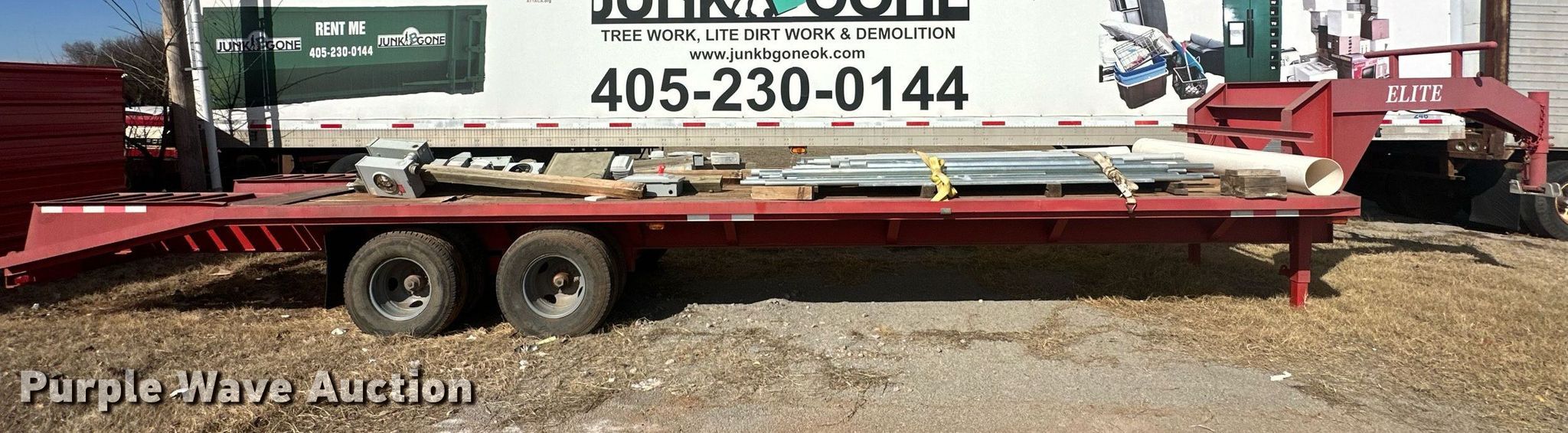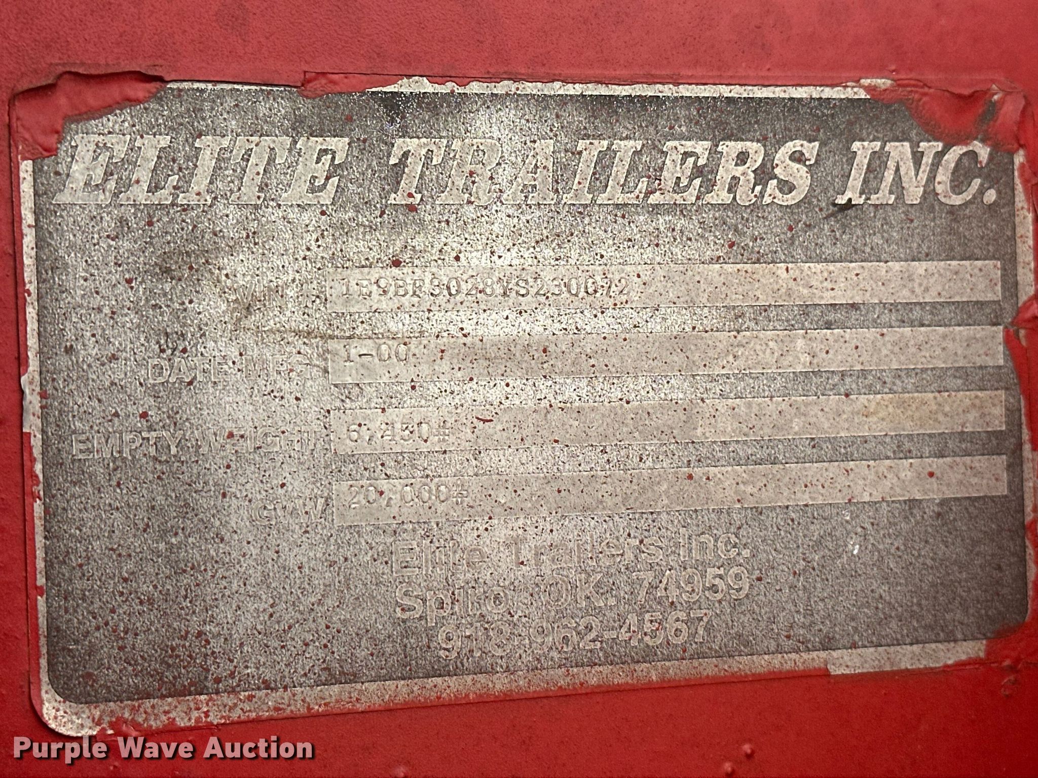 2000 Elite equipment trailer. VIN: 1E9BF3028YS230072. Dimensions Overall: 38' 6" L x 101" W, Deck: 25' L x 96" W, Tail length: 5', Ramps: Manual Length: 5'. Features Deck type: Wood. Chassis Hitch: Gooseneck, Landing gear: Dual, Suspension: Spring, Brakes: Electric, Axles: Tandem, GVWR: 20,000 lbs, GAWR: 6,450 lbs. Tires Steel wheels, Size: 7.50R16, Size: LT235/85R16. Notes Contents not included, Flat tire, Deck boards damaged. Transfer of ownership documentation will be a bill of sale. Guthrie, OK 73044