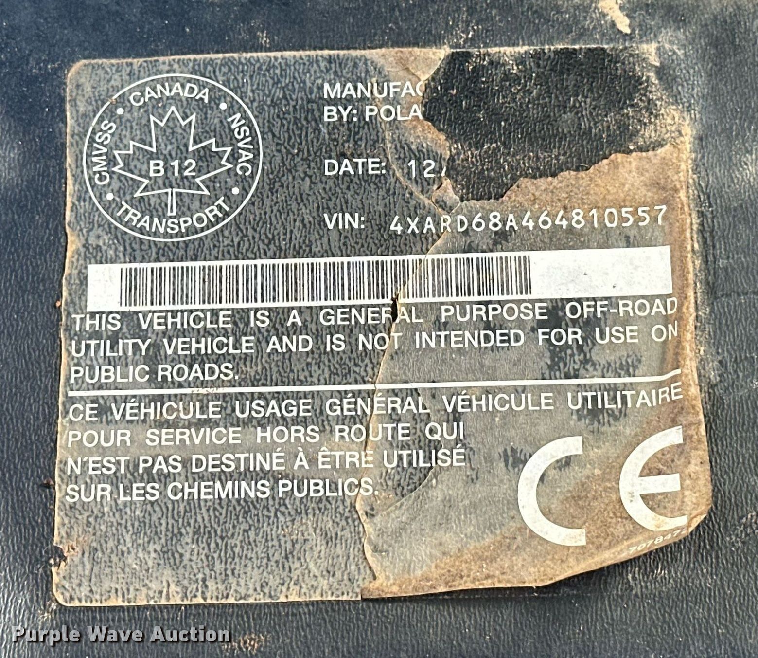 Purple Wave is selling a used Utility Vehicle in Oklahoma. This item is a 2006 Polaris Ranger XP utility vehicle with the following: Hours: 1,201 on meter, VIN: 4XARD68A464810557