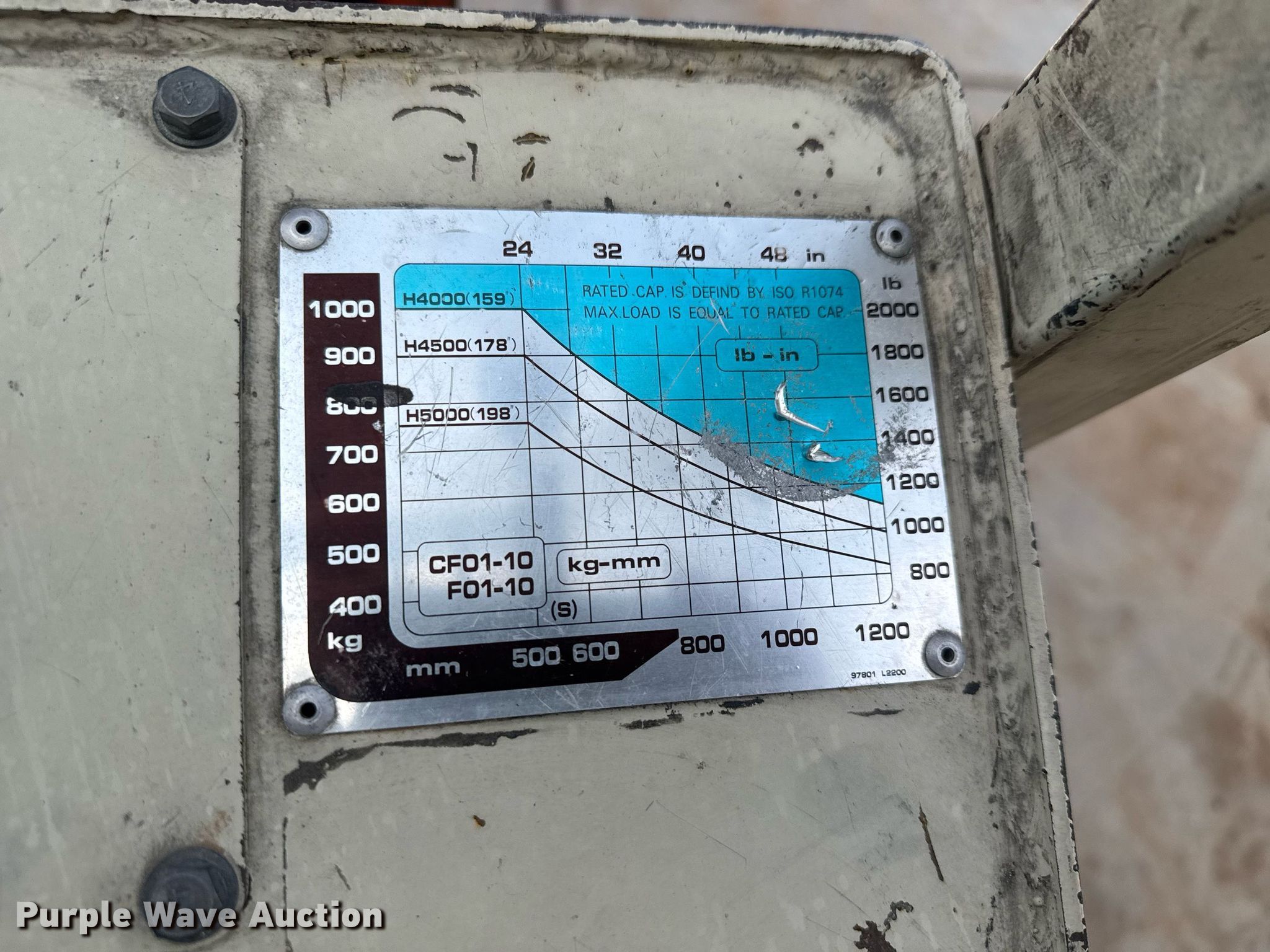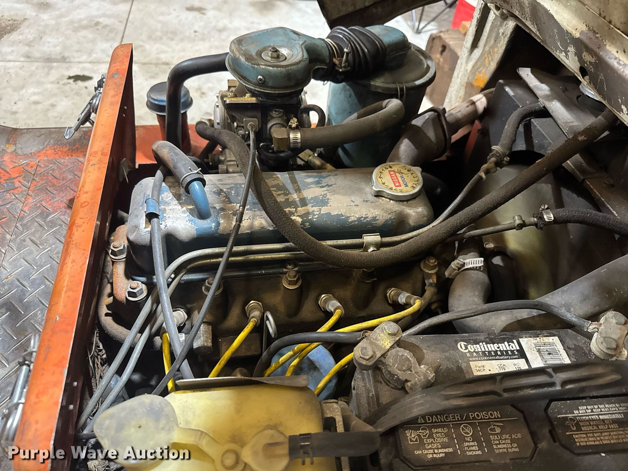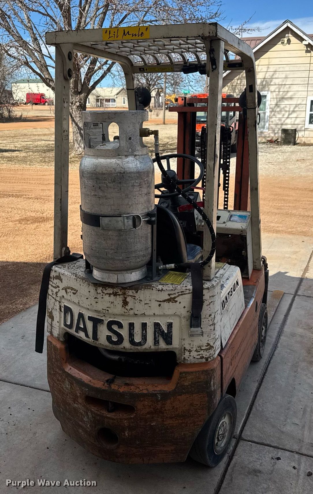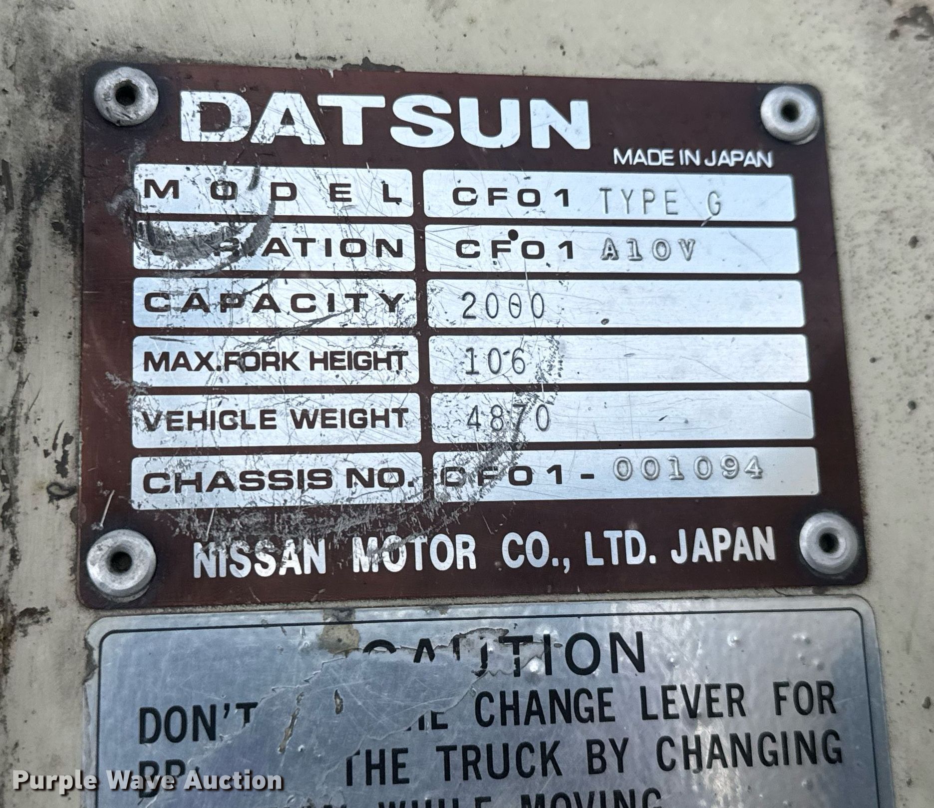 Datsun CF01 Type G forklift. Hours: 4,702 on meter, Serial: CF01-001094. Engine Nissan, Cylinders: 4, Fuel type: LPG LP bottle: Included. Transmission Powershift. Features Maximum lift capacity: 2,000 lbs, Maximum lift height: 106", Mast stages: 2, Mast tilt, Fork length: 42". Tires Size: 14x4.5x8, Solid. Murdock, KS 67111