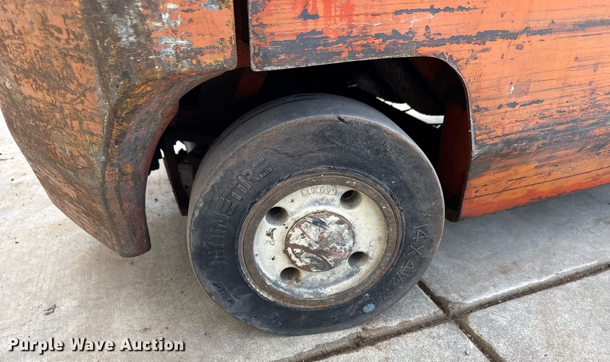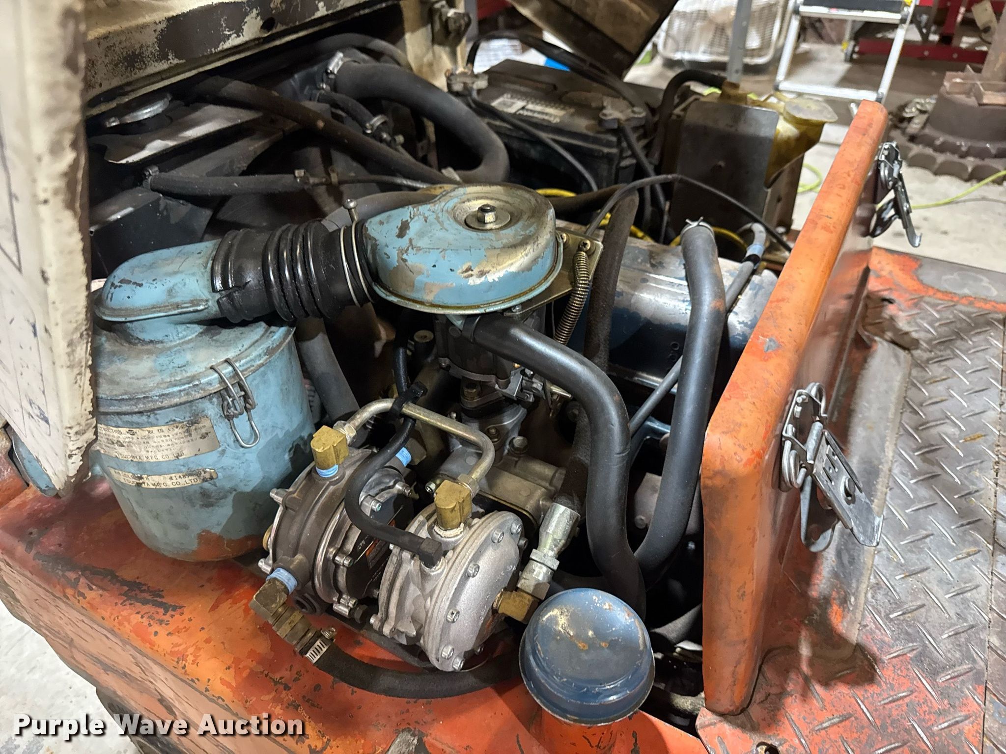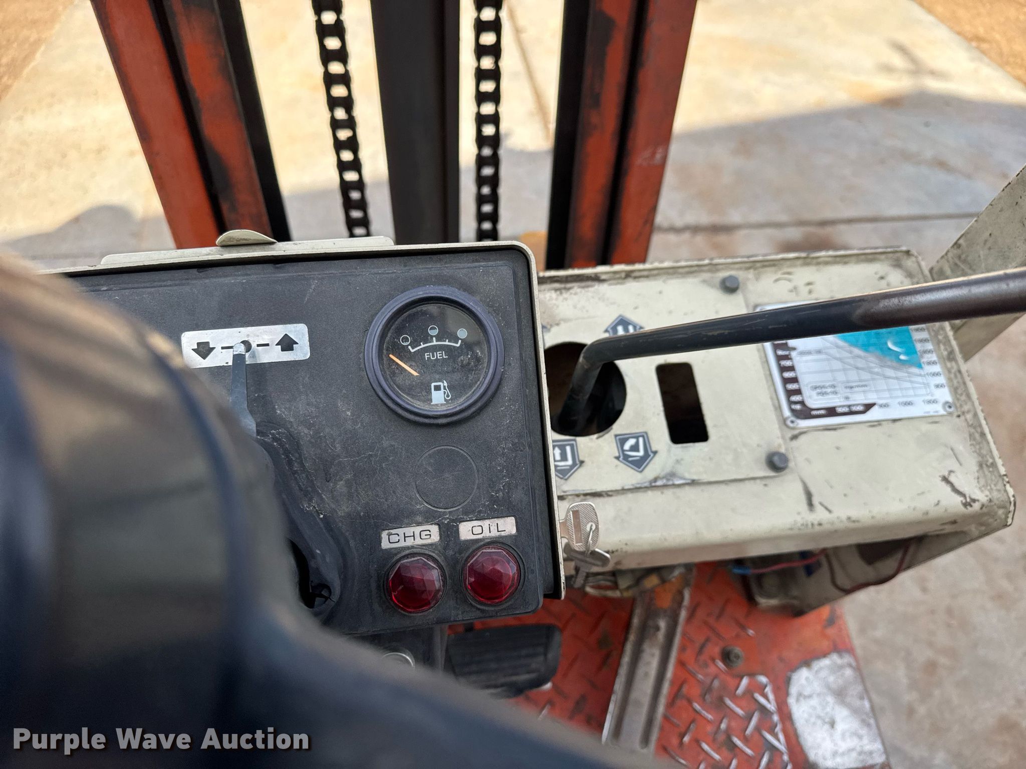 Datsun CF01 Type G forklift. Hours: 4,702 on meter, Serial: CF01-001094. Engine Nissan, Cylinders: 4, Fuel type: LPG LP bottle: Included. Transmission Powershift. Features Maximum lift capacity: 2,000 lbs, Maximum lift height: 106", Mast stages: 2, Mast tilt, Fork length: 42". Tires Size: 14x4.5x8, Solid. Murdock, KS 67111