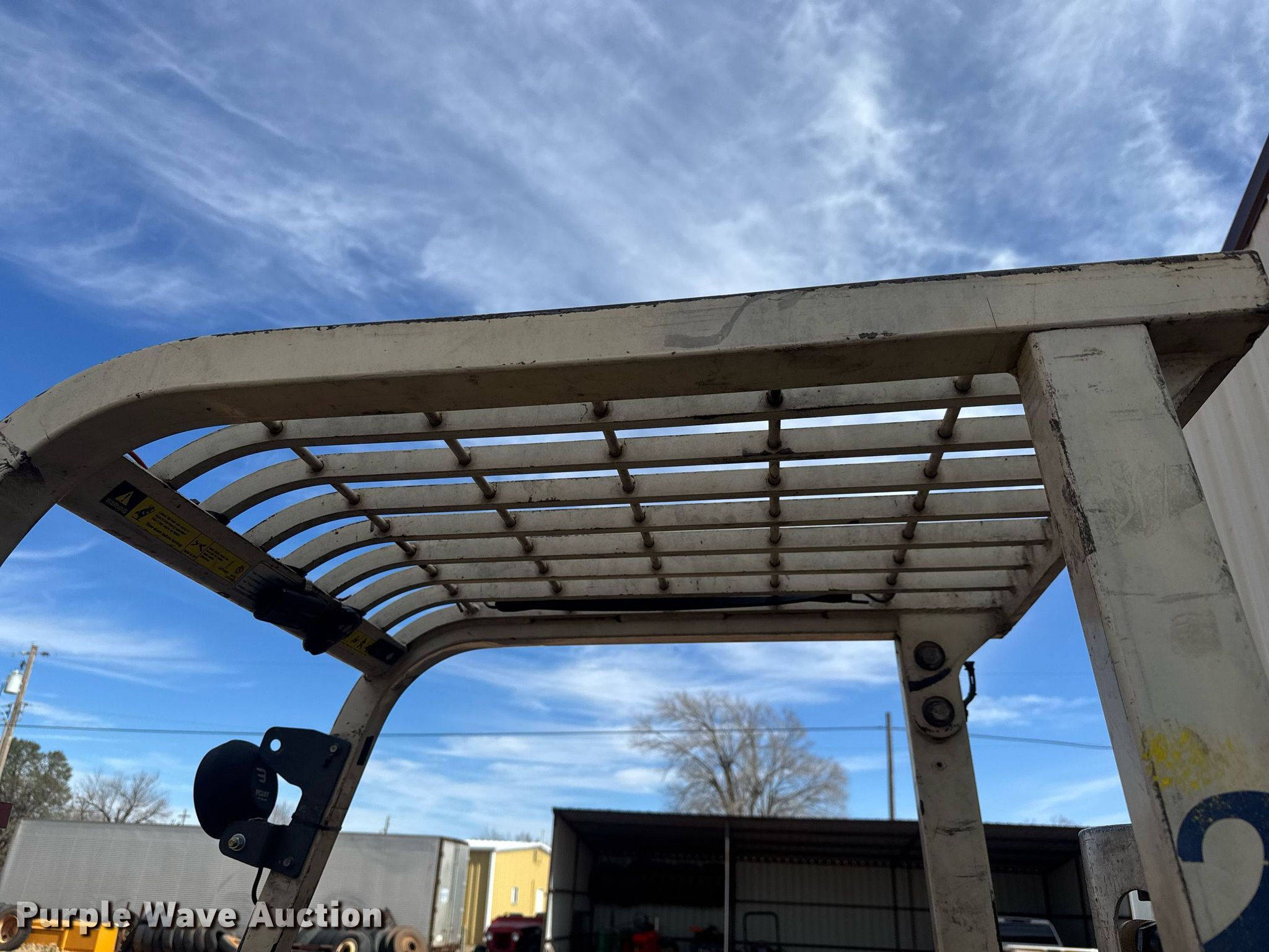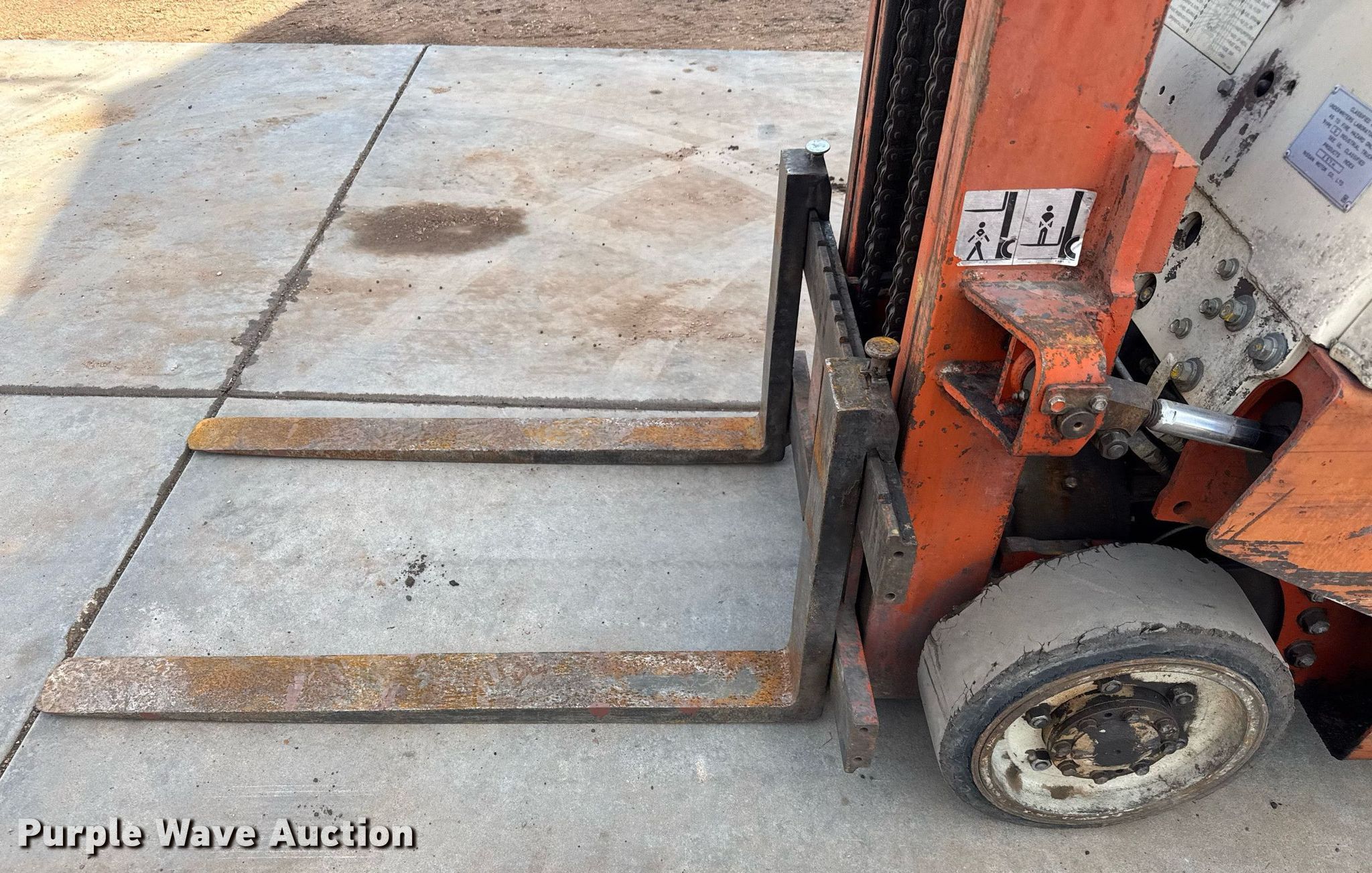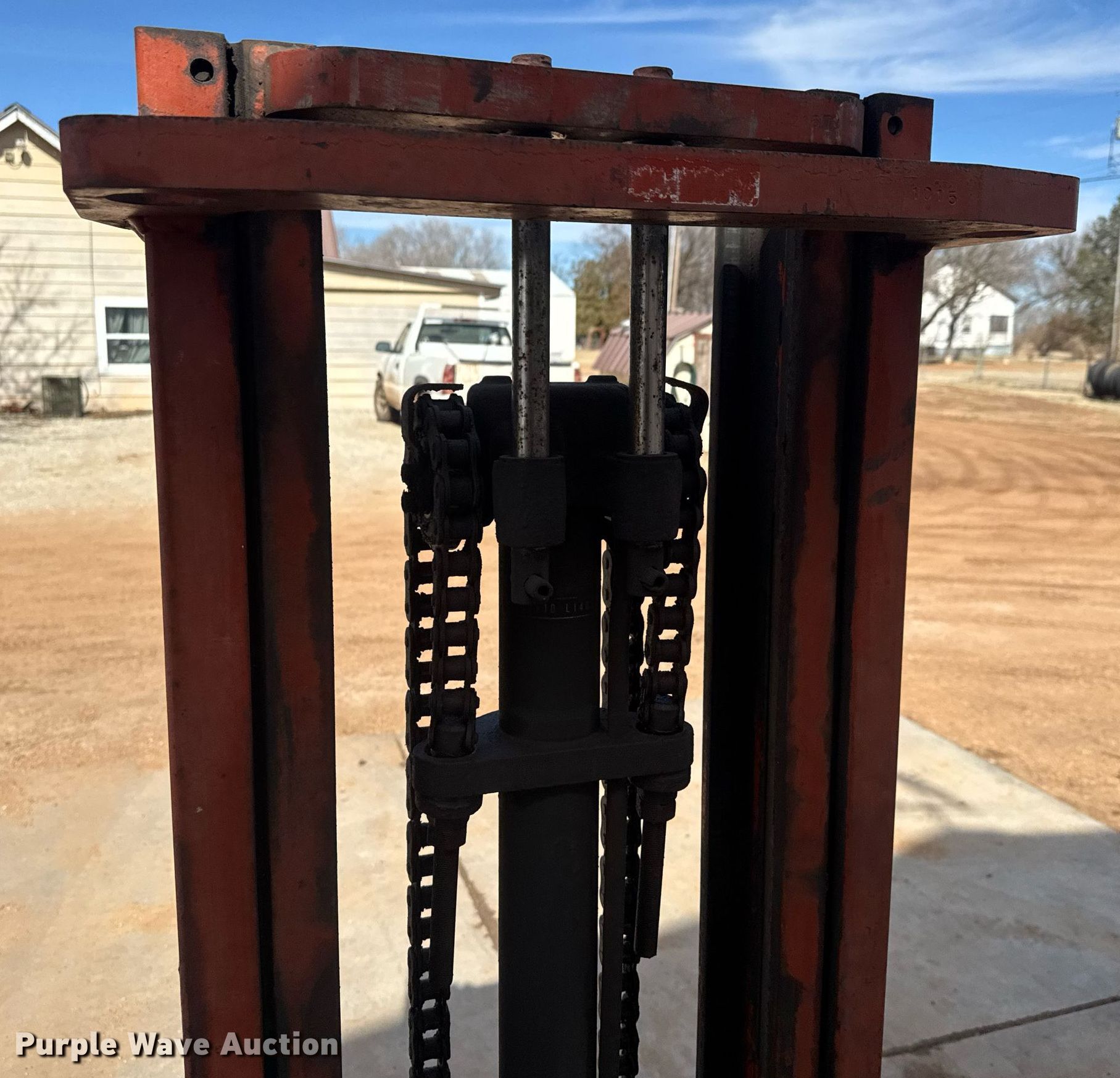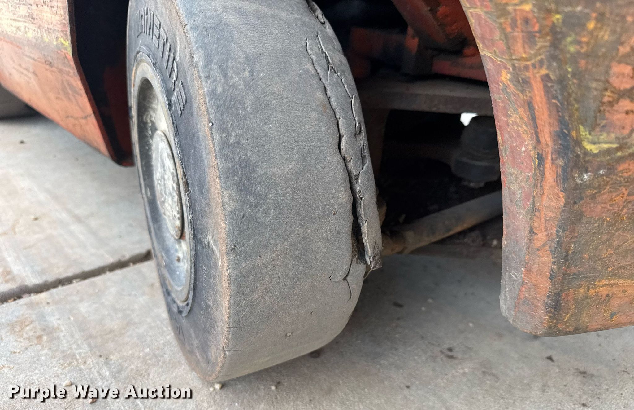 Datsun CF01 Type G forklift. Hours: 4,702 on meter, Serial: CF01-001094. Engine Nissan, Cylinders: 4, Fuel type: LPG LP bottle: Included. Transmission Powershift. Features Maximum lift capacity: 2,000 lbs, Maximum lift height: 106", Mast stages: 2, Mast tilt, Fork length: 42". Tires Size: 14x4.5x8, Solid. Murdock, KS 67111