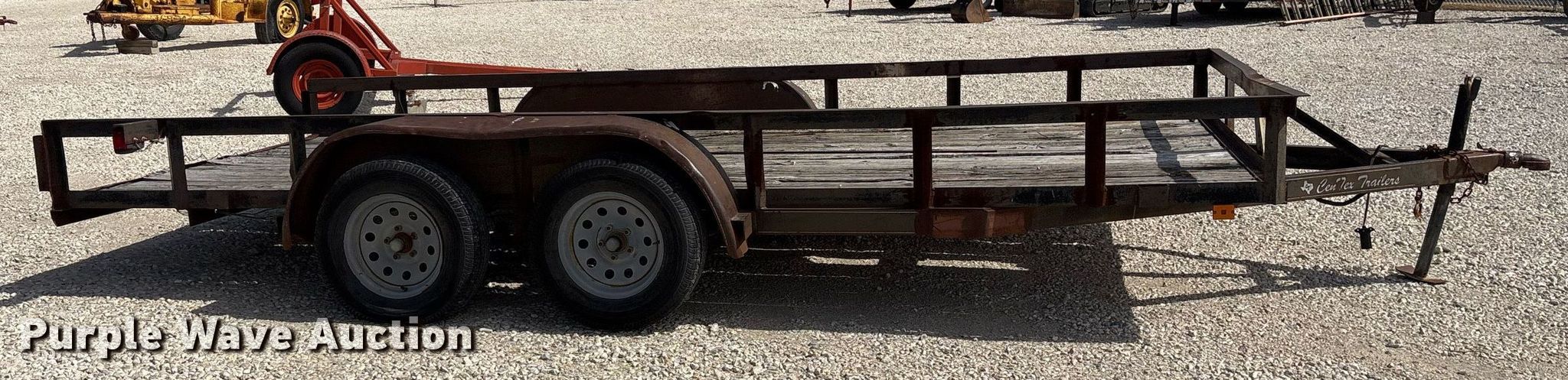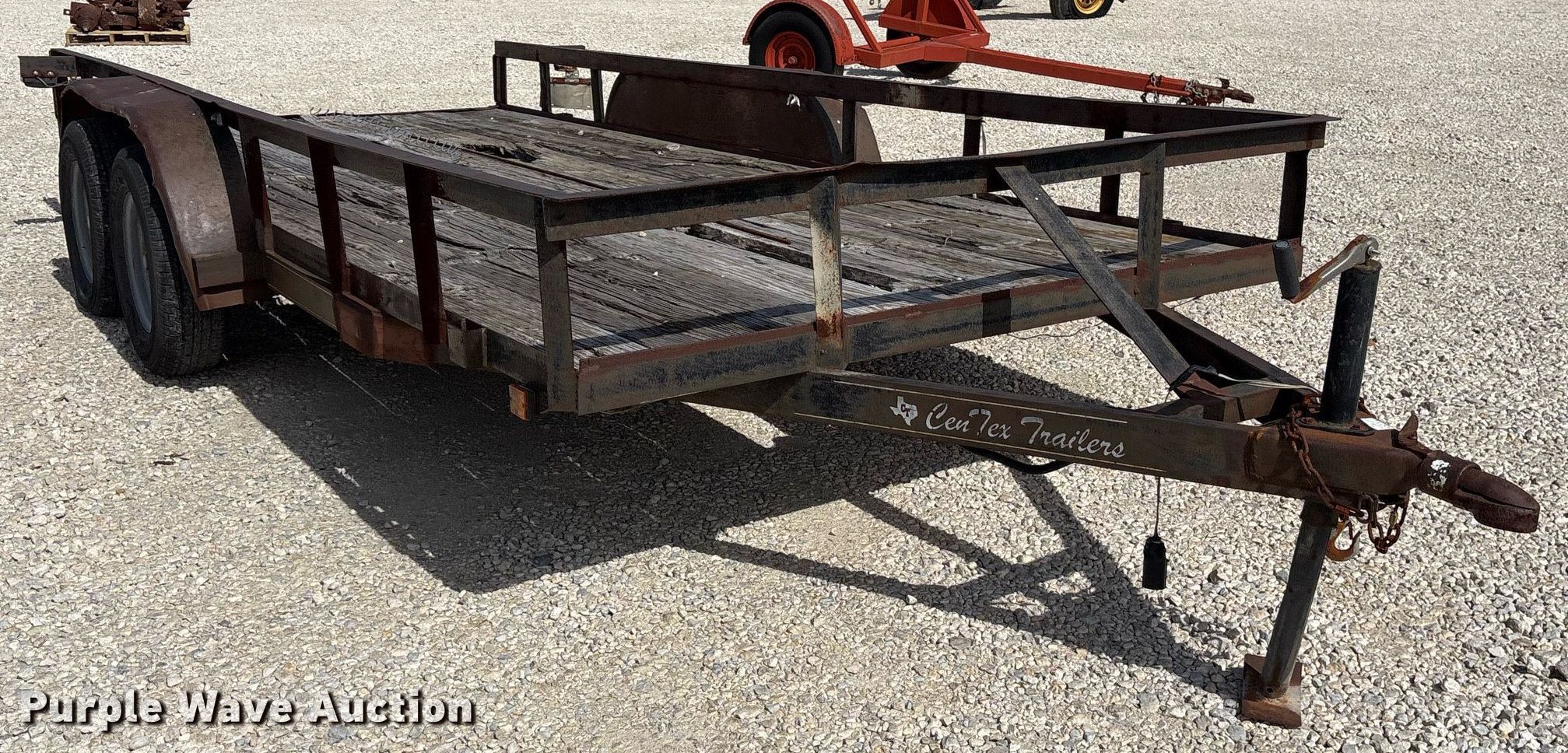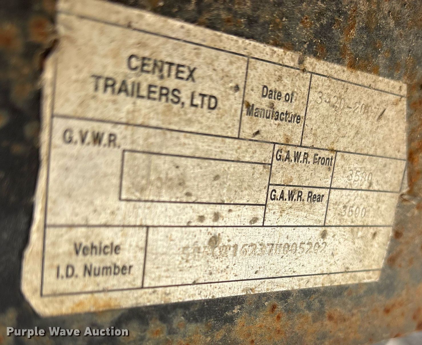 2007 CenTex utility trailer. VIN: 5RBCP16237H005202. Dimensions Overall: 20' L x 8' W, Deck: 16' L x 6' 5" W, Side height: 13", Deck height: 18". Features Deck type: Wood. Chassis Ball hitch: 2", Landing gear: Single, Suspension: Spring, Axles: Tandem, GVWR: 7,000 lbs, GAWR: 3,500 lbs. Tires Steel wheels, Size: ST205/75R15. Notes Deck boards damaged. Transfer of ownership documentation will be a bill of sale. Silas White Construction. Garland, TX 75042