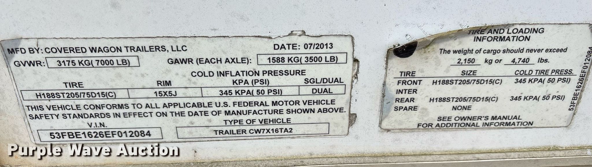Purple Wave is selling a used Enclosed Cargo Trailer in Oklahoma. This item is a 2014 Covered Wagon CW7X16TA2 enclosed cargo trailer with the following: VIN: 53FBE1626EF012084
