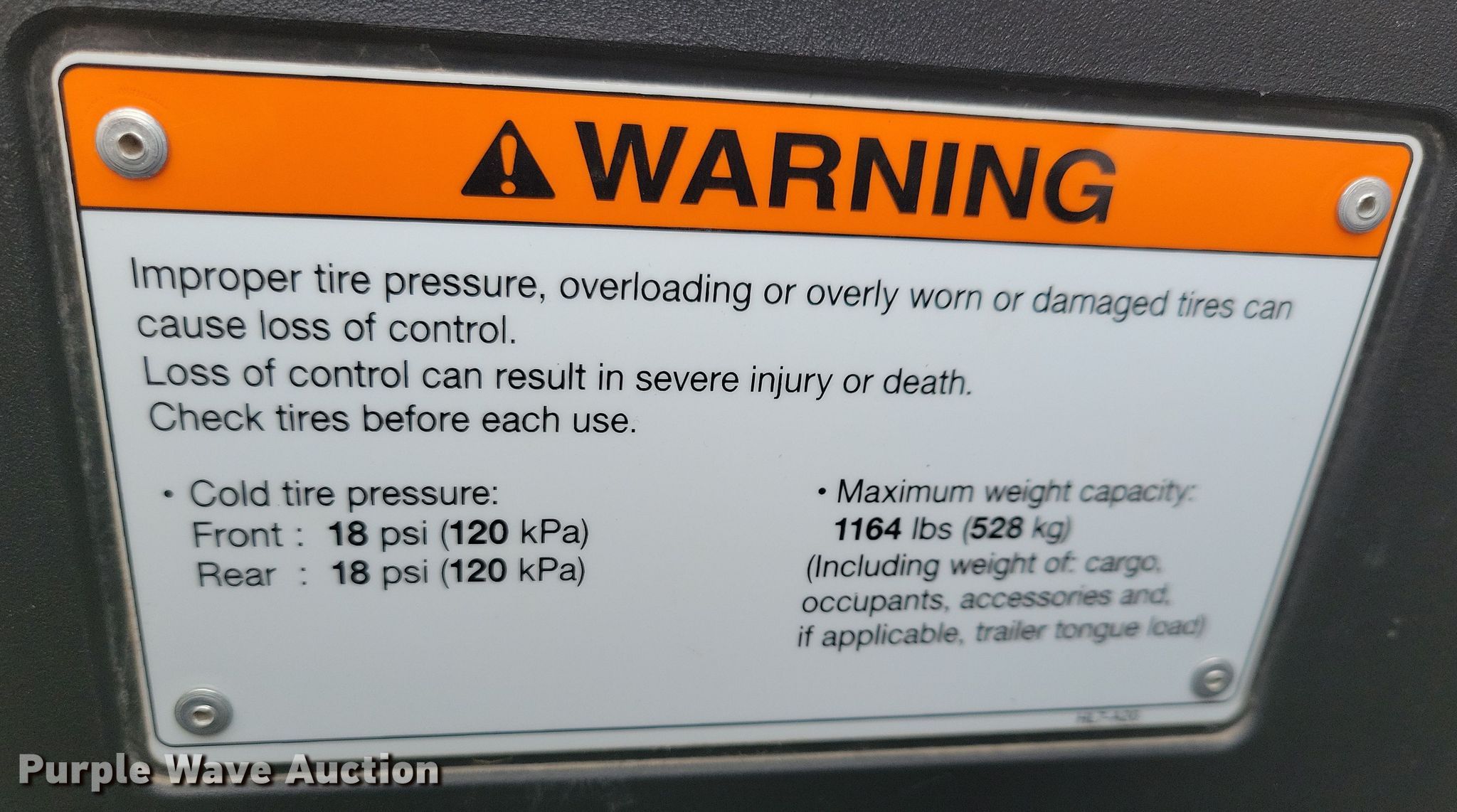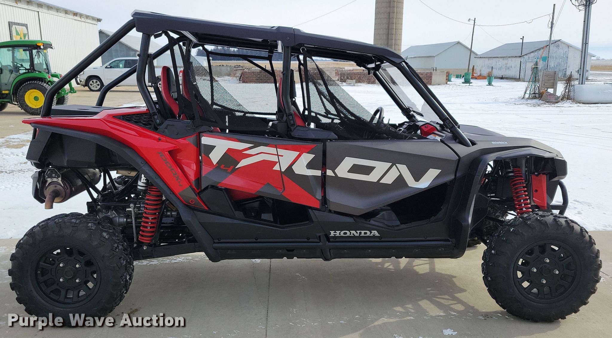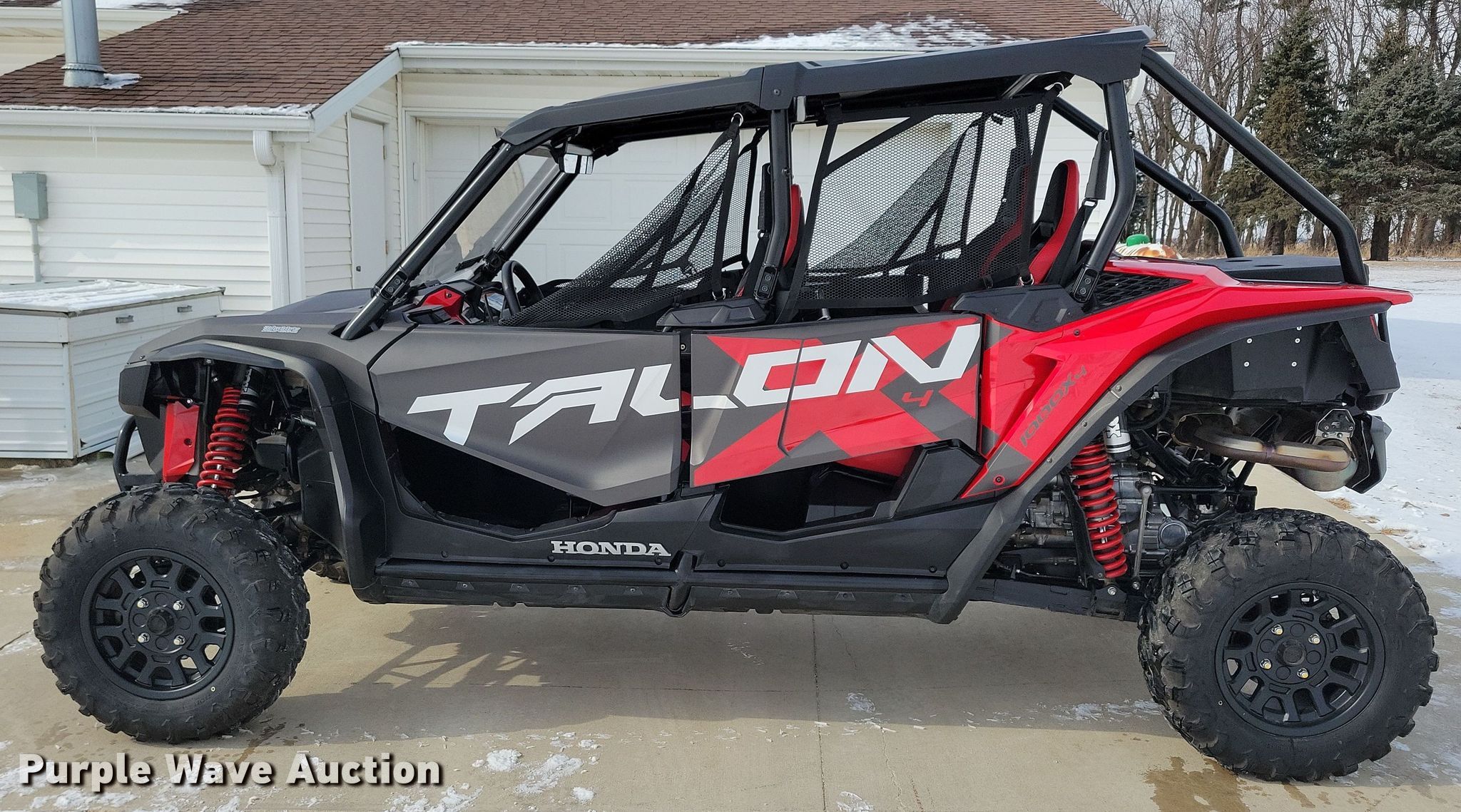 2020 Honda Talon 1000 X4 utility vehicle. Miles: 1,289 on odometer, Hours: 87 on meter, VIN: 1HFVE06A2L4000964. Engine Honda, Displacement: 999cc, Cylinders: 2, Fuel type: Gas, HP: 104, Electric start. Transmission Automatic. Chassis Four wheel drive/ All wheel drive. Operators station OROPS. Features Grille guard, Attachment Super ATV, Description: Storage cooler. Tires Front: 28X9R15, Rear: 28X11R15. Iowa off-highway title. Title distribution may be delayed up to 14 days from verification of funds. Johnson Farming. Osage, IA 50461