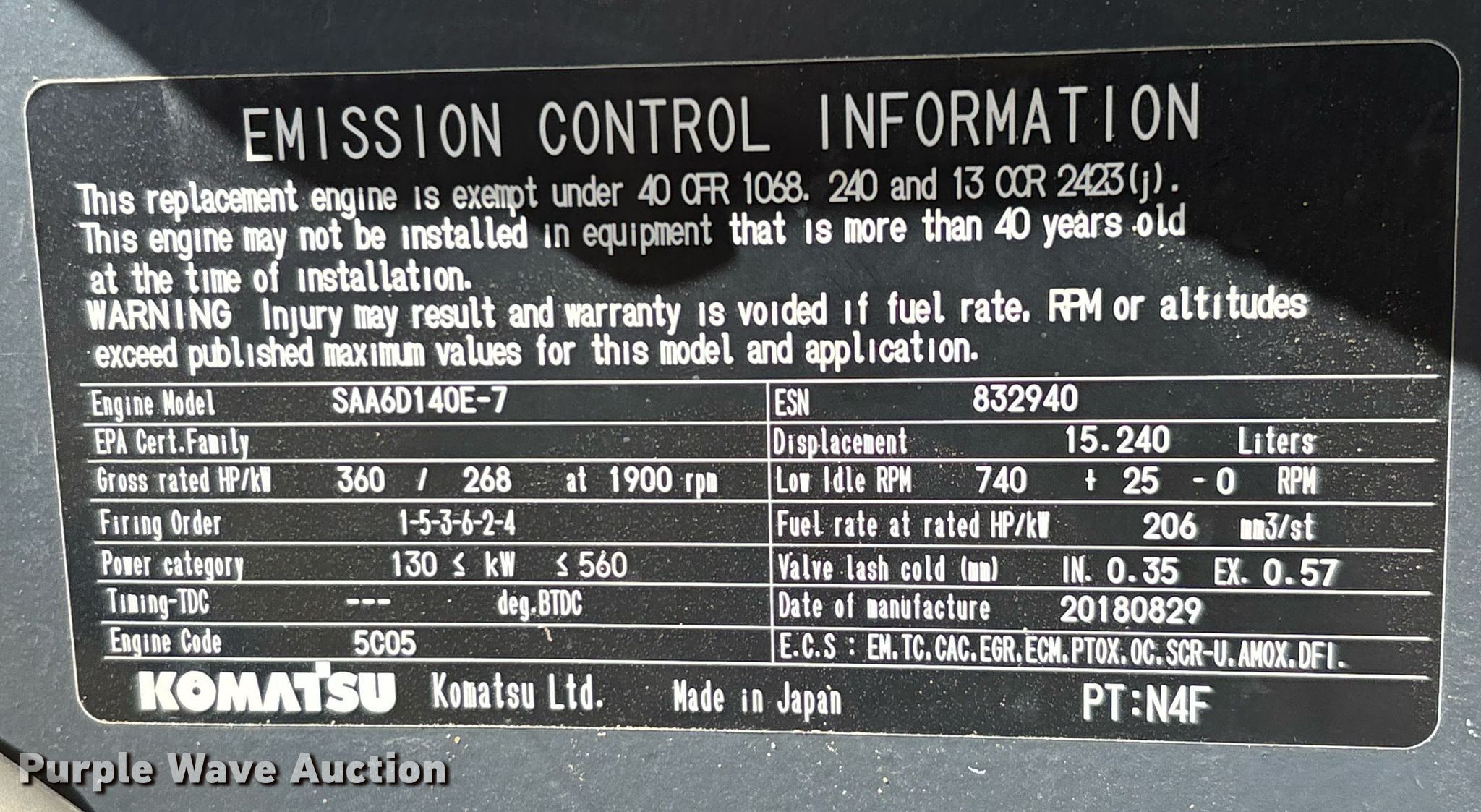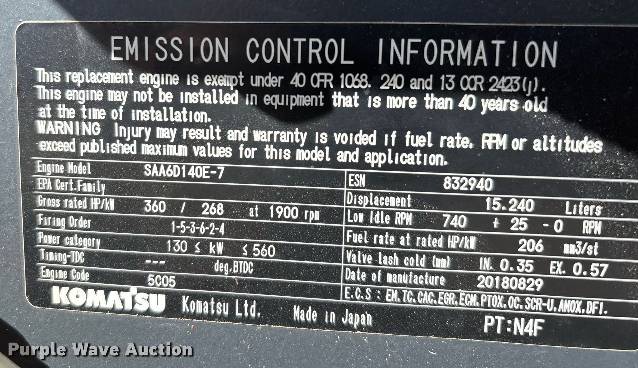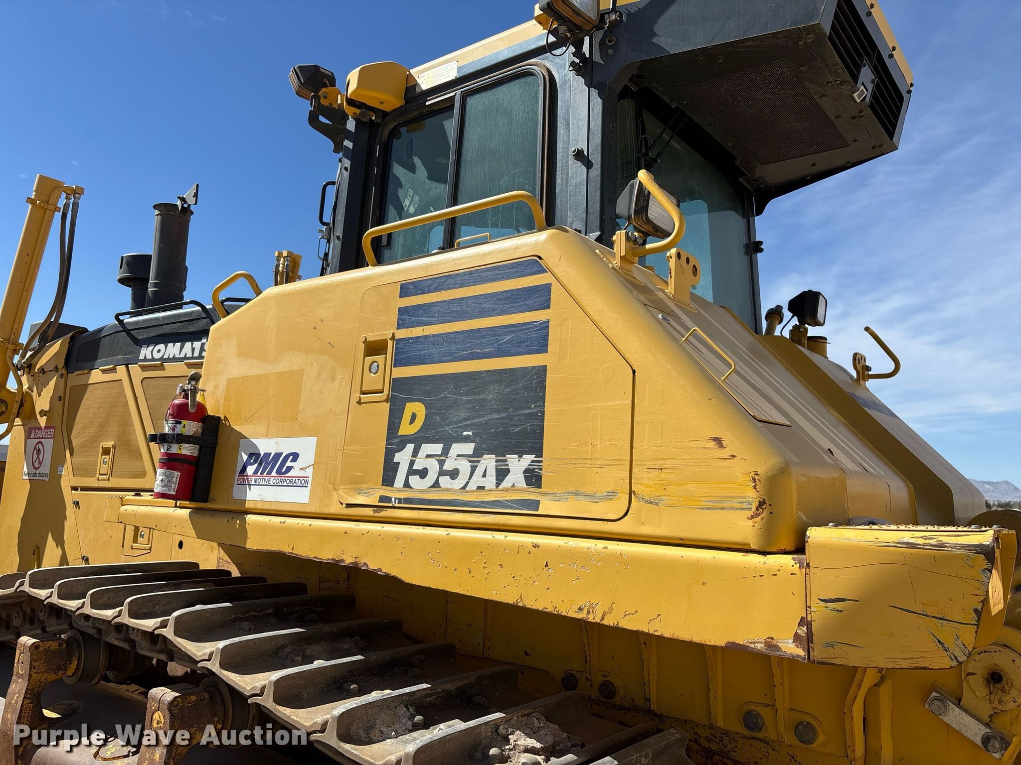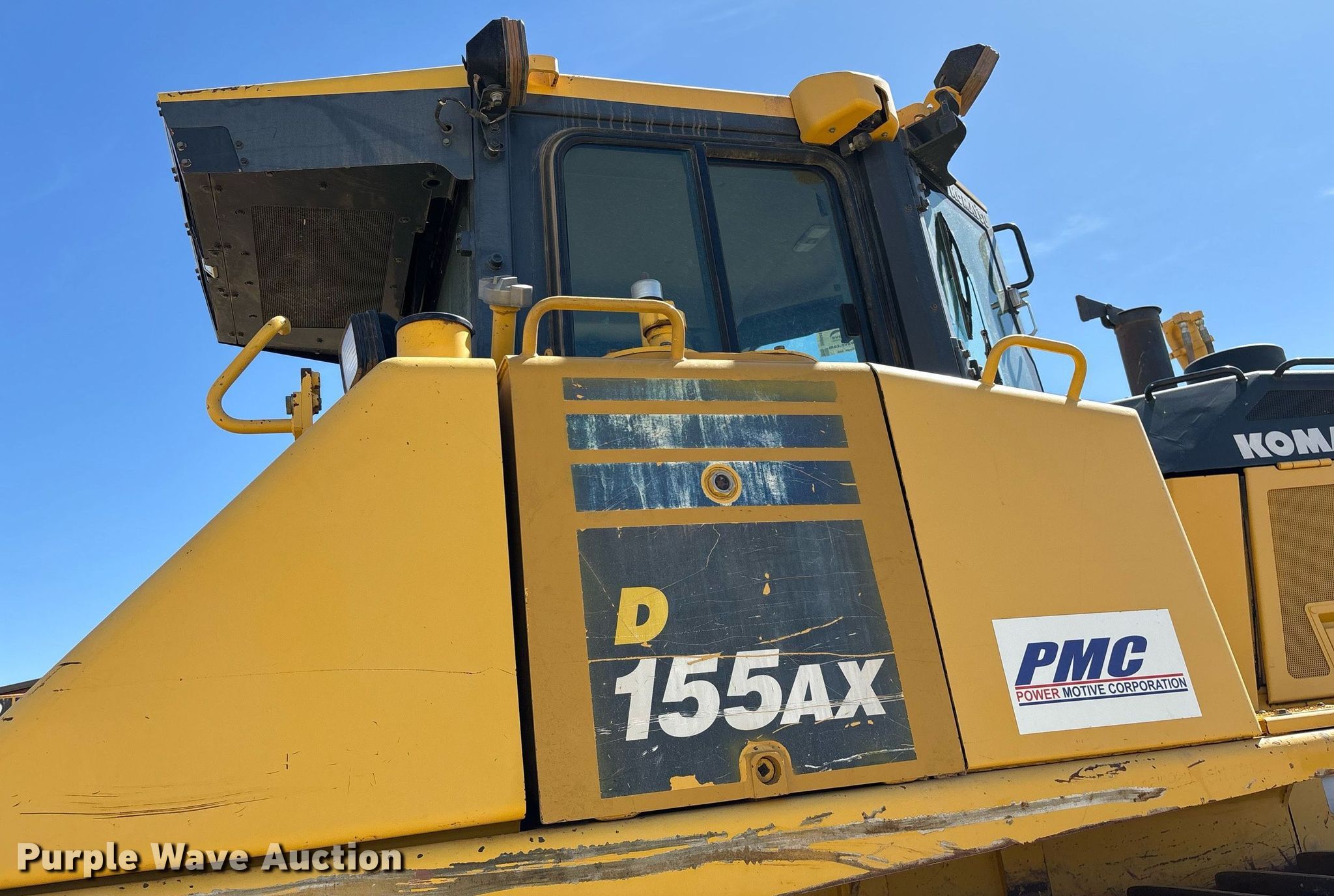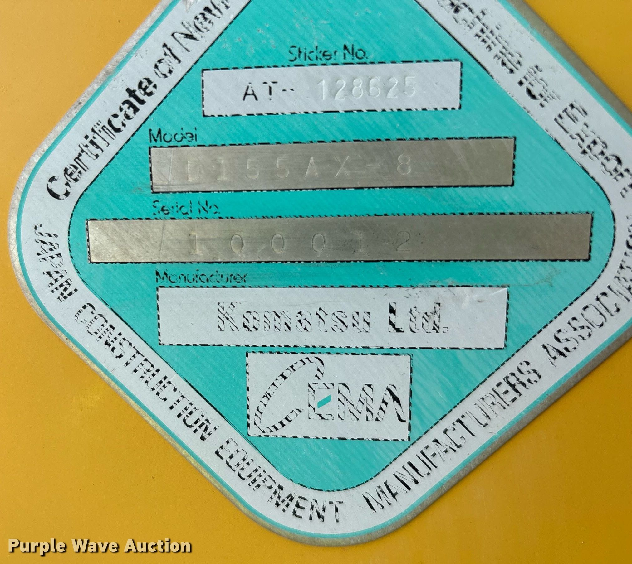 2015 Komatsu D155AX-8 dozer. Hours: 7,602 on meter, Serial: 100012. Engine Komatsu SAA6D140E-7, Serial: 832940, Displacement: 15.240L, Cylinders: 6, Fuel type: Diesel, HP: 360. Transmission Powershift, 3F - 3R. Operators station Enclosed cab, AC, Heat, Backup camera, Electronic Monitoring System panel, Steering: Joystick. Features Auxiliary hydraulics, Dozer blade Blade type: Single-tilt, Blade shape: Sigma, Width: 156", Capacity: 12.3 cu.yd, Attachments Ripper Komatsu 4DD05-R, Shanks: 1.. Tracks Width: 24", Grouser pads: Single, Bottom rollers: 5. Notes Dozer blade damaged, Unknown operating condition of backup camera. PMC Power Motive Corporation. El Paso, TX 79907