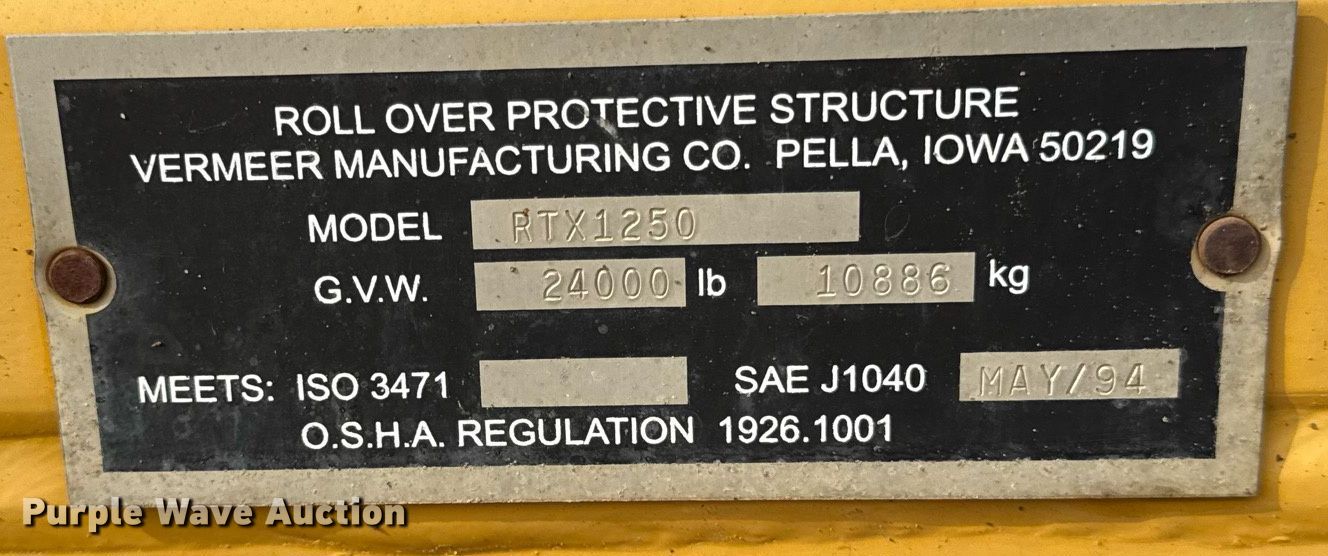 2010 Vermeer RTX1250 trencher. Hours: Unknown, Serial: 1VR6110R2A1000508. Engine Cummins, Cylinders: 4, Fuel type: Diesel. Transmission Hydrostatic, Two speed travel, Differential lock, Four wheel steer. Operators station OROPS. Features Trencher Model: TR1250, Estimated dig depth: 64", Cutting width: 10", Side shift, Teeth: Dirt, Hydraulic crumber, Backfill blade Width: 80". Tracks Width: 18", Rubber. Notes Hour meter replaced, Non-operational operators station hydraulic rotation. Equipment City LLC. Clinton, IL 61727