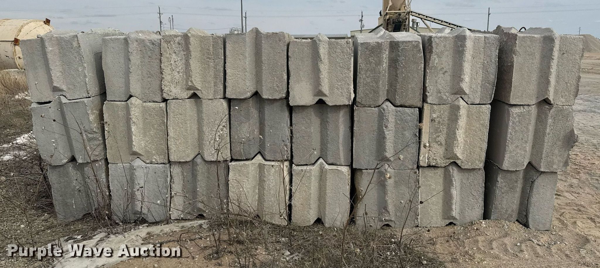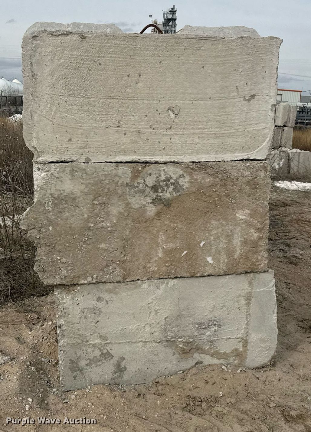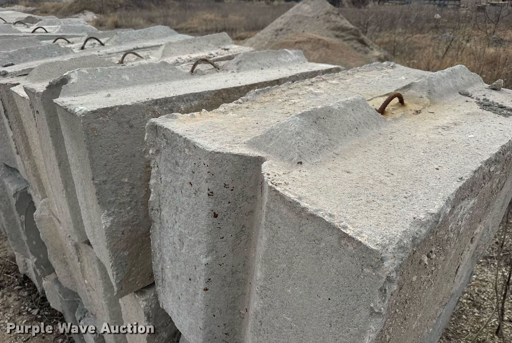 Purple Wave is selling a used Building Materials in Kansas. This item is a (24) concrete edge bunker blocks with the following: 2' x 2' x 4', Rebar lift eyelet, Keyed, Finish and condition may vary, Color: Grey, Approx. 2,100 lbs per block