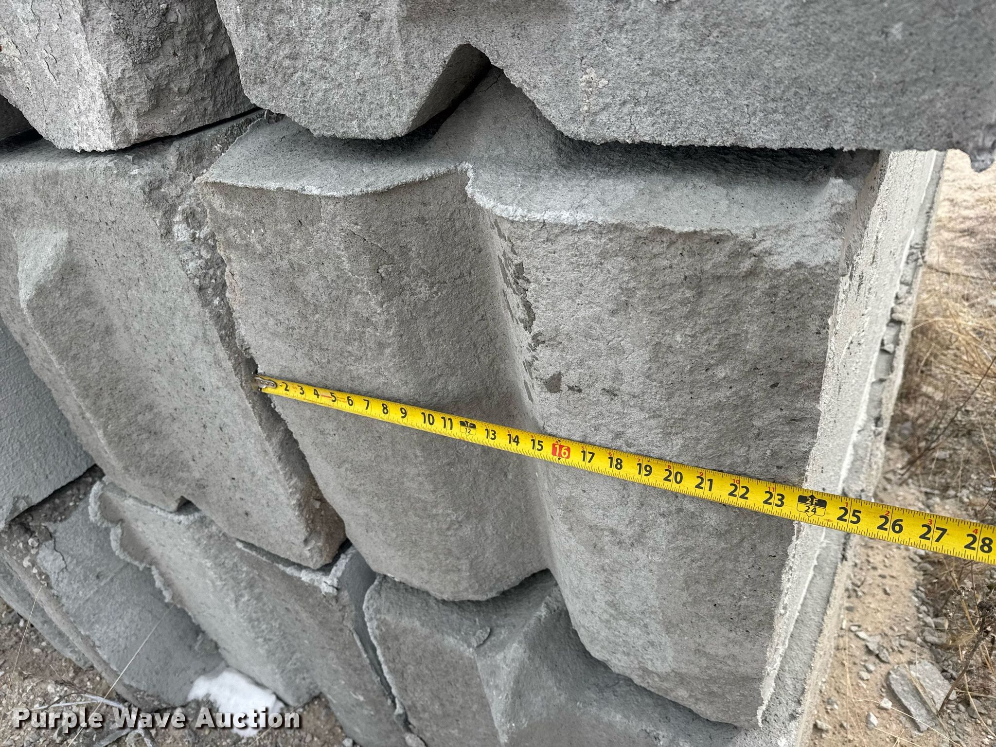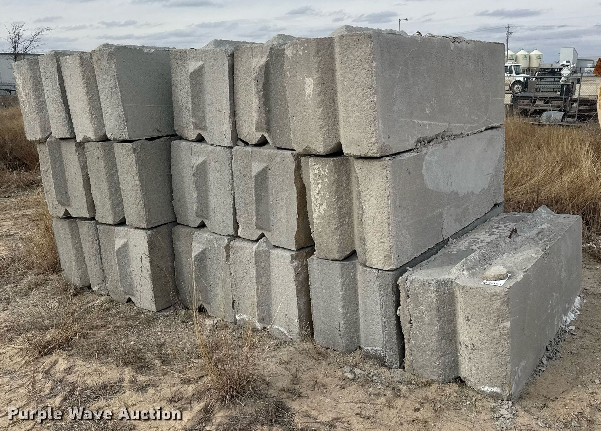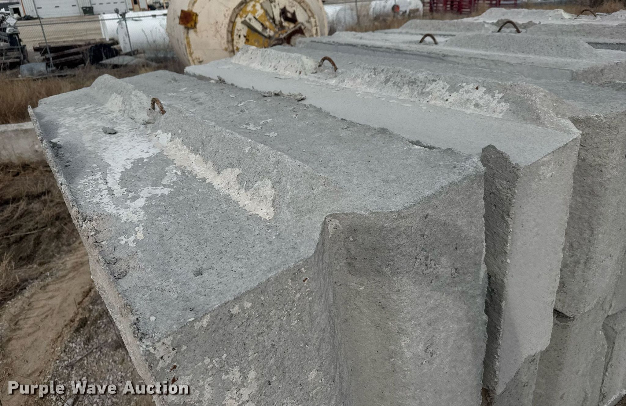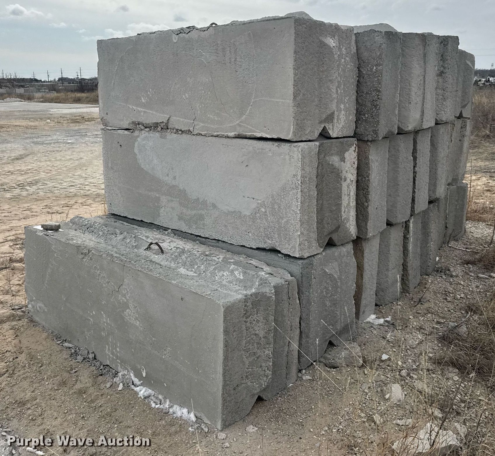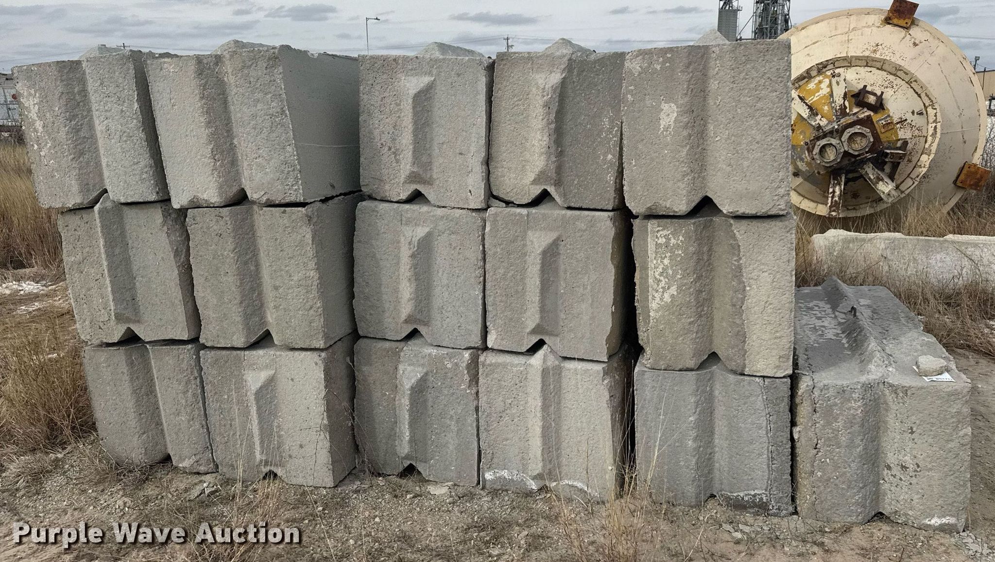 Purple Wave is selling a used Building Materials in Kansas. This item is a (16) concrete edge bunker blocks with the following: 2' x 2' x 6', Rebar lift eyelet, Keyed, Finish and condition may vary, Color: Grey, Approx. 3,200 lbs per block