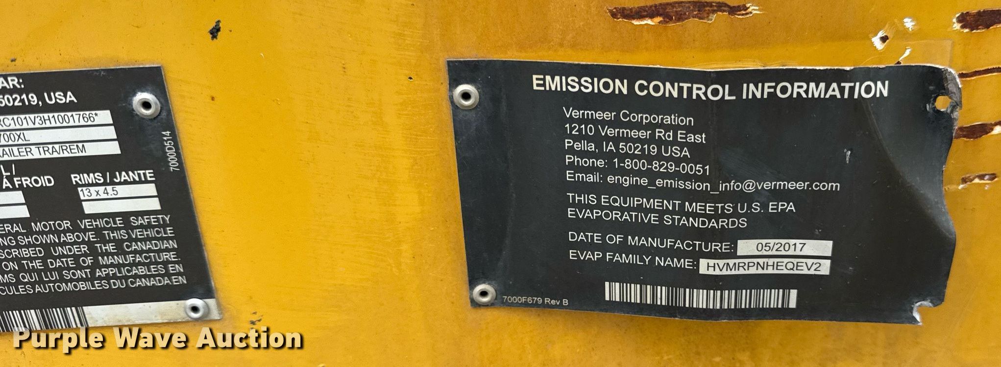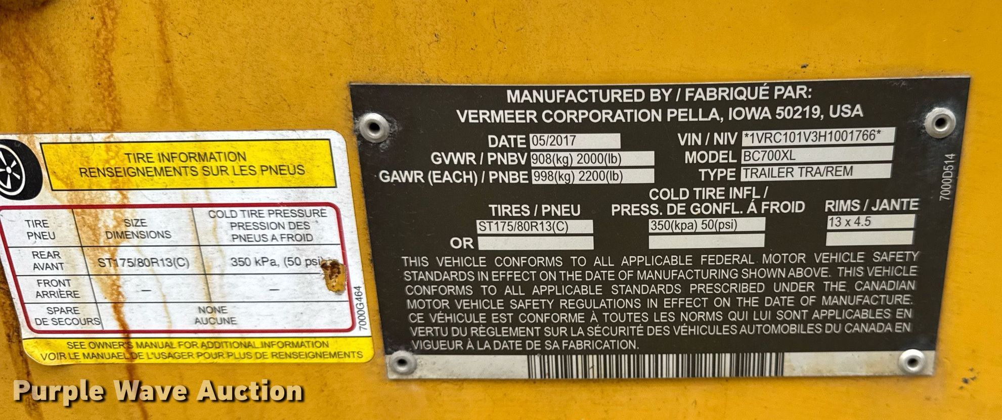 Purple Wave is selling a used Wood Chipper or Stump Grinder in Illinois. This item is a 2017 Vermeer BC700XL wood chipper with the following: Hours: 441 on meter, Serial: 1VRC101V3H1001766