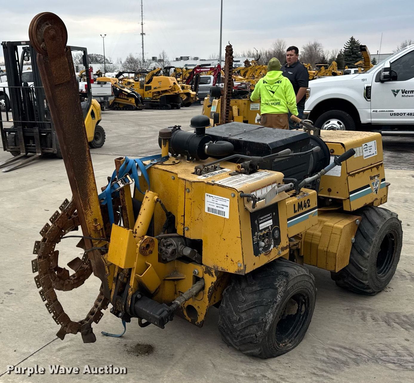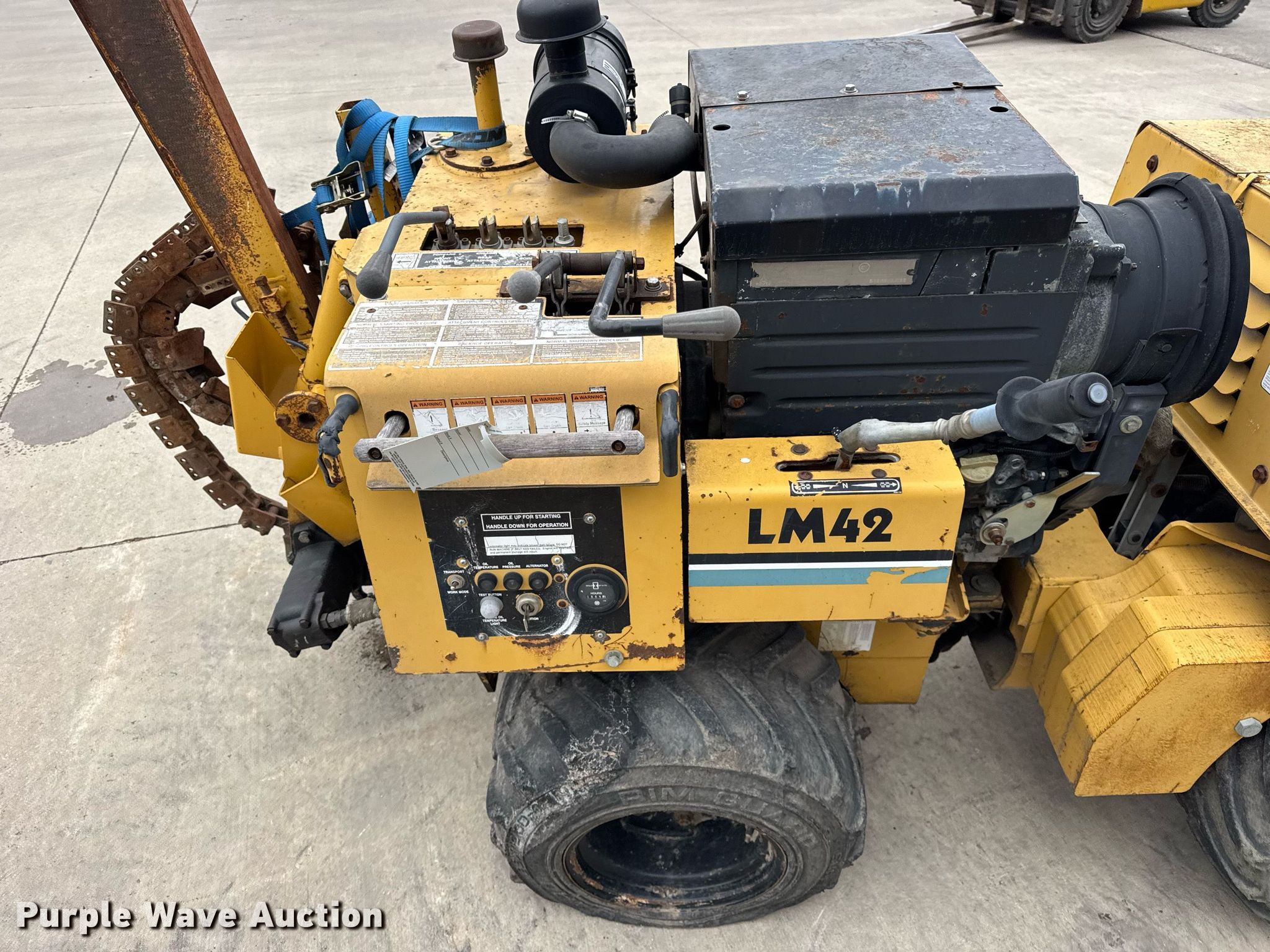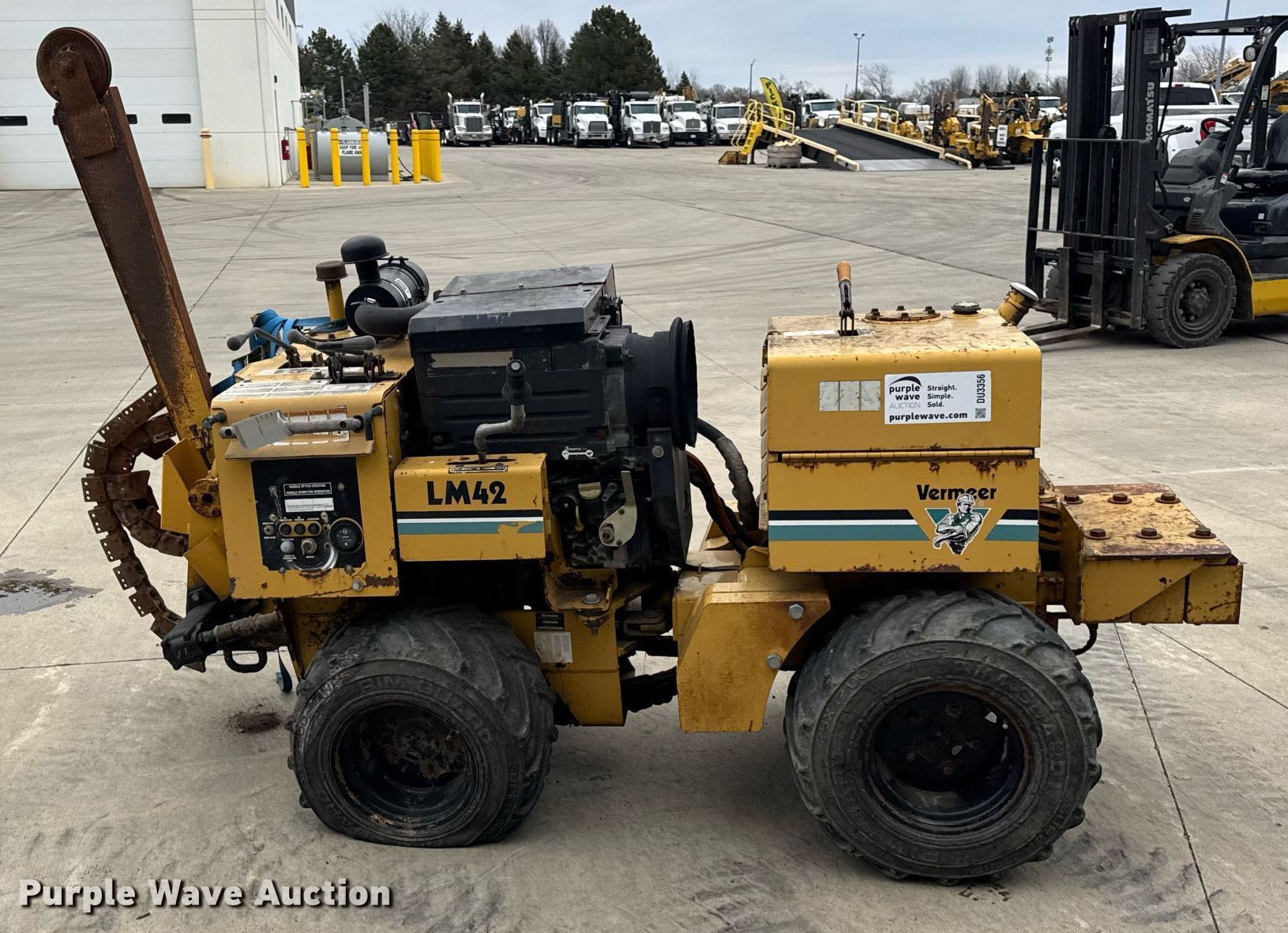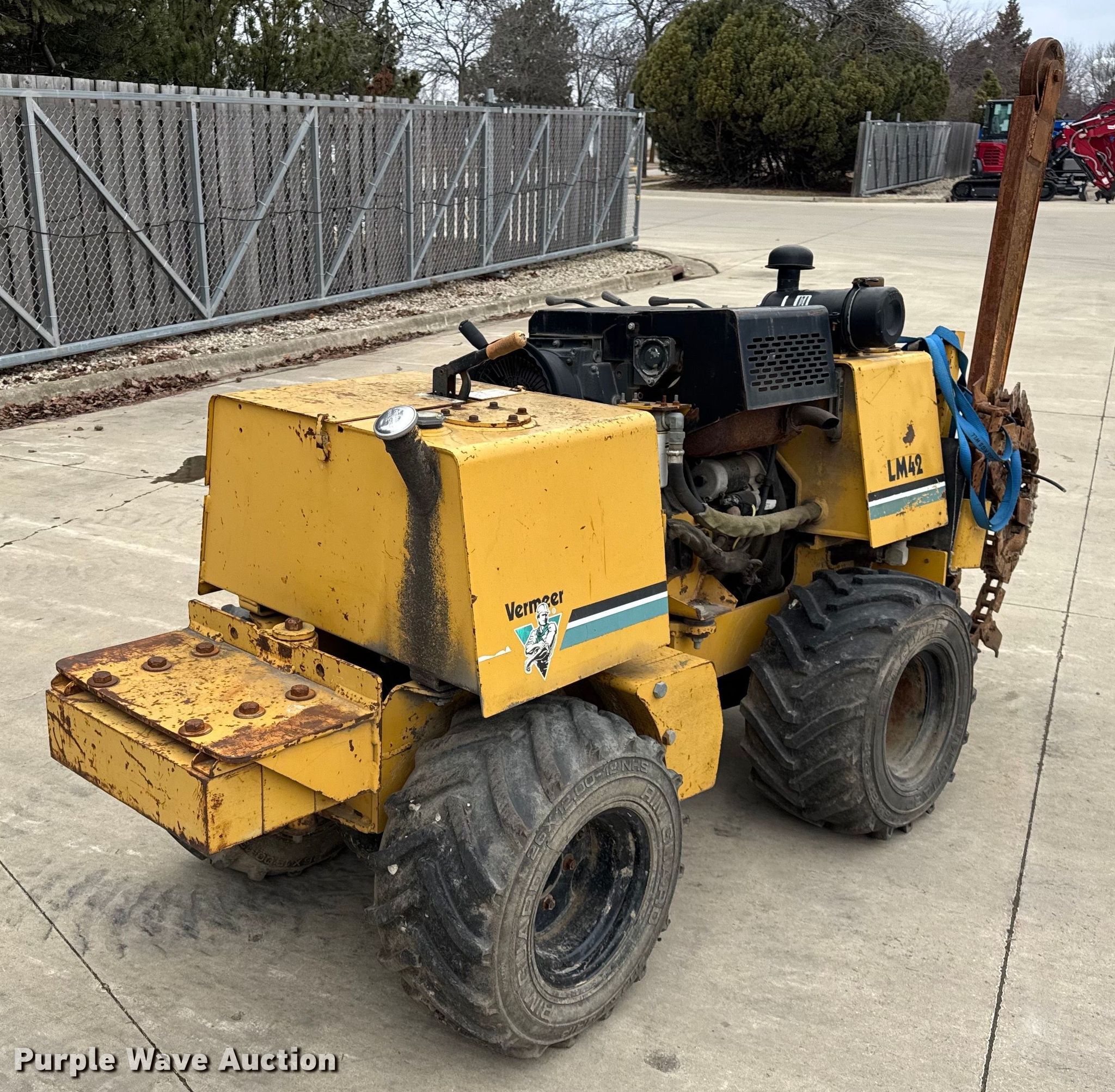 2004 Vermeer LM42 trencher. Hours: 1,864 on meter, Serial: 1VRM112L241002456. Engine Deutz F3L 1011F, Cylinders: 3, Fuel type: Diesel. Transmission Hydrostatic, Four wheel drive. Features Trencher Estimated dig depth: 48", Cutting width: 5". Tires Size: 26x12.00-12. Notes Dead battery, Chain removed, but included, Flat tire, Non-operational unit. Vermeer Midwest. Aurora, IL 60502