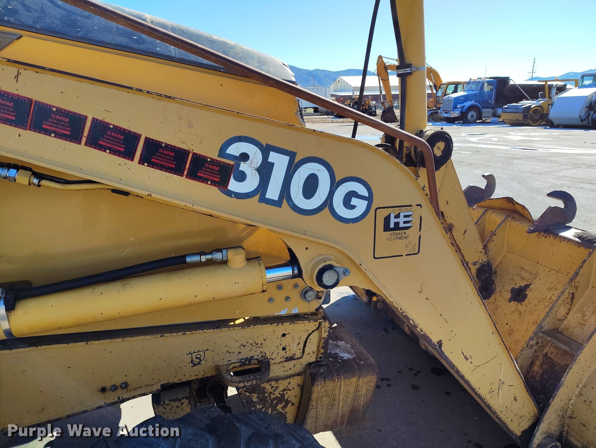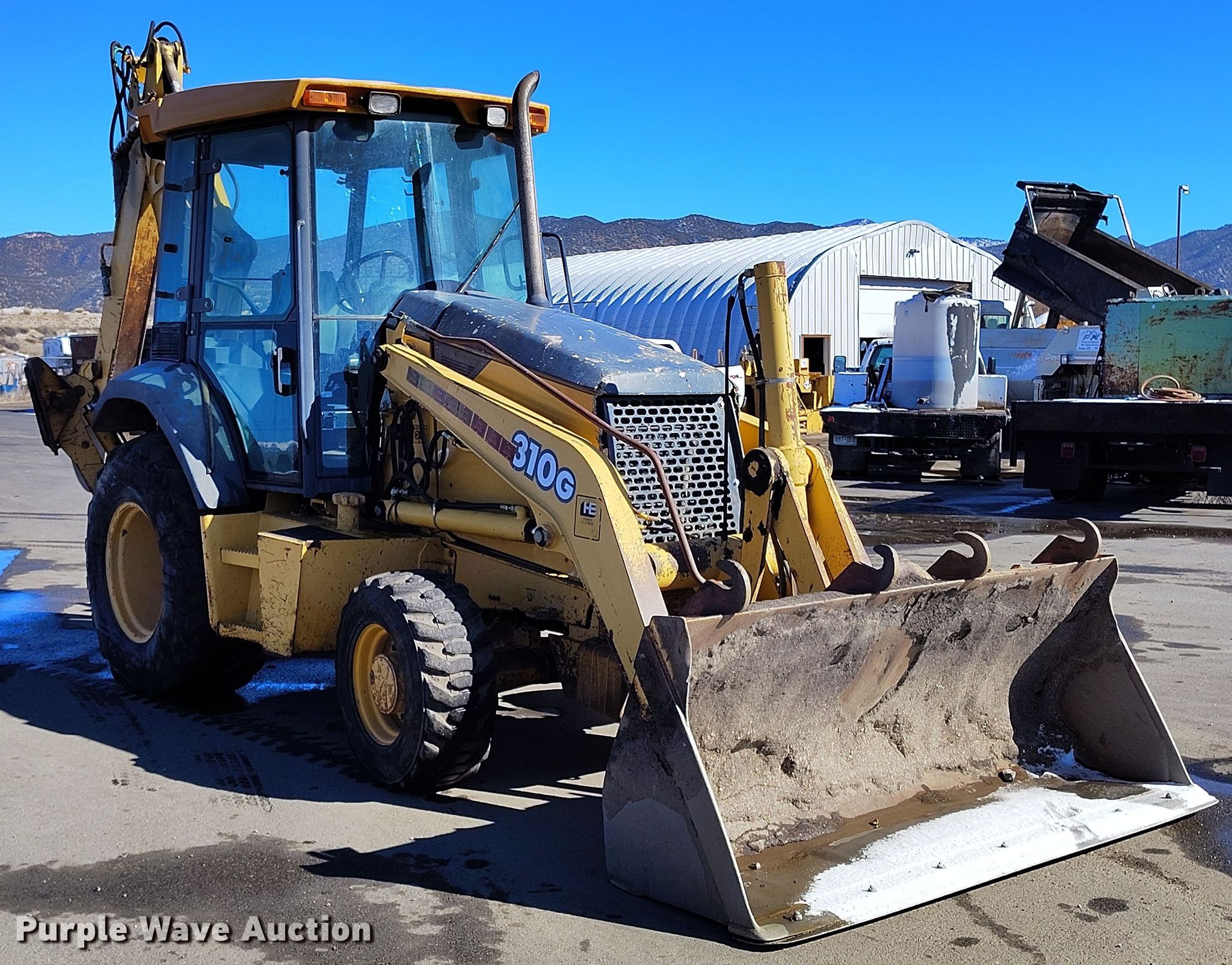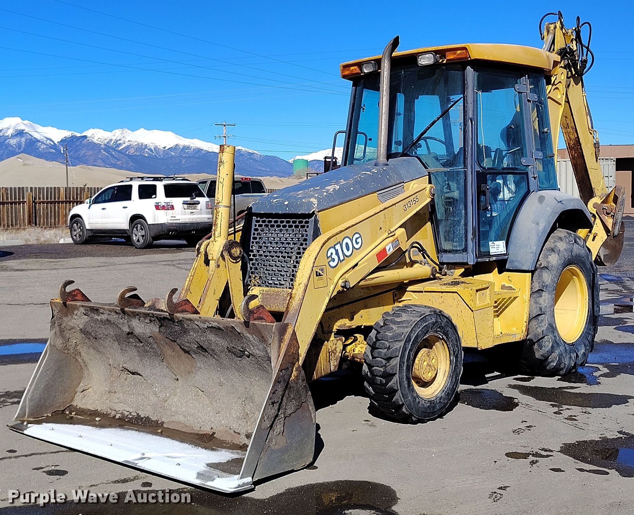 2001 John Deere 310G backhoe. Hours: 6,988 on meter, Serial: T0310GX897538. Engine John Deere, Displacement: 4.5L, Cylinders: 4, Fuel type: Diesel, kW: 58. Transmission Shuttle shift, 4F - 4R. Chassis Four wheel drive, Differential lock. Operators station Enclosed cab, Heat, Backhoe controls: Wobble stick / two stick. Features Loader Bucket John Deere, Capacity: 1.12 cu.yd., Width: 84", Cutting edge: Bolt-on, Backhoe Extendable stick, Auxiliary hydraulics, Bucket Width: 24", Teeth: 5.. Tires Front: 12-16.5, Rear: 19.5L-24. Pavement Maintenance Services, Inc.. Salida, CO 81201