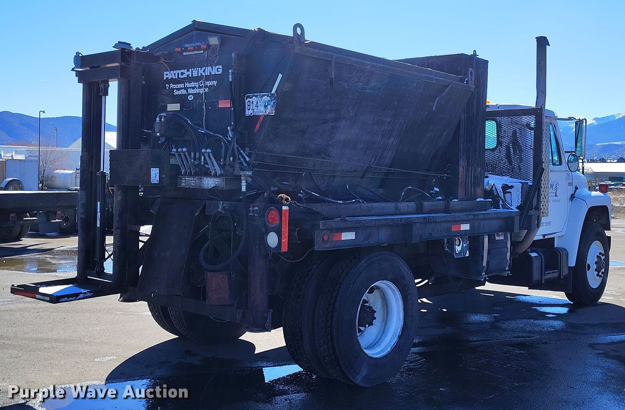 1986 International 1754 pothole patcher truck. Miles: 216,185 on odometer, VIN: 1HTLCHXP2GHA18670. Engine Cummins 6CT8.3, Serial: 30408765, Displacement: 8.3L, Cylinders: 6, Fuel type: Diesel, HP: 210. Transmission Manual, Speed: 5, plus 2. Chassis Axles: Single, Suspension: Spring, Brakes: Hydraulic, PTO. Features Bed / tank Patch King, 13' L x 96" W, Heater Diesel. Tires Size: 11R22.5. Notes Windshield chipped or cracked. Colorado title. Title distribution may be delayed up to 14 days from verification of funds. Pavement Maintenance Services, Inc.. Salida, CO 81201