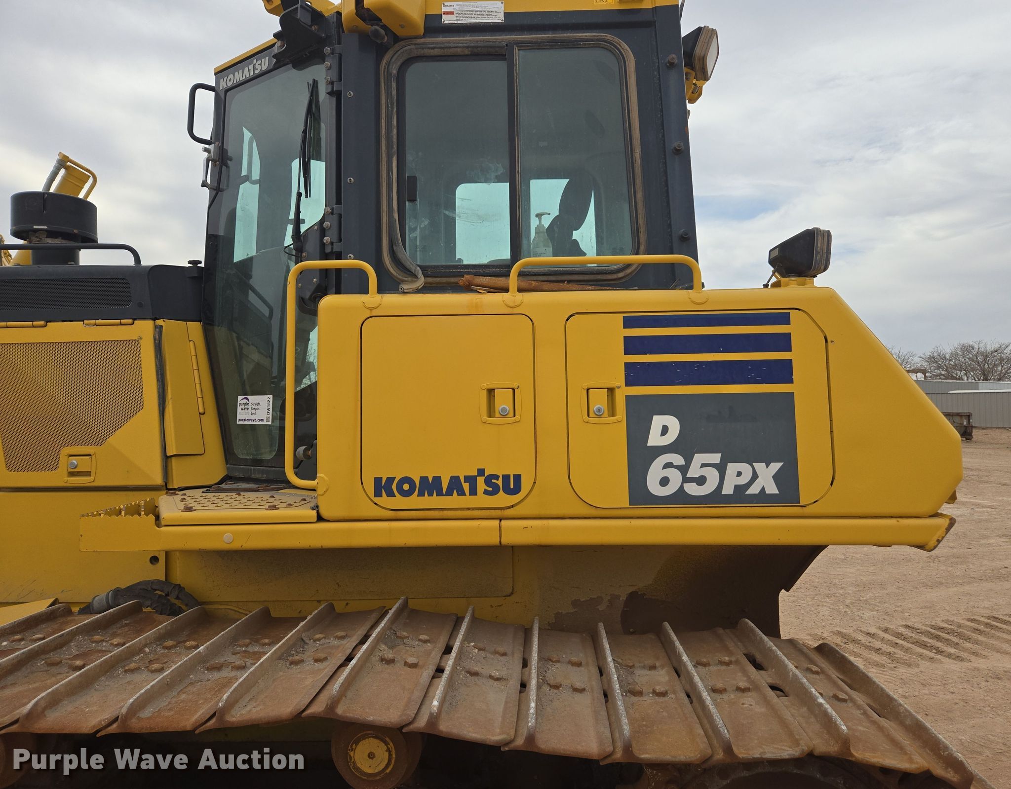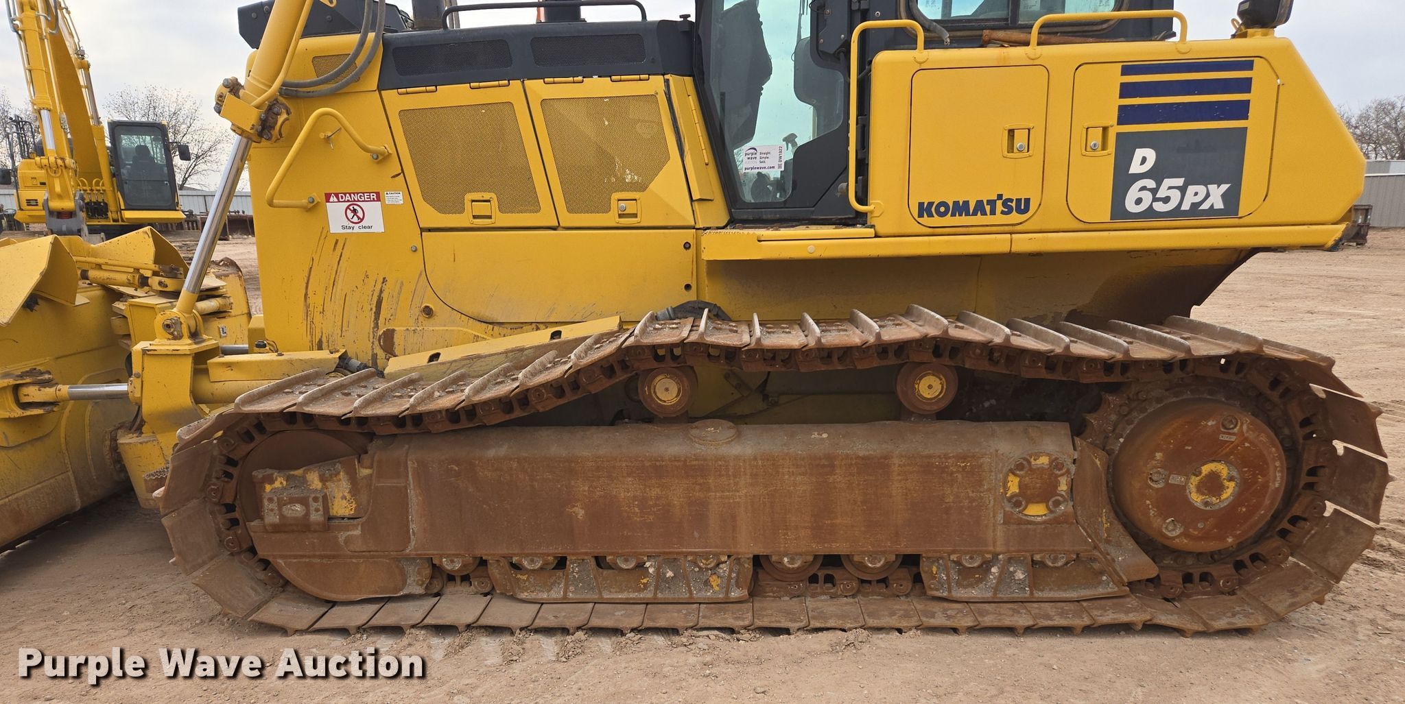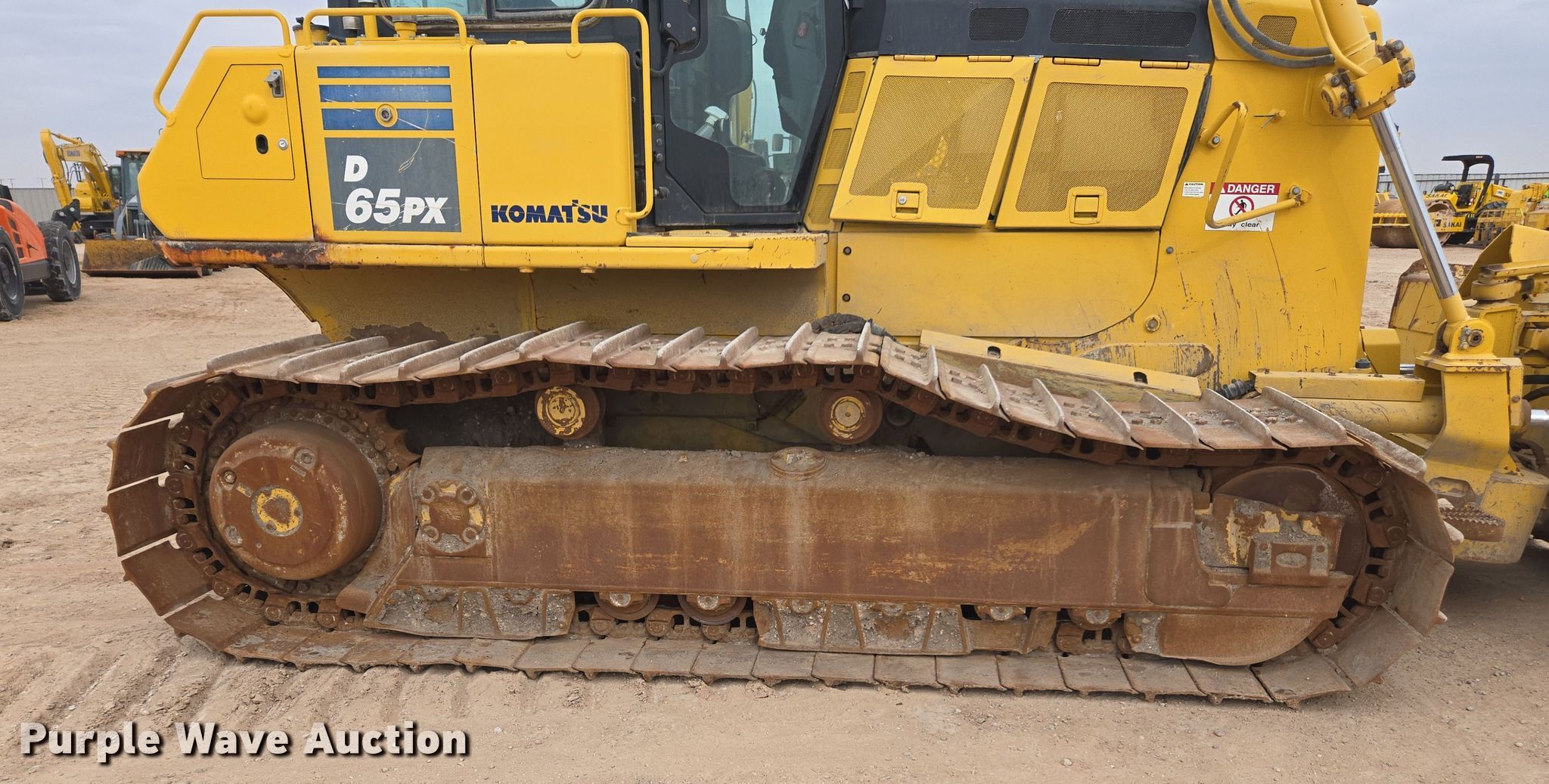 2019 Komatsu D65PX-18 dozer. Hours: 7,754 on meter, Serial: KMT0D127HKA092106. Engine Komatsu, Cylinders: 6, Fuel type: Diesel. Transmission Powershift, 3F - 3R. Operators station Enclosed cab, AC, Heat, Backup camera, Electronic Monitoring System panel, Steering: Joystick. Features Dozer blade Blade type: 6-way, Blade shape: Straight, Width: 156". Tracks Width: 29", Grouser pads: Single, Bottom rollers: 8. Notes Hood latch issues. PMC Power Motive Corporation - Open Inspection March 19 & 26. Carlsbad, NM 88220