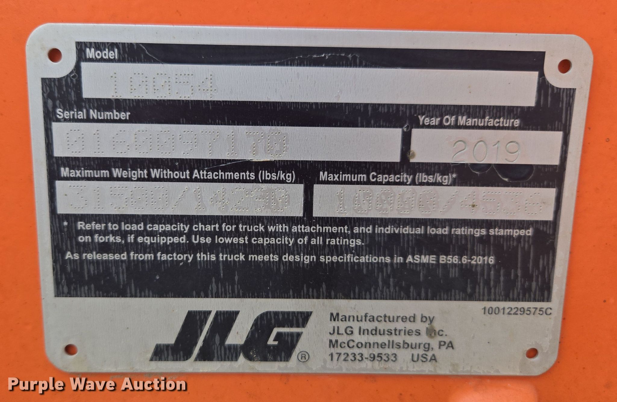 2019 JLG 10054 telehandler. Hours: 3,766 on meter, Serial: 0160097170. Engine Cummins, Cylinders: 4, Fuel type: Diesel. Transmission Powershift, 4F - 4R, Four wheel drive. Operators station OROPS, Steering: Crab, Four wheel. Features Maximum lift capacity: 10,000 lbs, Maximum lift height: 54', Boom stages: 4, Fork length: 72", Auxiliary hydraulics, Hydraulic outriggers, Hydraulic leveling, Quick attach: Manual. Tires Size: 400/75-28, Foam filled. View repairs. PMC Power Motive Corporation - Open Inspection March 19 & 26. Carlsbad, NM 88220