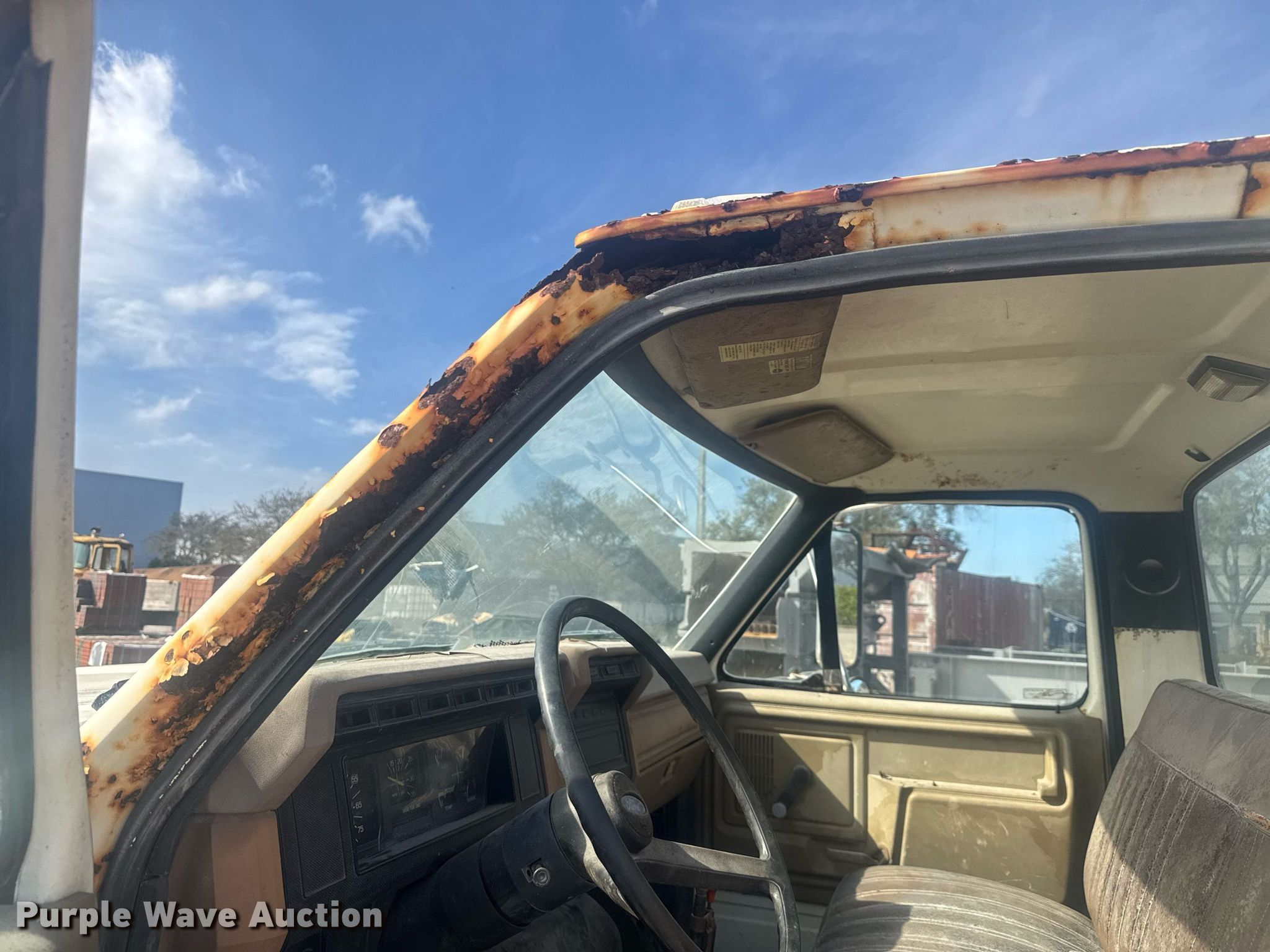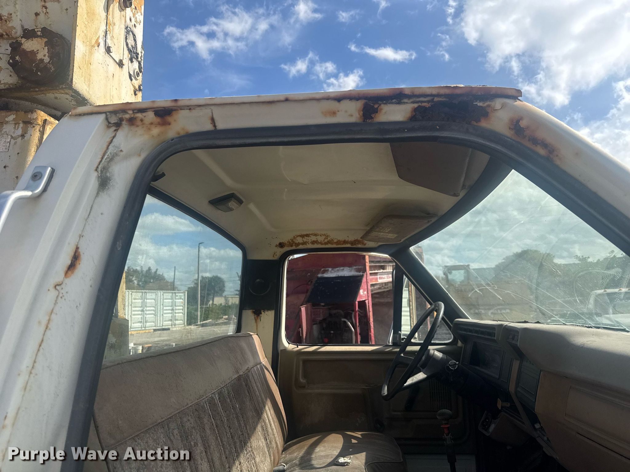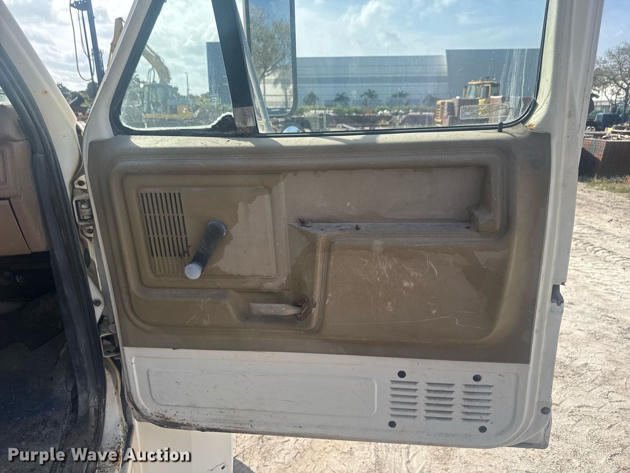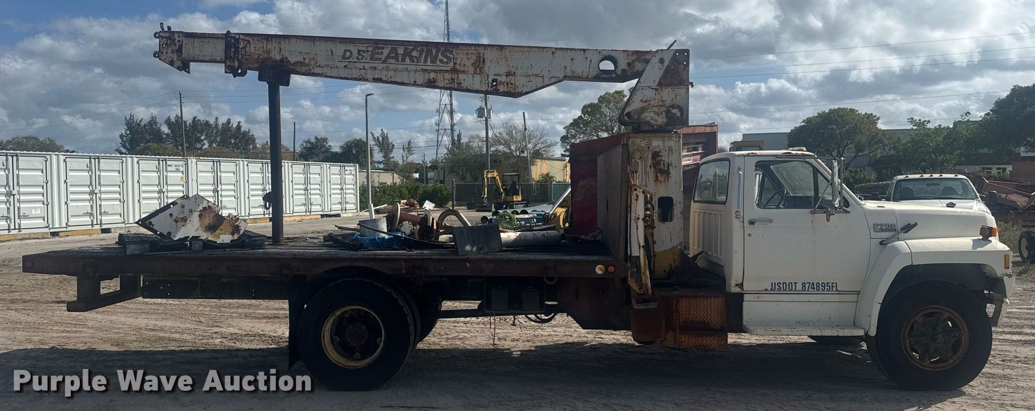 1987 Ford F700 crane truck. Miles: 55,177 on odometer, Hours: 6,587 on meter, VIN: 1FDPT74P2HVA49376. Engine Ford 170F, Serial: HFMO6.6EAA7-DI, Displacement: 6.6L, Cylinders: 6, Fuel type: Diesel. Transmission Ford, Manual, Speed: 5, plus 2. Chassis Axles: Single, Suspension: Spring, Brakes: Hydraulic, PTO, GVWR: 28,000 lbs. Features Flatbed 18' L x 96" W, Crane Boom Telescopic, Sections: 2, Boom controls Ground, Sheaves: 1, Crane ball & hook. Tires Size: 11R22.5. Notes Non-operational boom, parts may be missing, Non-operational outriggers. Florida title. Title distribution may be delayed up to 30 days from verification of funds. D.S. Eakins. West Palm Beach, FL 33403