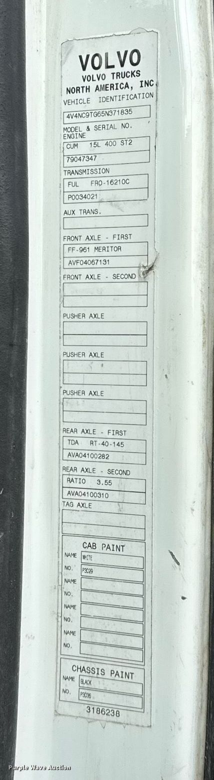 2005 Volvo VN dump truck. Miles: 673,759 on odometer, Hours: 23,249 on meter, VIN: 4V4NC9TG65N371835. Engine Cummins ISX 400ST, Serial: 79047347, Displacement: 15.0L, Cylinders: 6, Fuel type: Diesel, HP: 400, Engine brake. Transmission Eaton Fuller, Manual, Speed: 10. Chassis Axles: Tandem, Gear ratio: 3.55, Differential lock: Inter-axle, Suspension: Air Dump valves, Brakes: Air, PTO, GVWR: 50,351 lbs FAWR: 12,350 lbs. Interior AC, Heat, Heated mirrors, Power windows, Cruise control. Features Dump bed Houston Fab Truck Rigging, Capacity: 14 cu.yd., 13' 6" L x 96" W, Side height: 45", Side board height: 8", Bed type: Steel, Roll tarp, Ram: Single, End gate: Air operated. Tires Size: 295/75R22.5. Notes Windshield chipped or cracked. Texas title. Title distribution may be delayed up to 14 days from verification of funds. Stark Contracting LLC. San Antonio, TX 78263