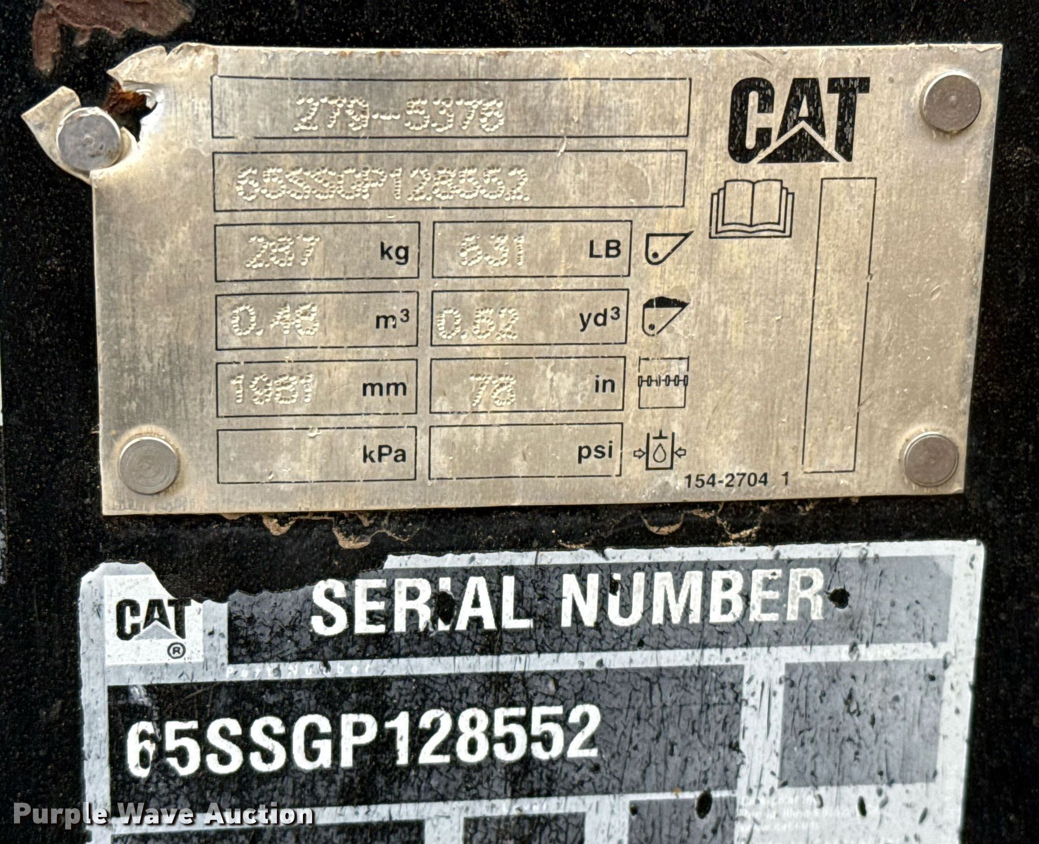 2018 Caterpillar 299D2 XHP tracked skid steer loader. Hours: 1,902.7 on meter, Serial: CAT0299DJDX203344. Engine Caterpillar, Cylinders: 4, Fuel type: Diesel. Transmission Hydrostatic, Two speed travel. Operators station Enclosed cab, AC, Heat, Backup camera, Bucket control: Hand, Electronic Monitoring System panel. Features Auxiliary hydraulics, Auxiliary electrical outlet, Quick coupler: Manual, Bucket Caterpillar 279-5376, Width: 80", Low profile. Tracks Width: 18". GTI Energy Services. Balch Springs, TX 75180
