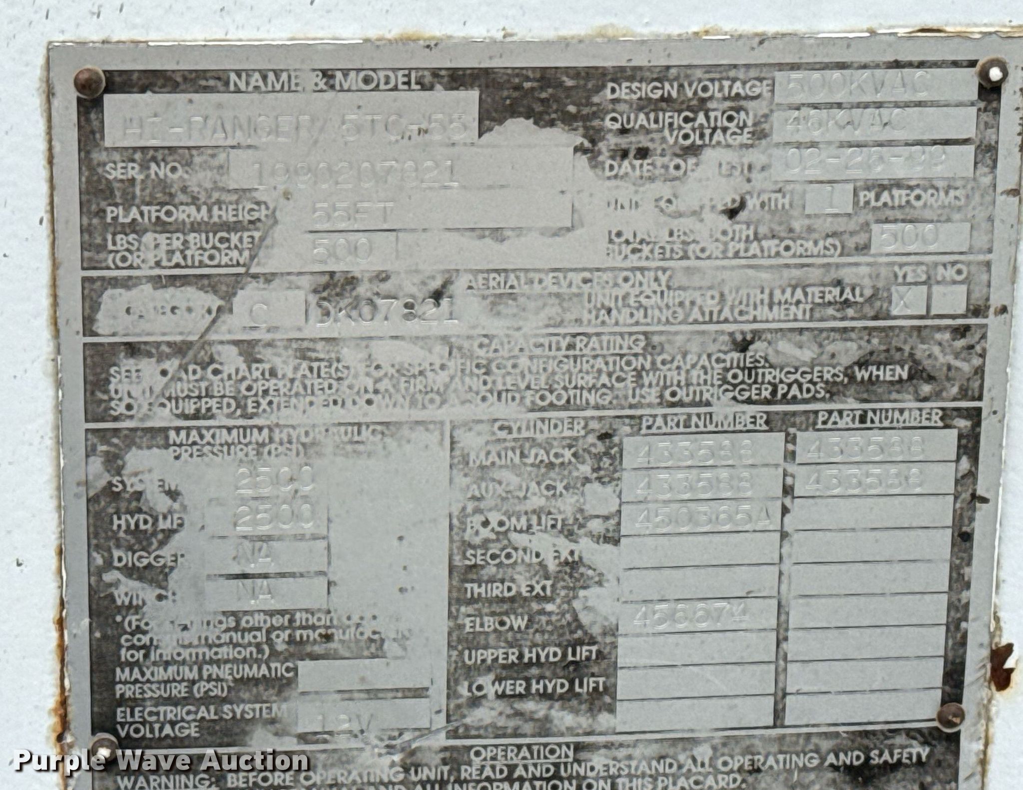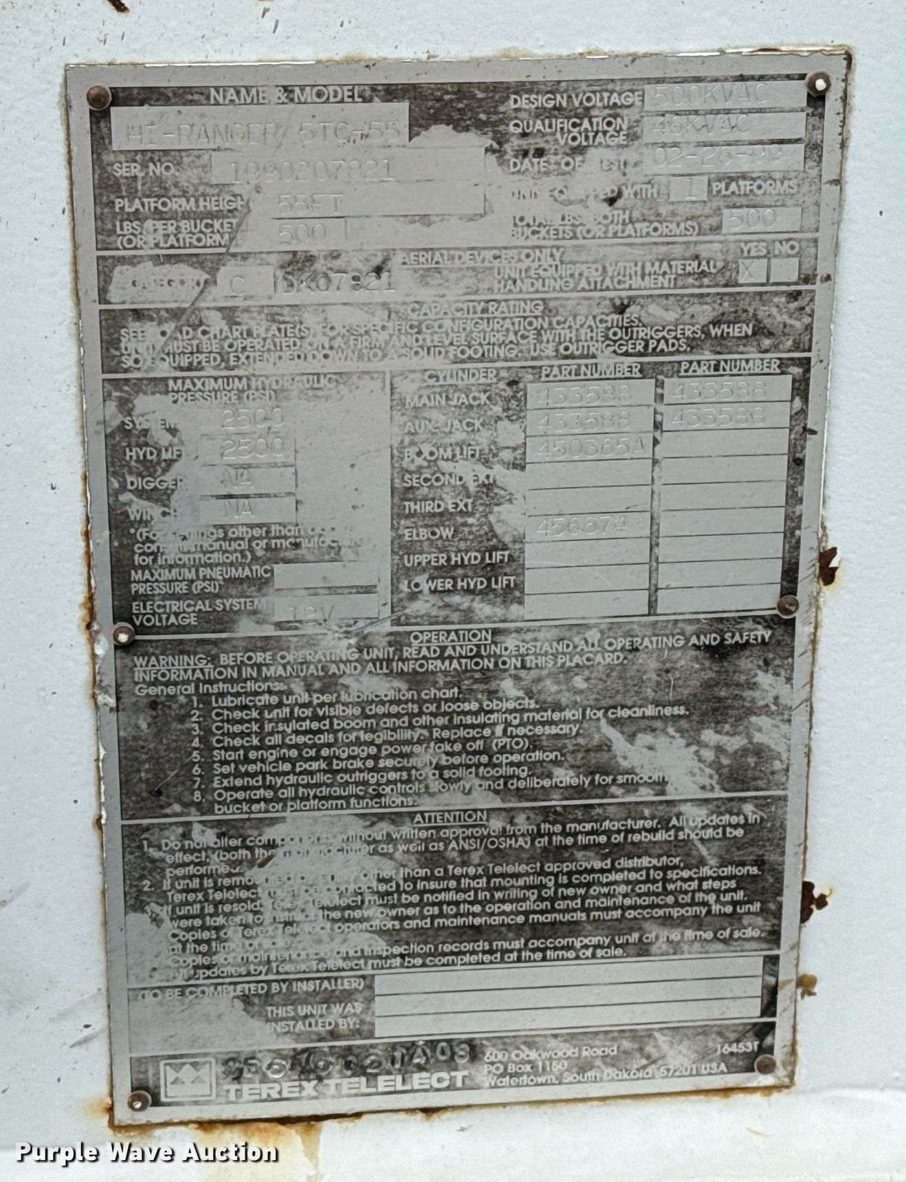 1999 Freightliner FL80 bucket truck. Miles: 40,647 on odometer, Hours: 3,072 on meter, VIN: 1FV6JLBA8XHB83116. Engine Cummins ISC 250, Serial: 45816809, Displacement: 8.3L, Cylinders: 6, Fuel type: Diesel, HP: 250. Transmission Automatic. Chassis Axles: Single, Suspension: Spring, Brakes: Air, PTO, Wet kit, GVWR: 33,000 lbs. Interior AC, Heat, Cruise control, Auxiliary controls. Features Bed The Commercial Body Corp, 16' L x 94" W, Boom Terex Hi-Ranger 5TC-55, Serial: 1990207021, Mast height: 55', Maximum lift capacity: 500 lbs, Boom type: Articulating, Insulated, Man basket, Boom controls Ground, Platform/ basket, Material handler. Tires Front: 315/80R22.5, Rear: 11R22.5. View repairs. Texas title. Title distribution may be delayed up to 14 days from verification of funds. New Braunfels, TX 78132