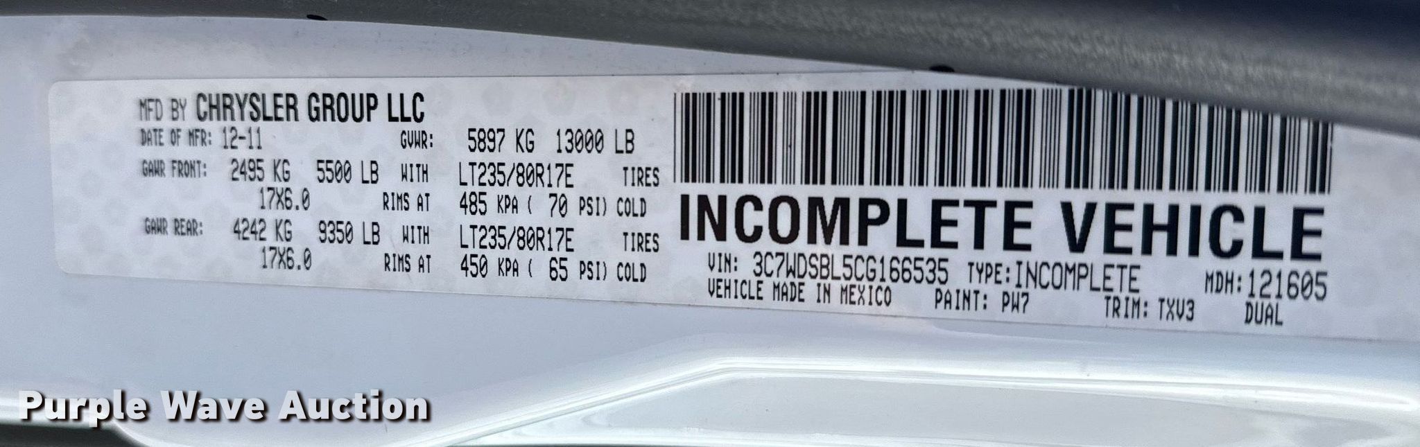 - VIN: 3C7WDSBL5CG166535