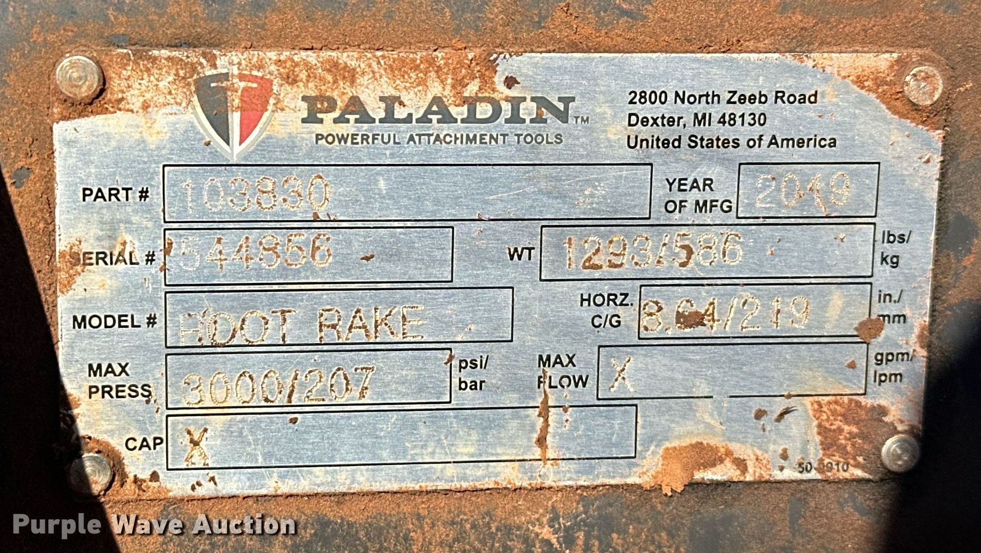 Purple Wave is selling a used Skid Steer Attach. in Oklahoma. This item is a 2019 Paladin Root Rake skid steer root rake grapple with the following: Serial: 544856, Width: 84"