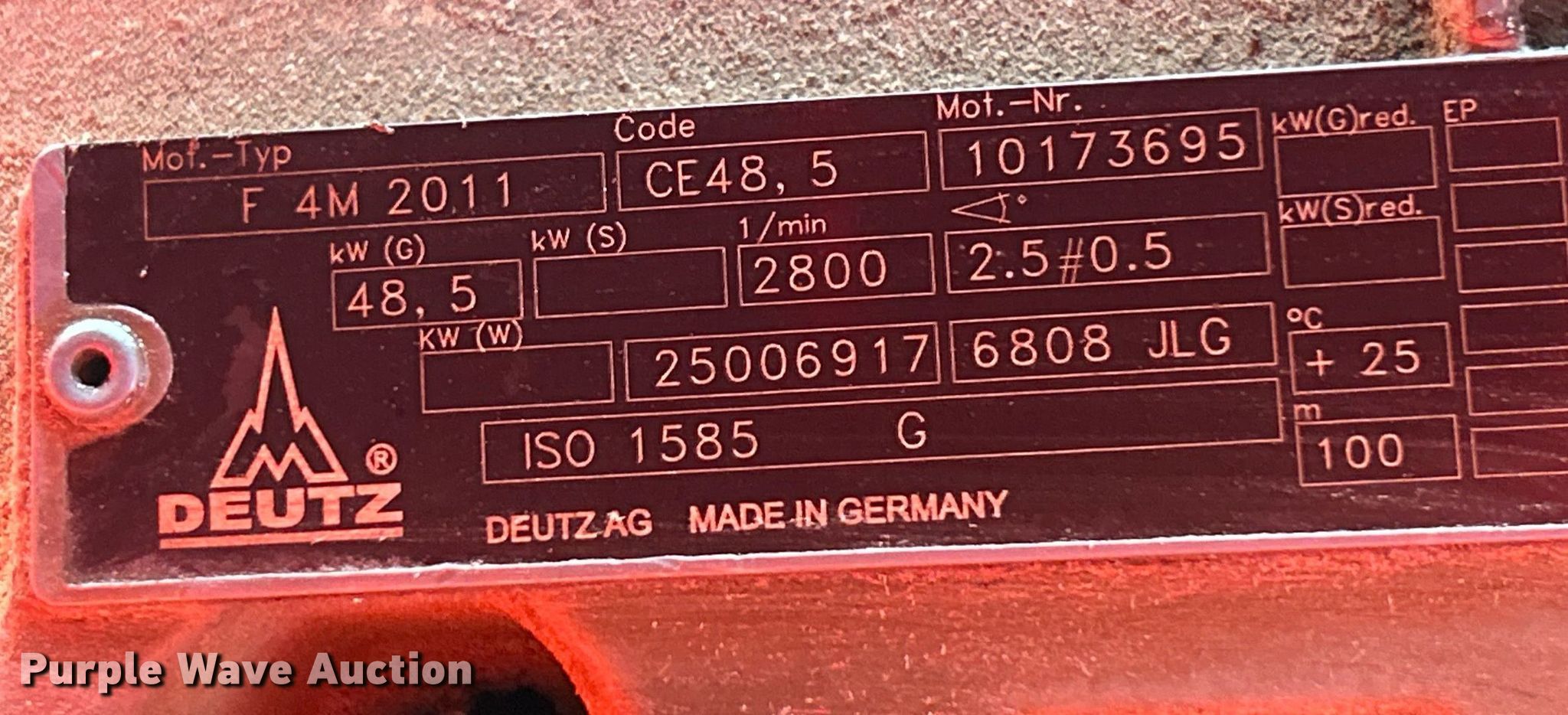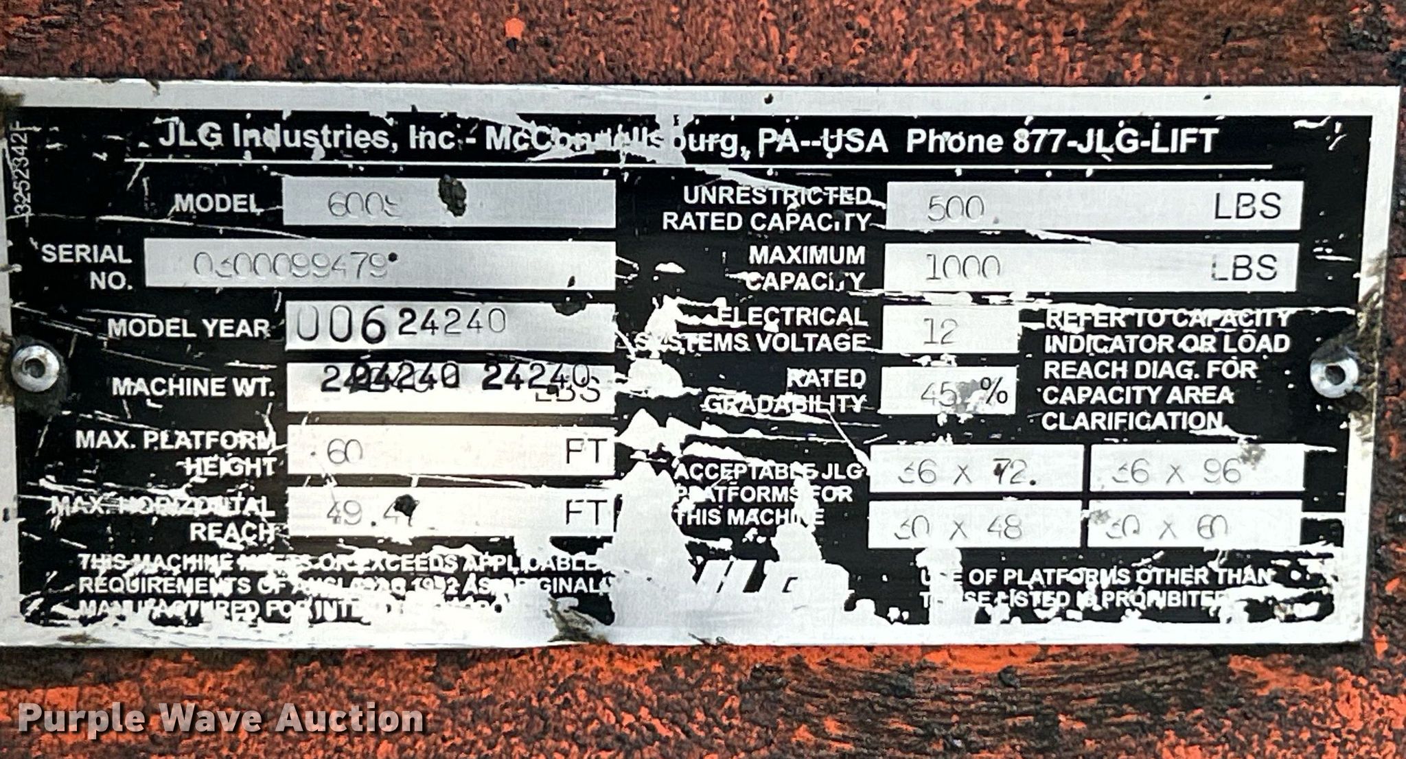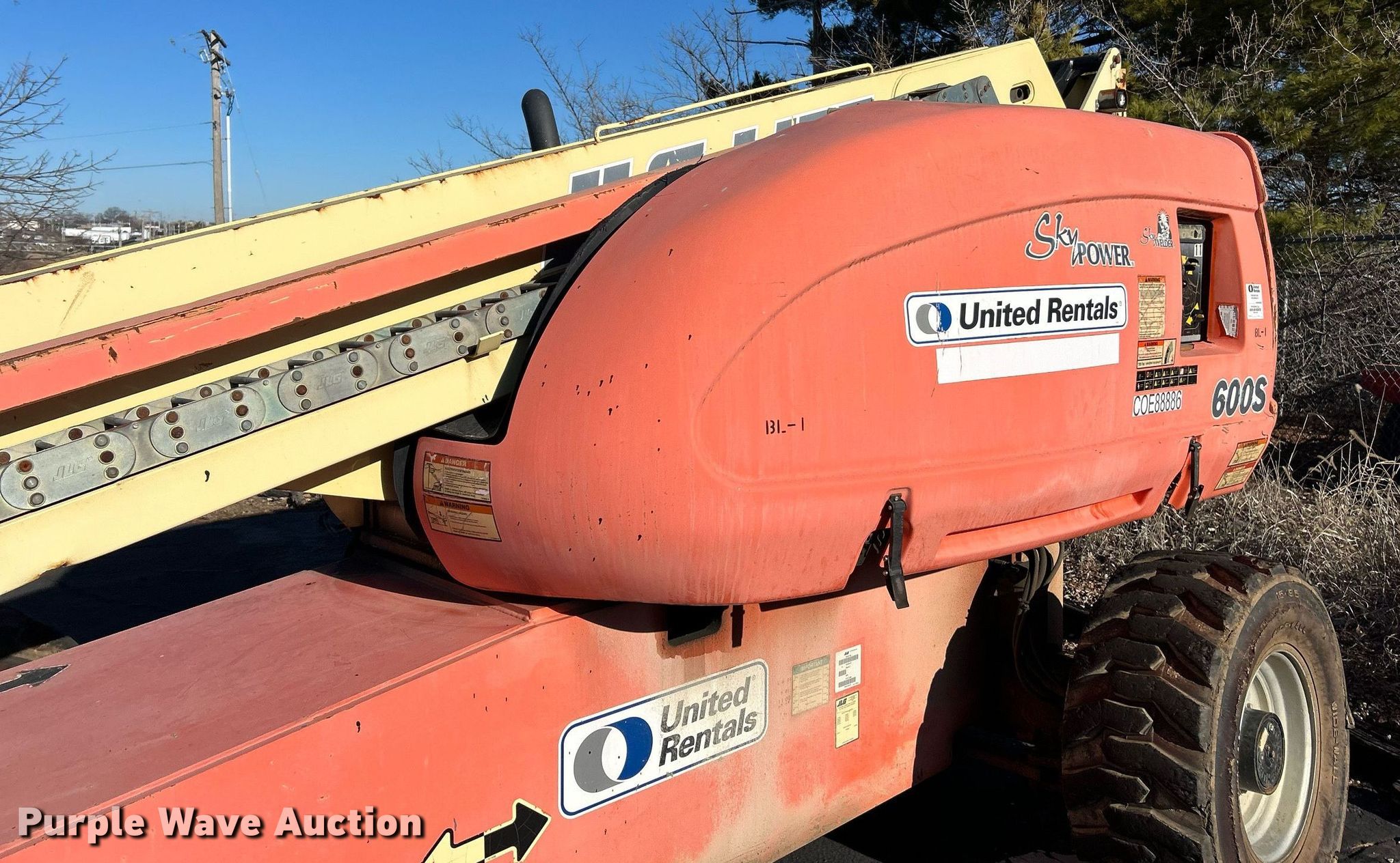 2006 JLG 600S boom lift. Hours: 976 on meter, Serial: 0300099479. Engine Deutz F 4M 2011, Displacement: 3.109L, Cylinders: 4, Fuel type: Diesel, HP: 65, kW: 48. Chassis Four wheel drive. Features Rough terrain, Boom type: Telescopic, Maximum lift capacity: 1,000 lbs, Maximum reach length: 49', Maximum lift height: 60', Hydraulic leveling, Platform: 36" L x 96" W, AC power outlet, Air outlet, Controls: Platform, Ground, Platform rotation: Hydraulic. Tires Tire size: 15-19.5. Big Boy's Steel Erection. Hazelwood, MO 63042