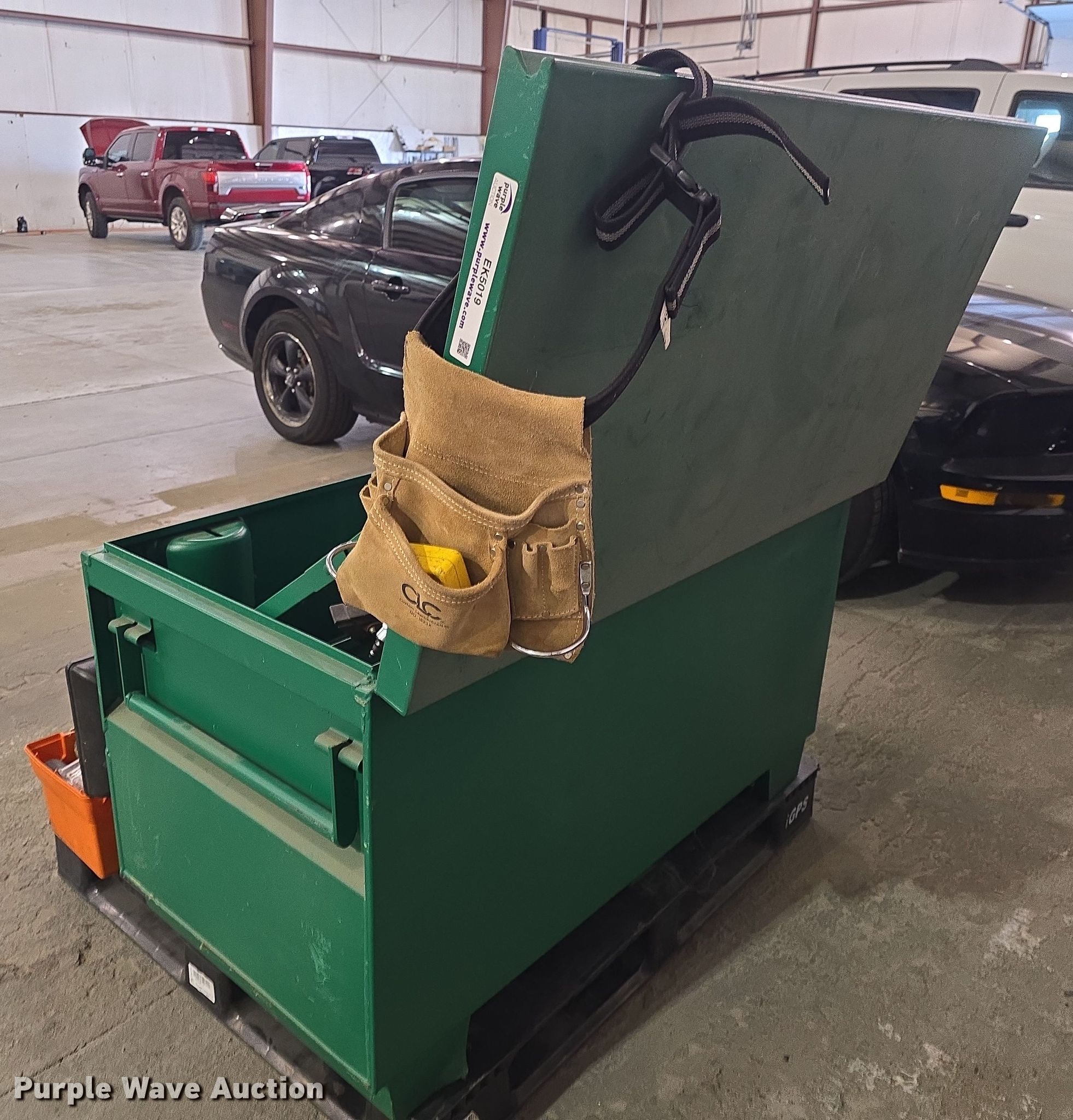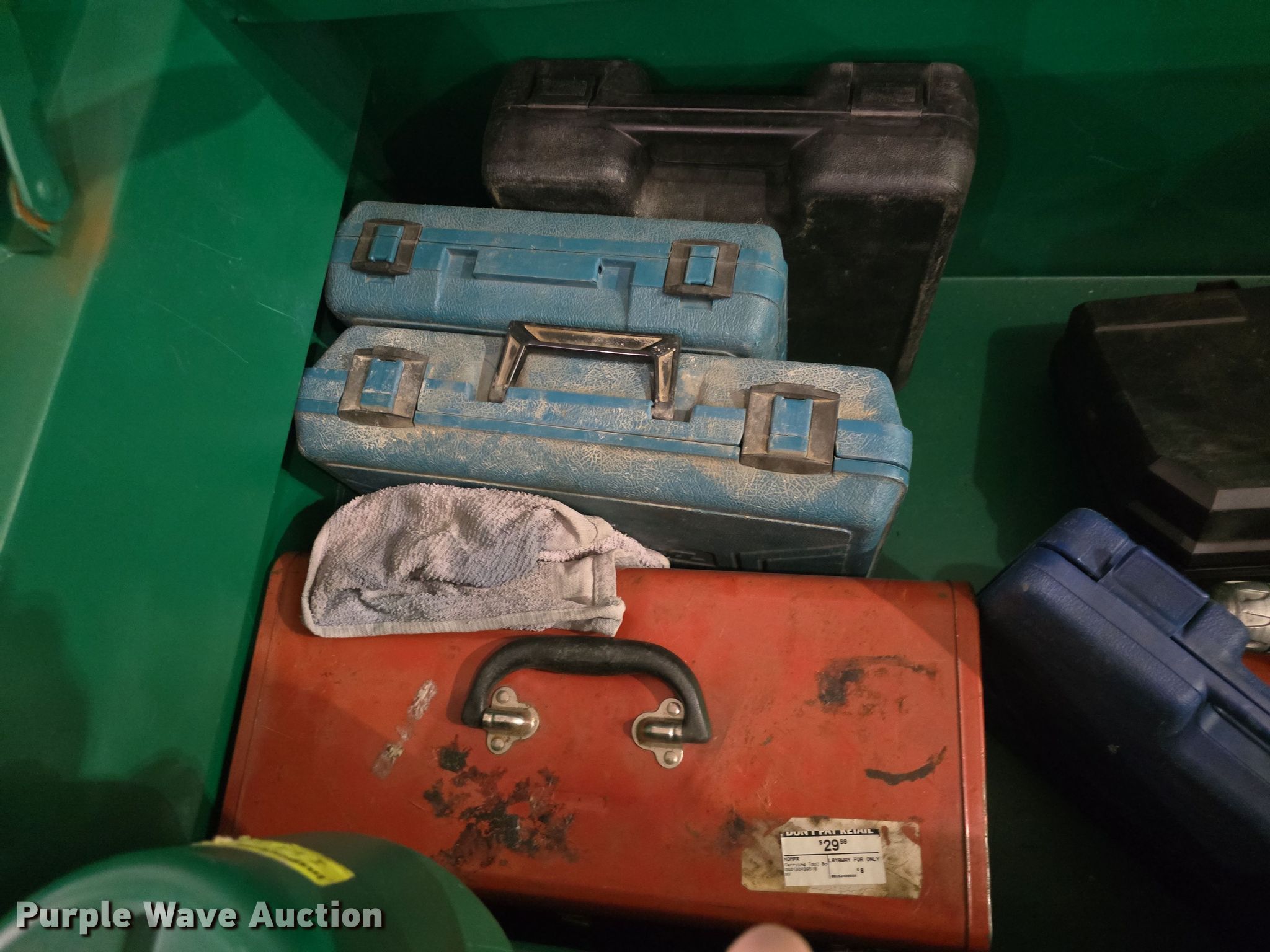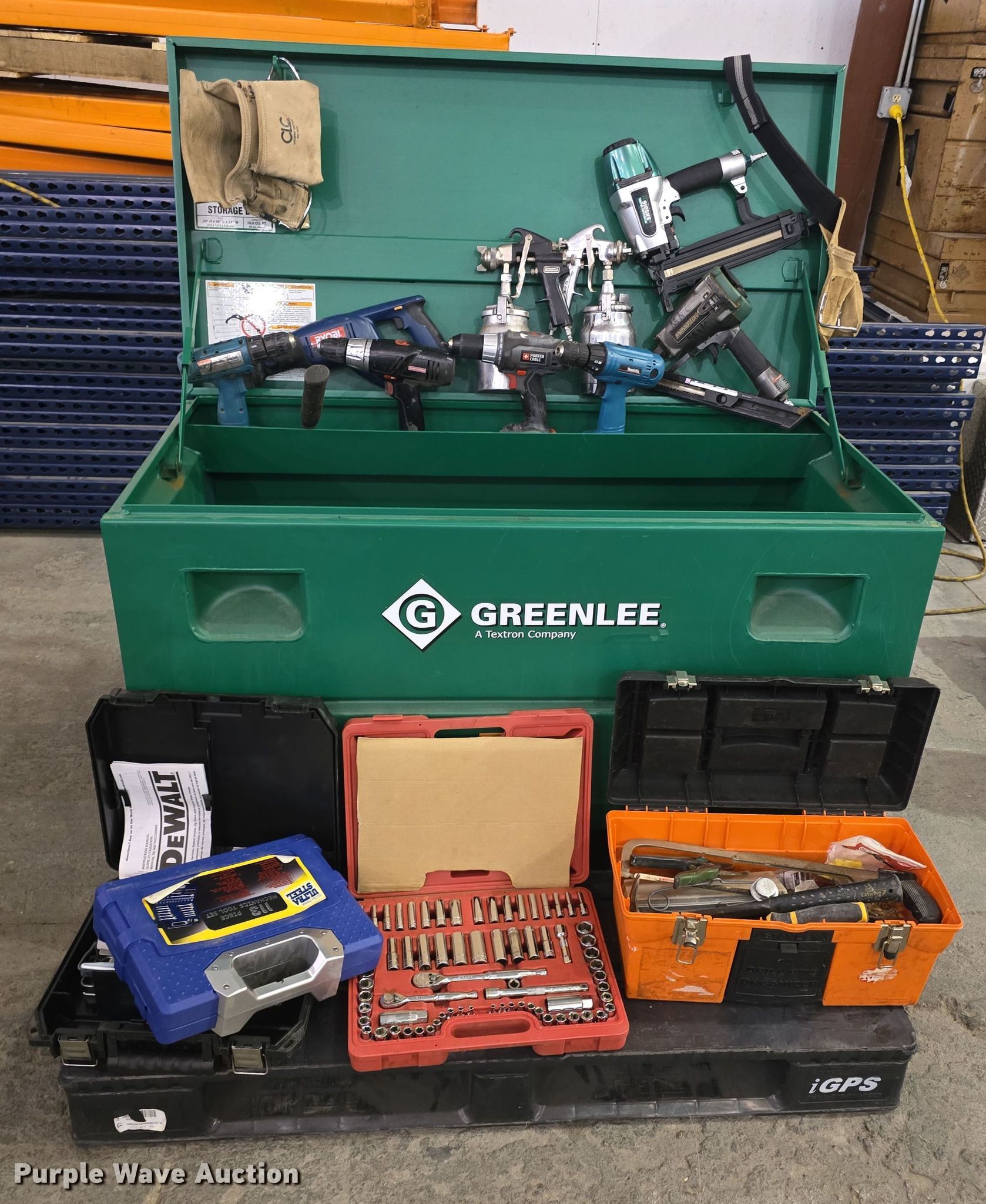 Purple Wave is selling a used Tools in Kansas. This item is a Tools with the following: Sprayer, Nail guns, Drills, (2) jump packs, Greenlee job box, 4' x 2' x 2', Sockets and more