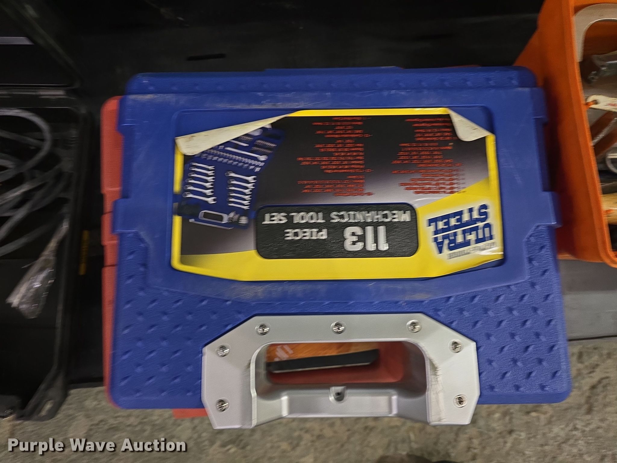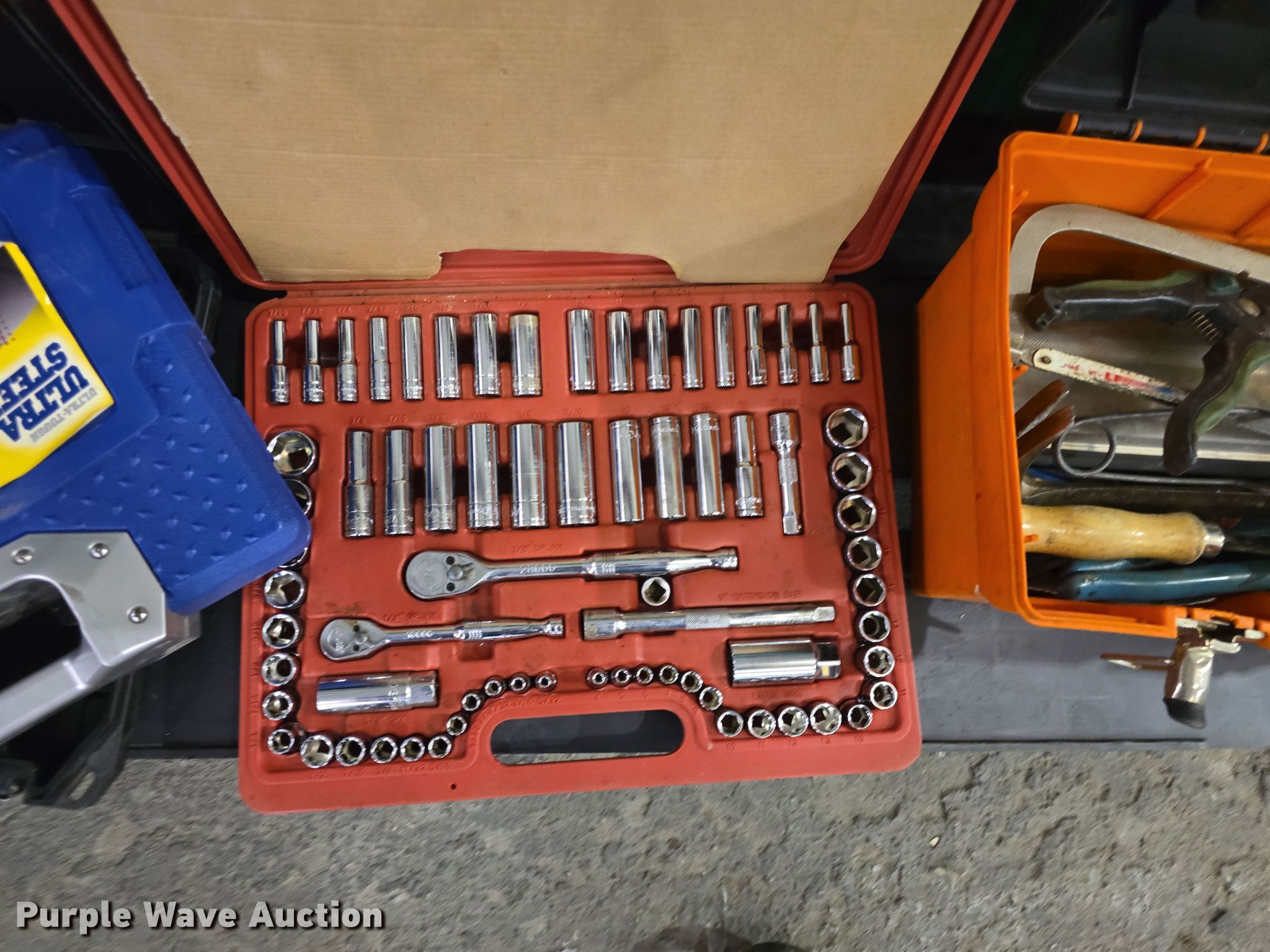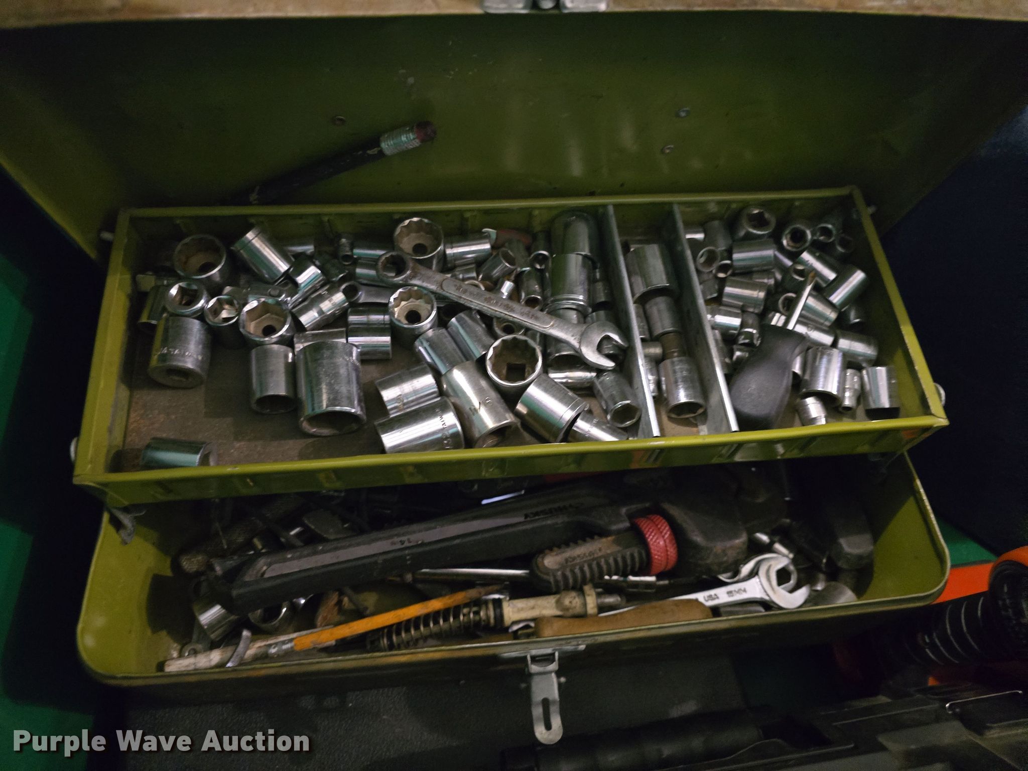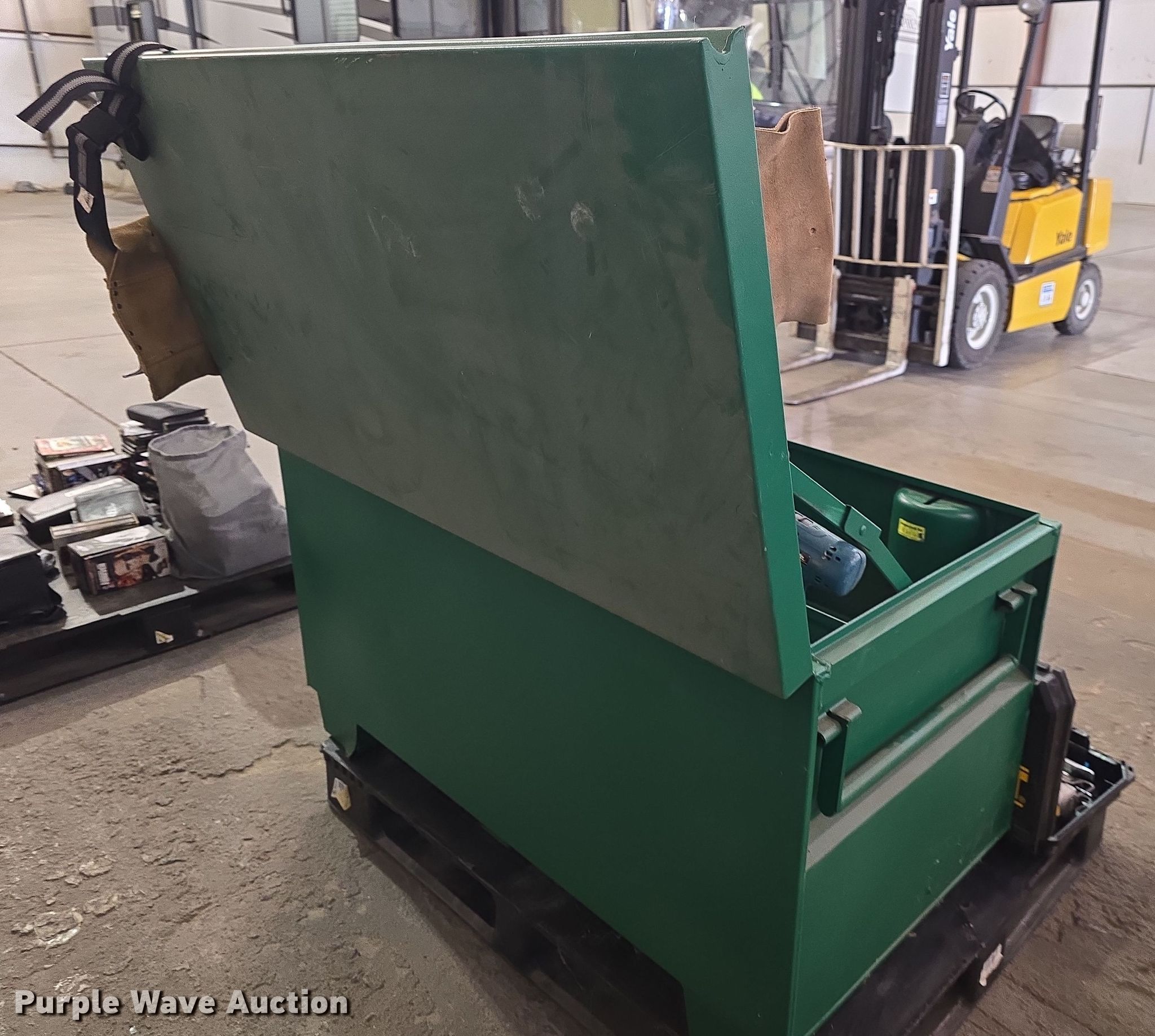Purple Wave is selling a used Tools in Kansas. This item is a Tools with the following: Sprayer, Nail guns, Drills, (2) jump packs, Greenlee job box, 4' x 2' x 2', Sockets and more